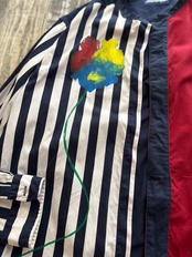 古着をリメイクしたボディに沖縄にちなんだ物を手彫りの版画で一つ一つプリントされてます。