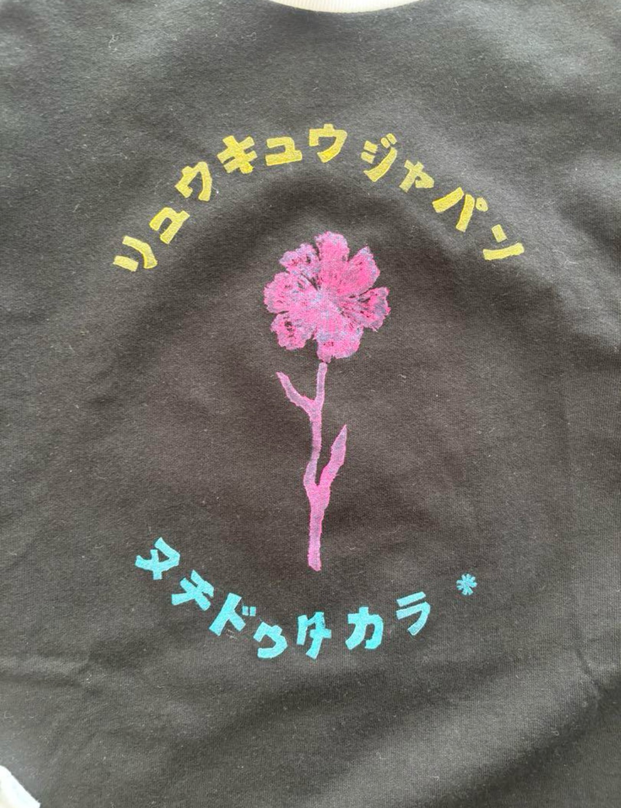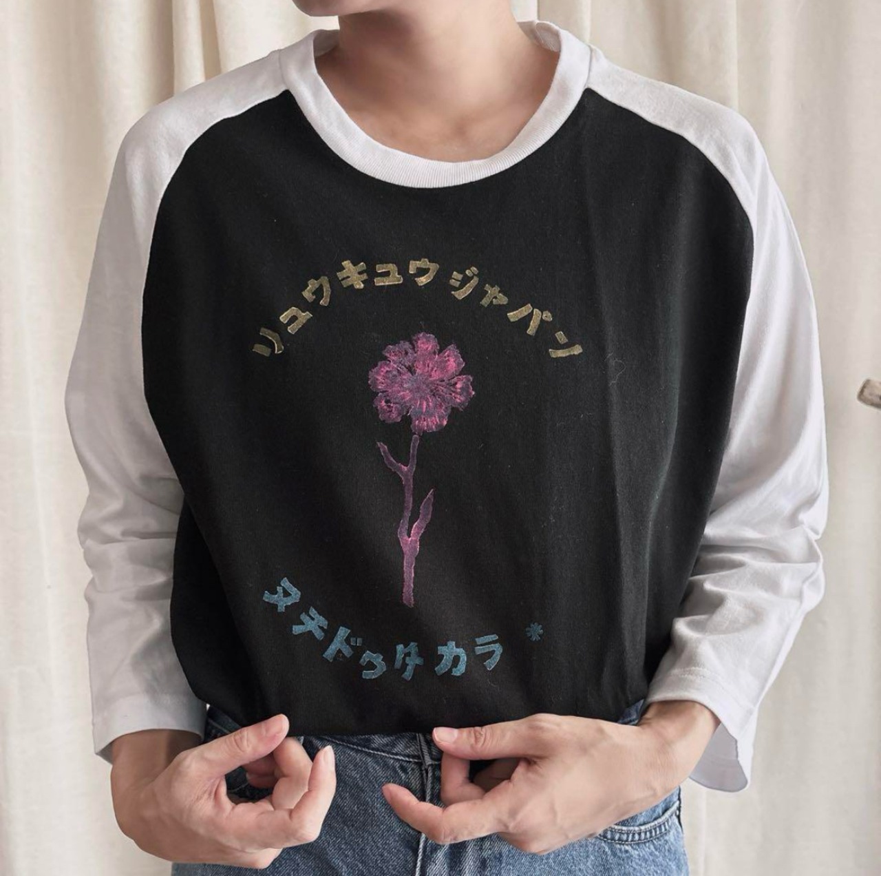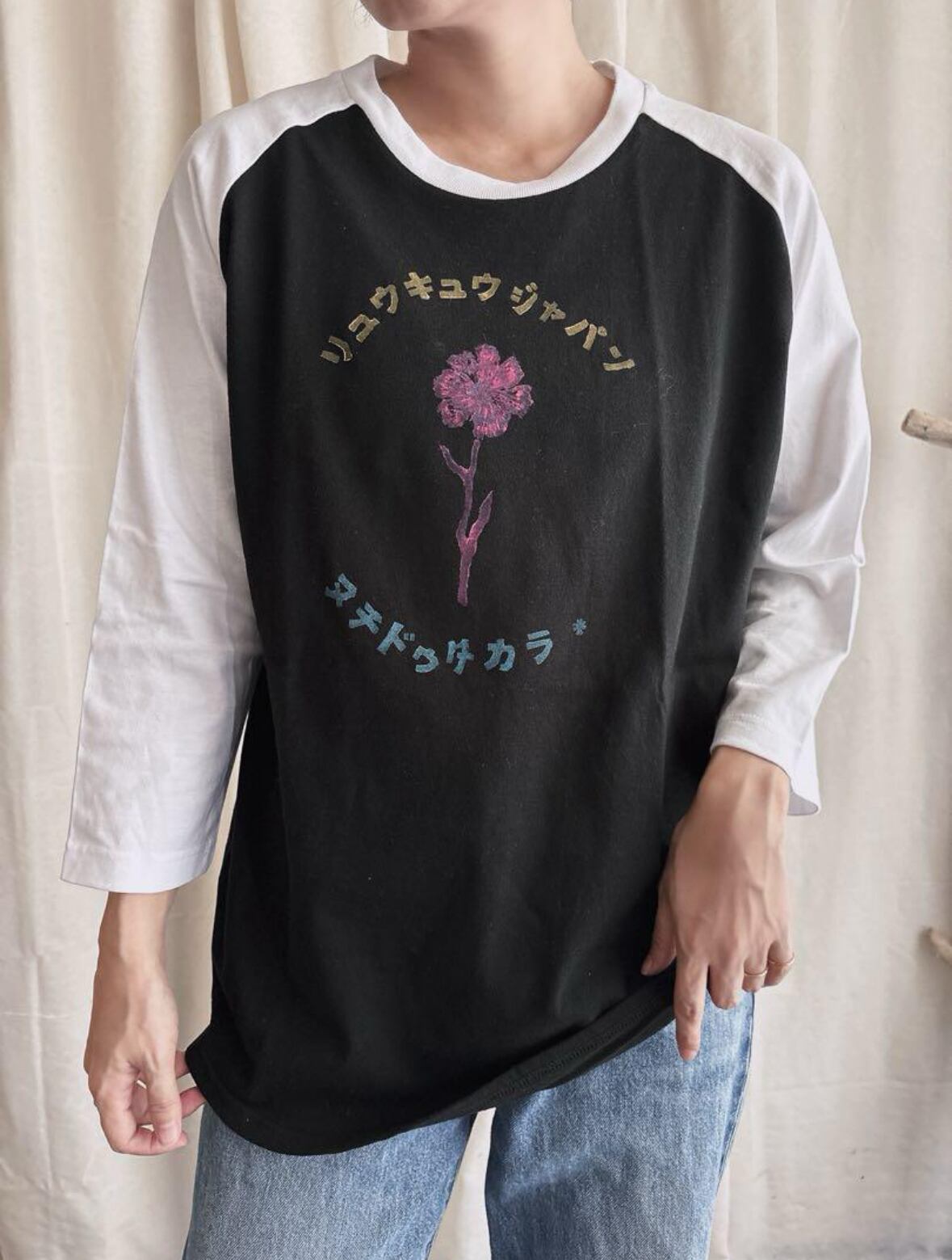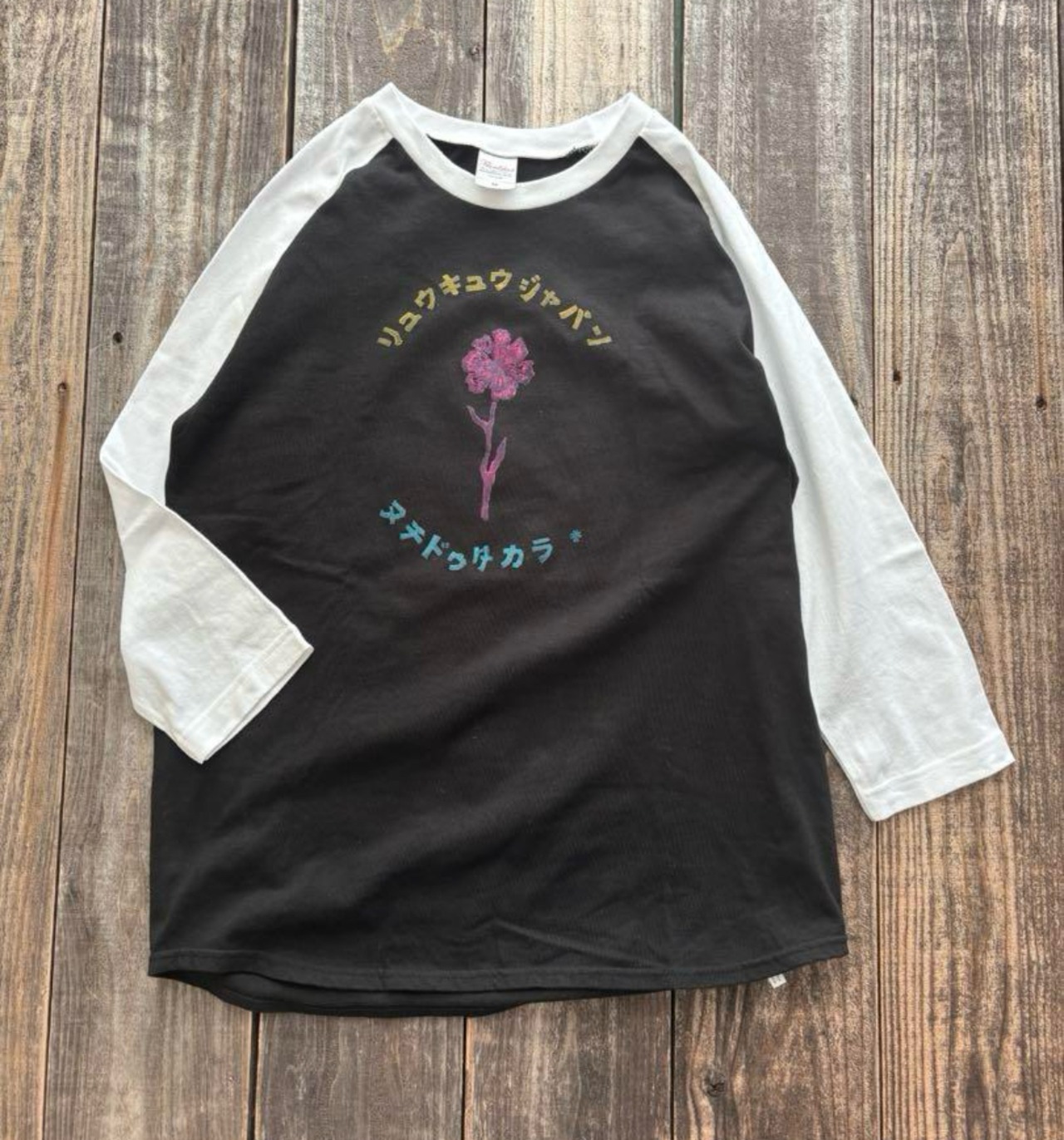 ラグランシャツに作家手彫りの版画でプリントされてる野花ヴィンテージテイストデザイン⭐︎