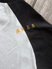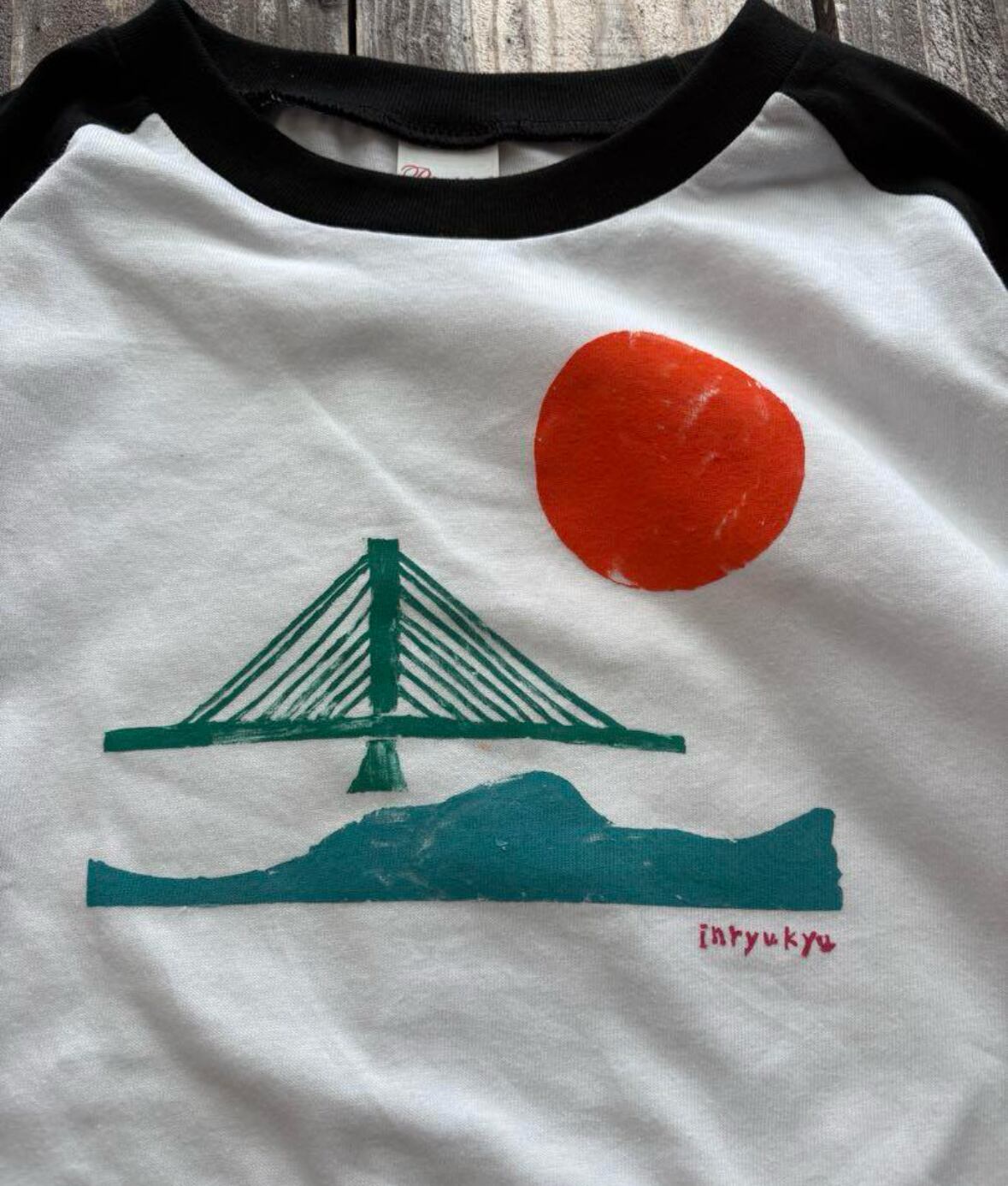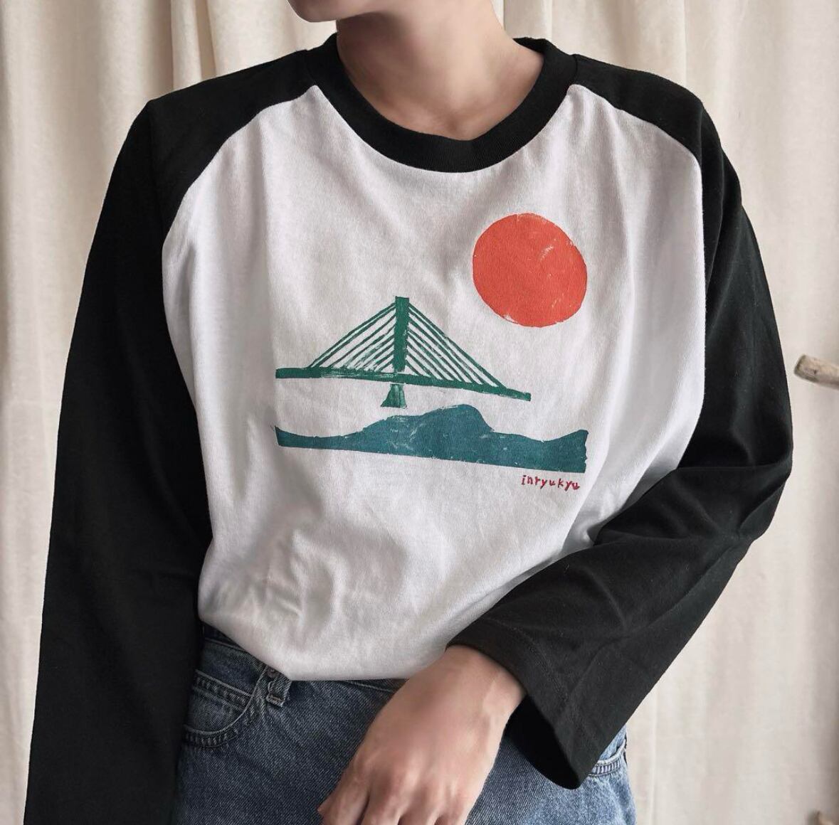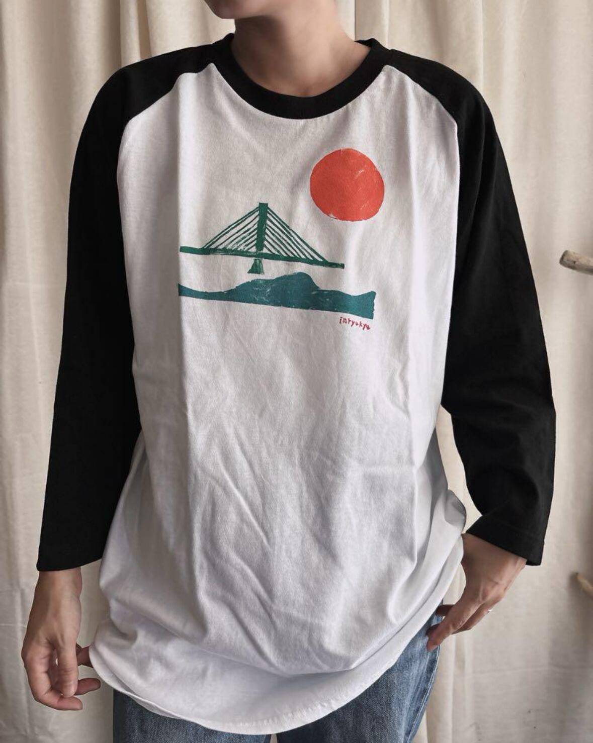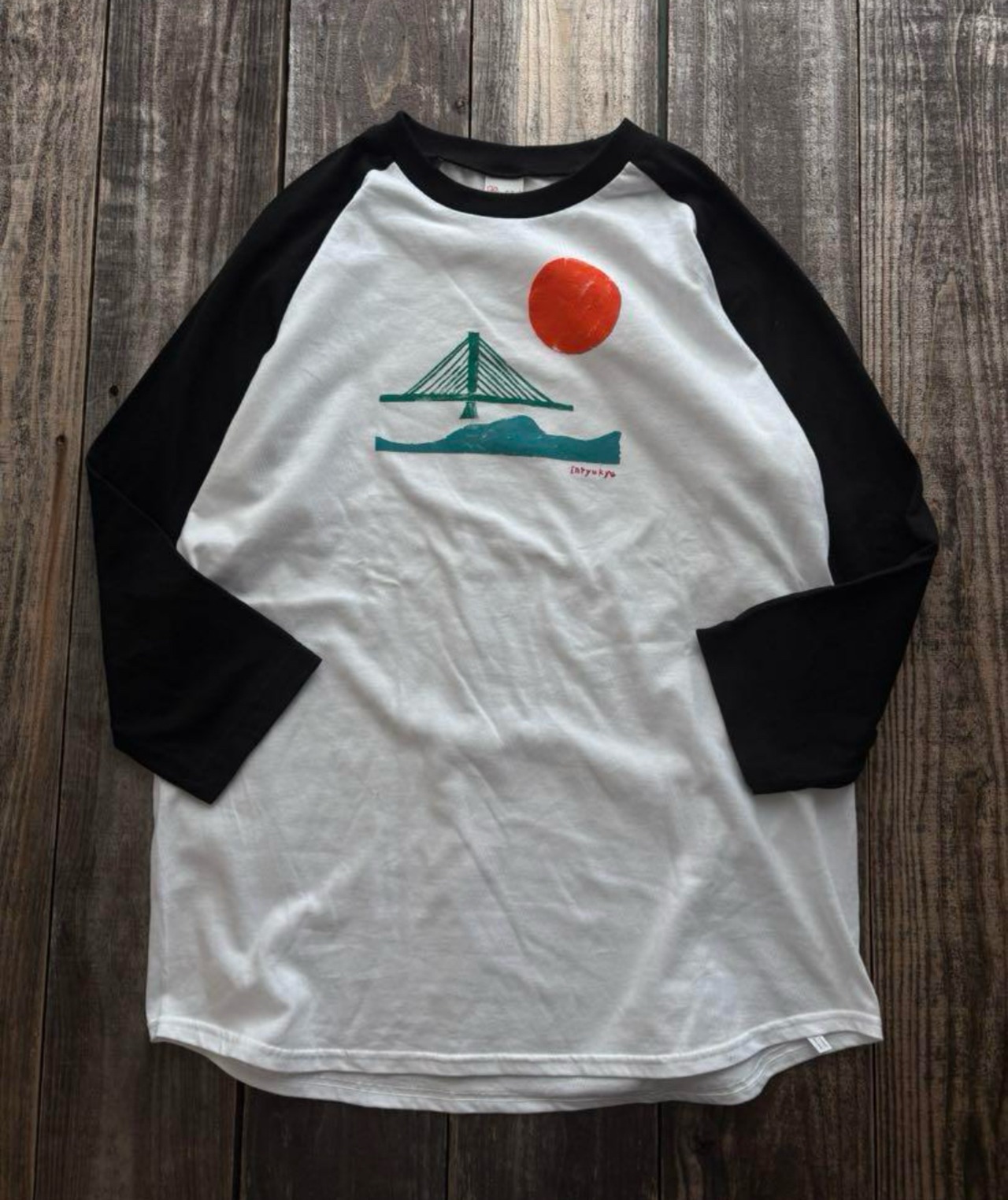 ラグランシャツに作家手彫りの版画でプリントされてる海中道路のヴィンテージテイストデザイン⭐︎