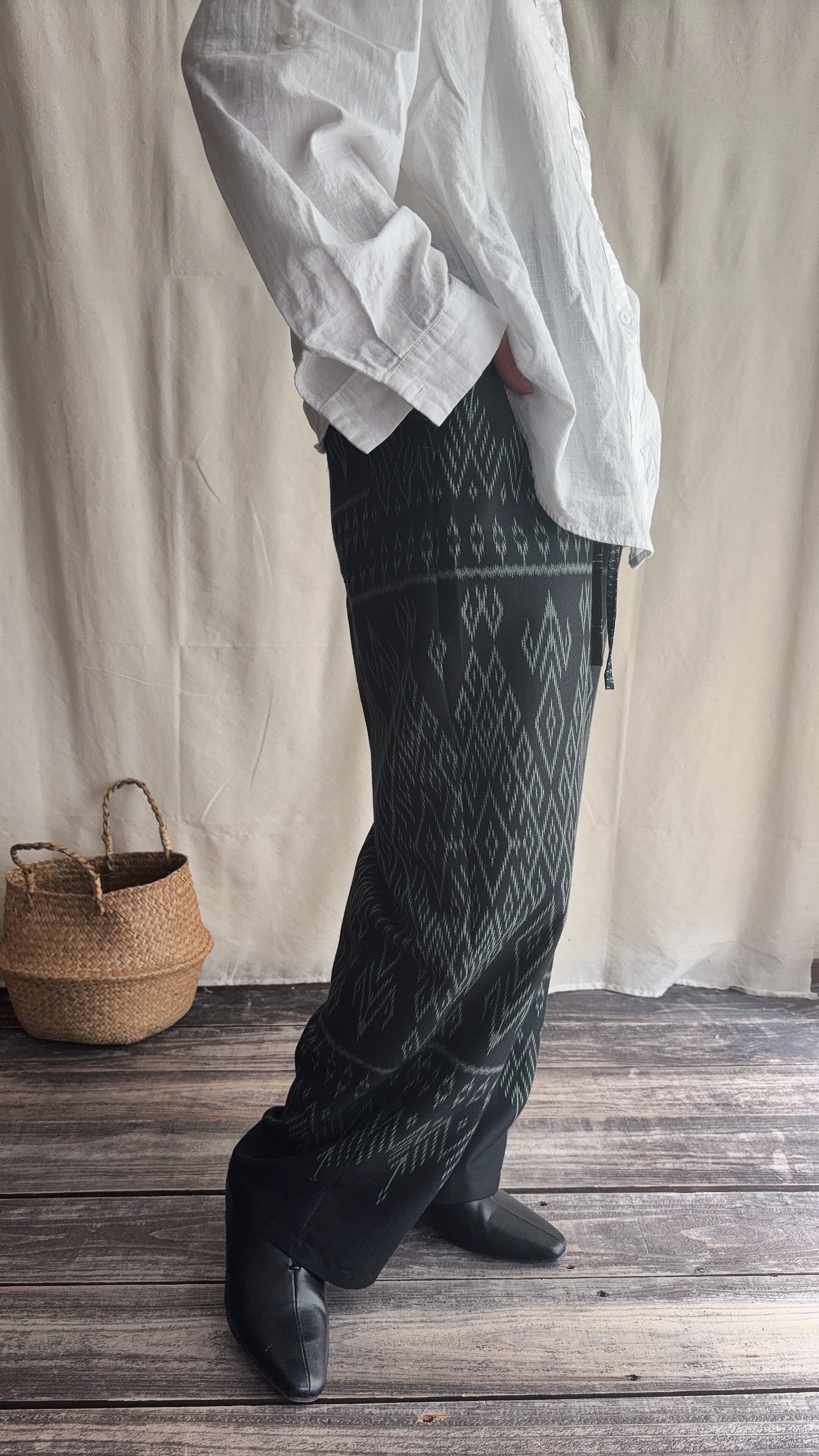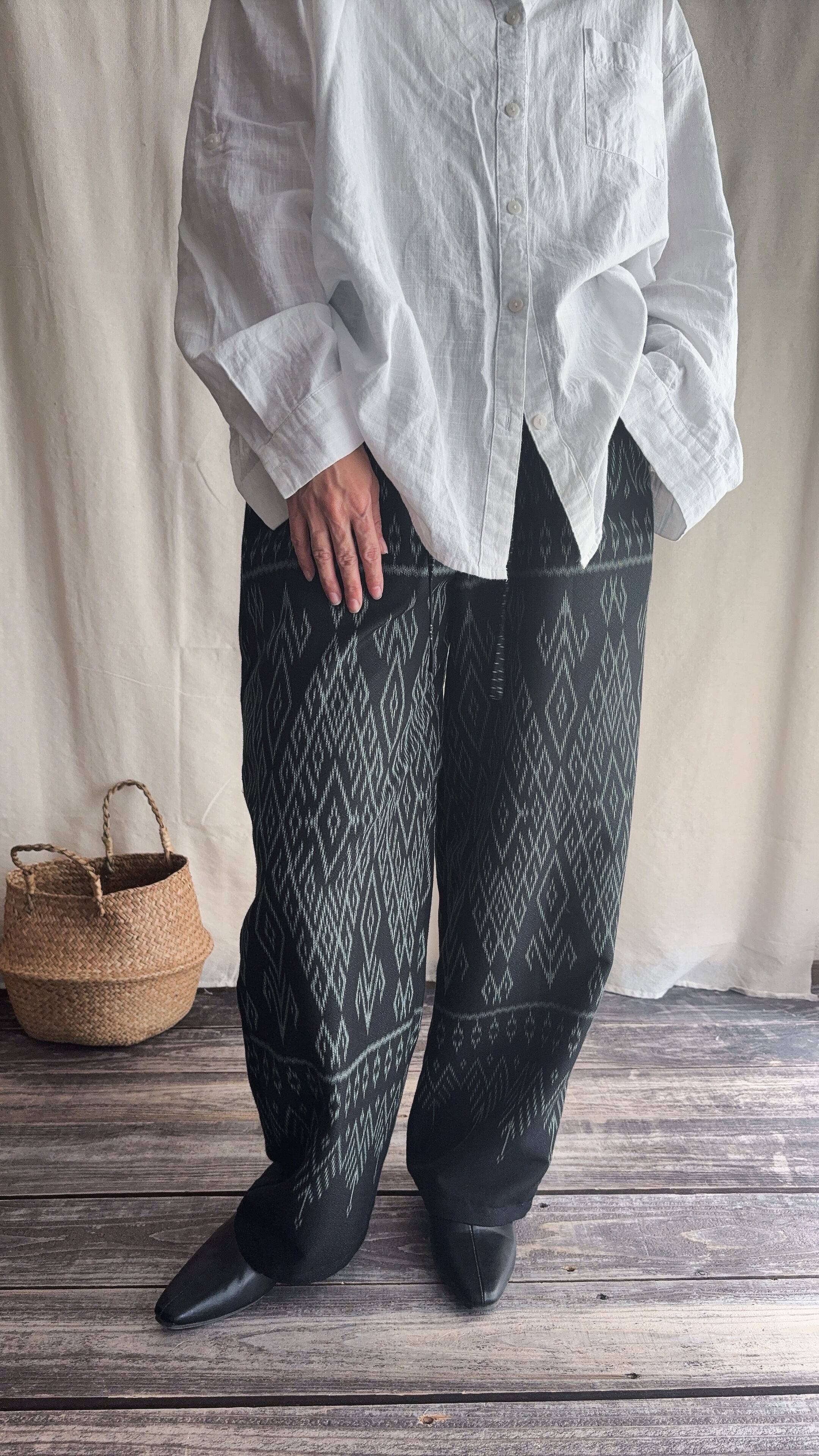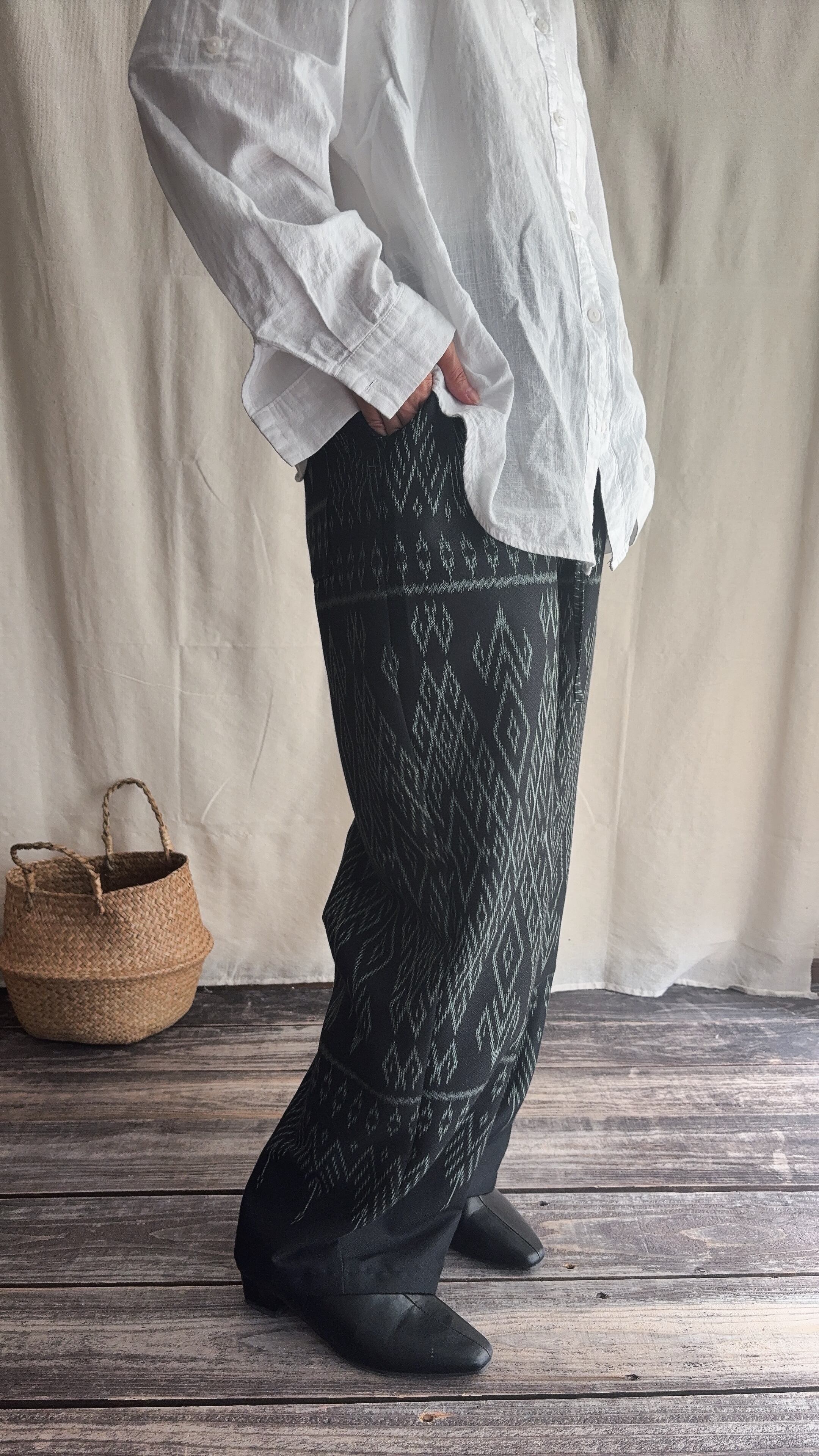 手織りのシルクコットン生地をパンツに仕立てられてます。