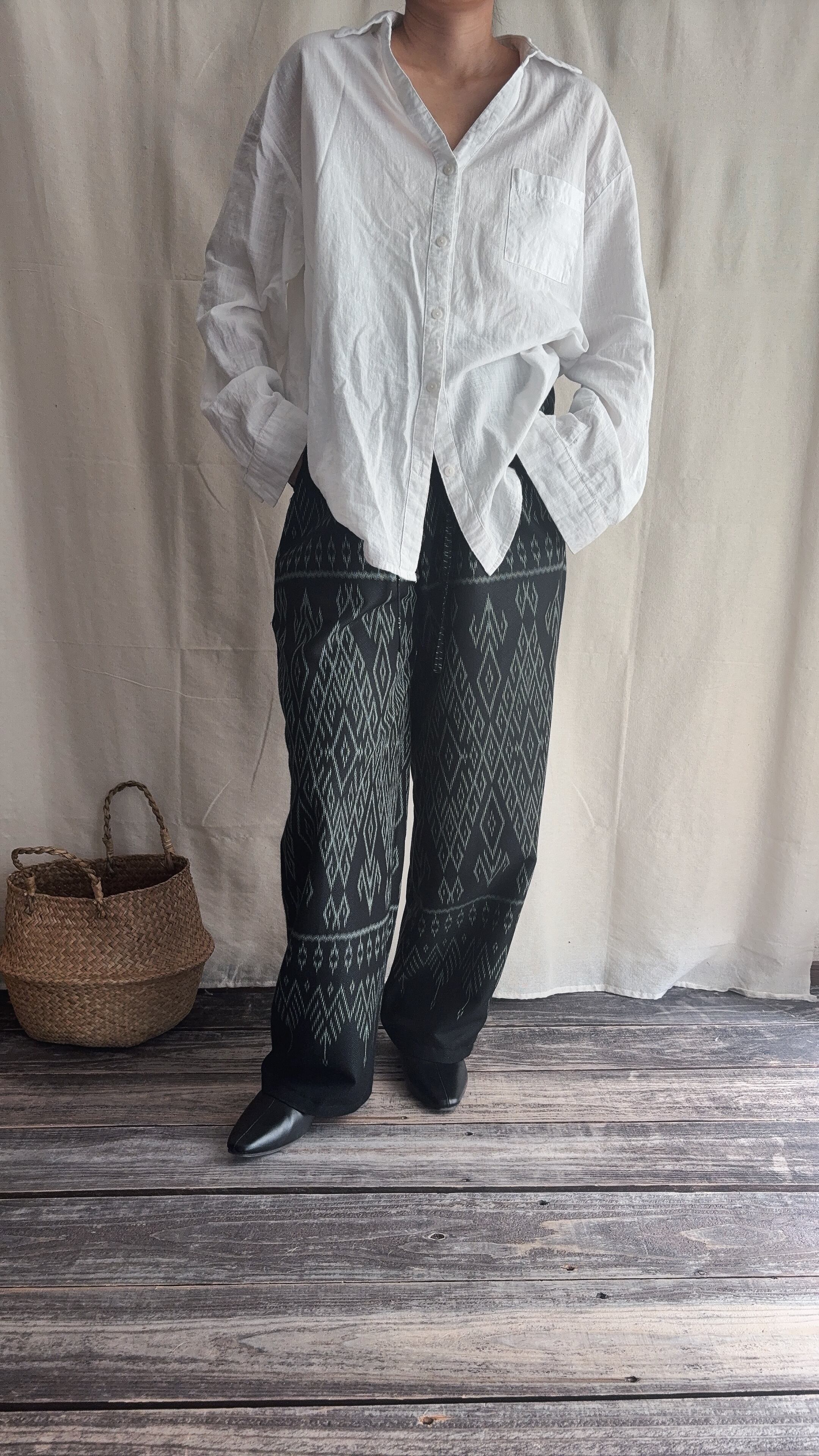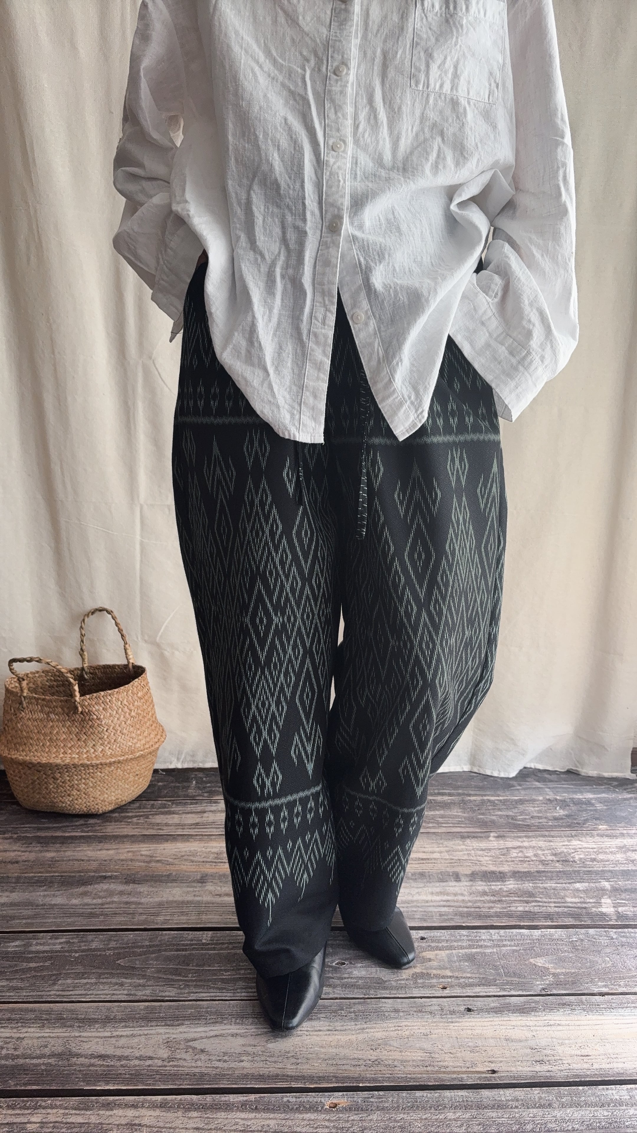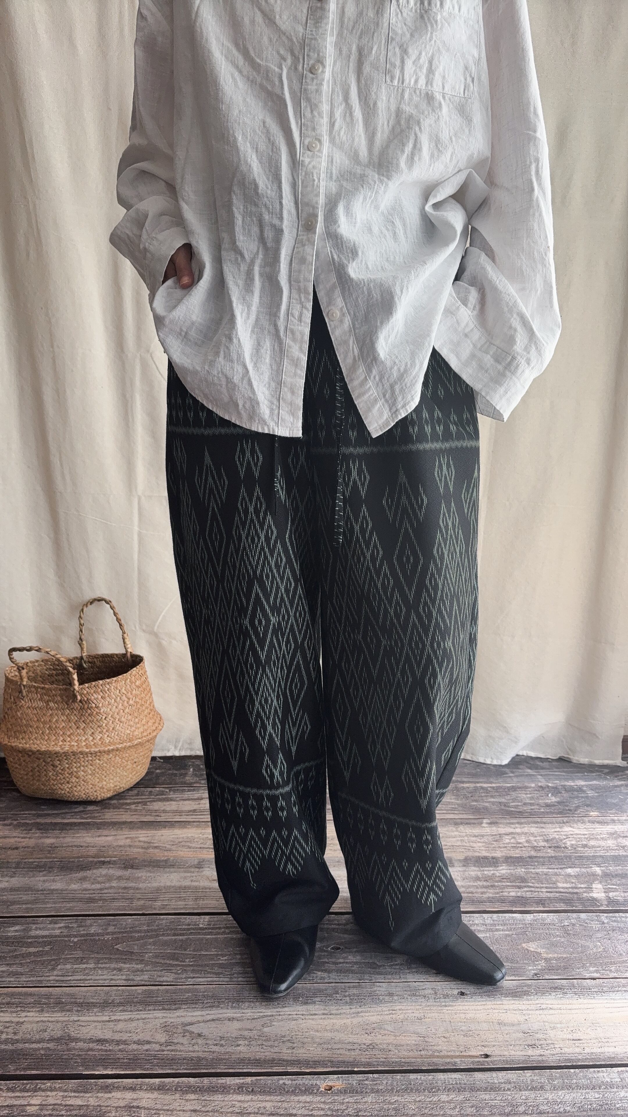 手織りのシルクコットン生地をパンツに仕立てられてます。