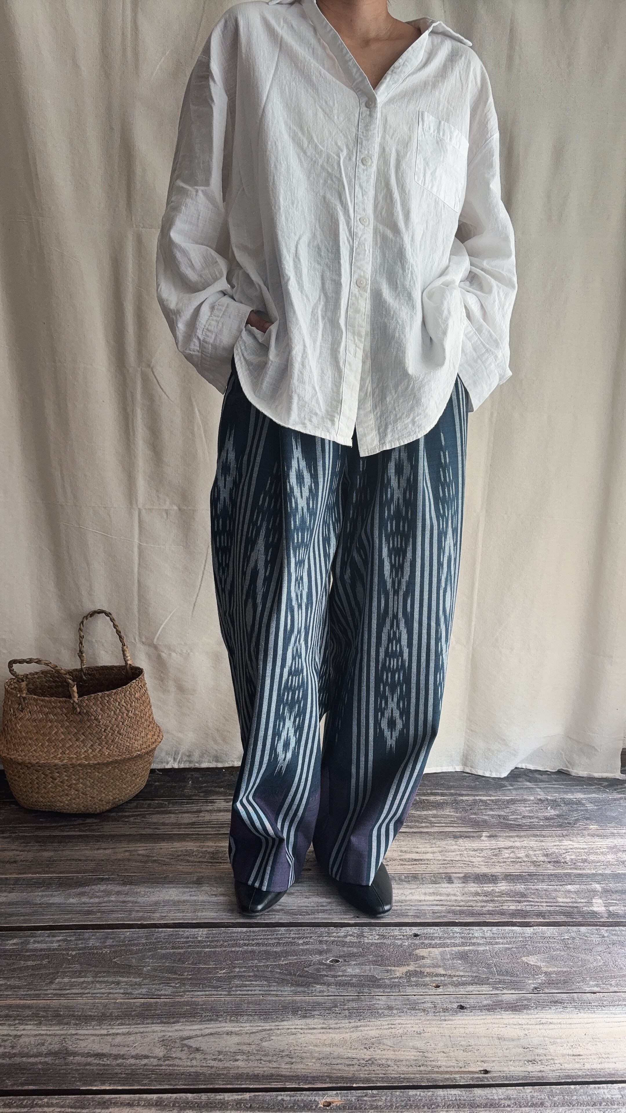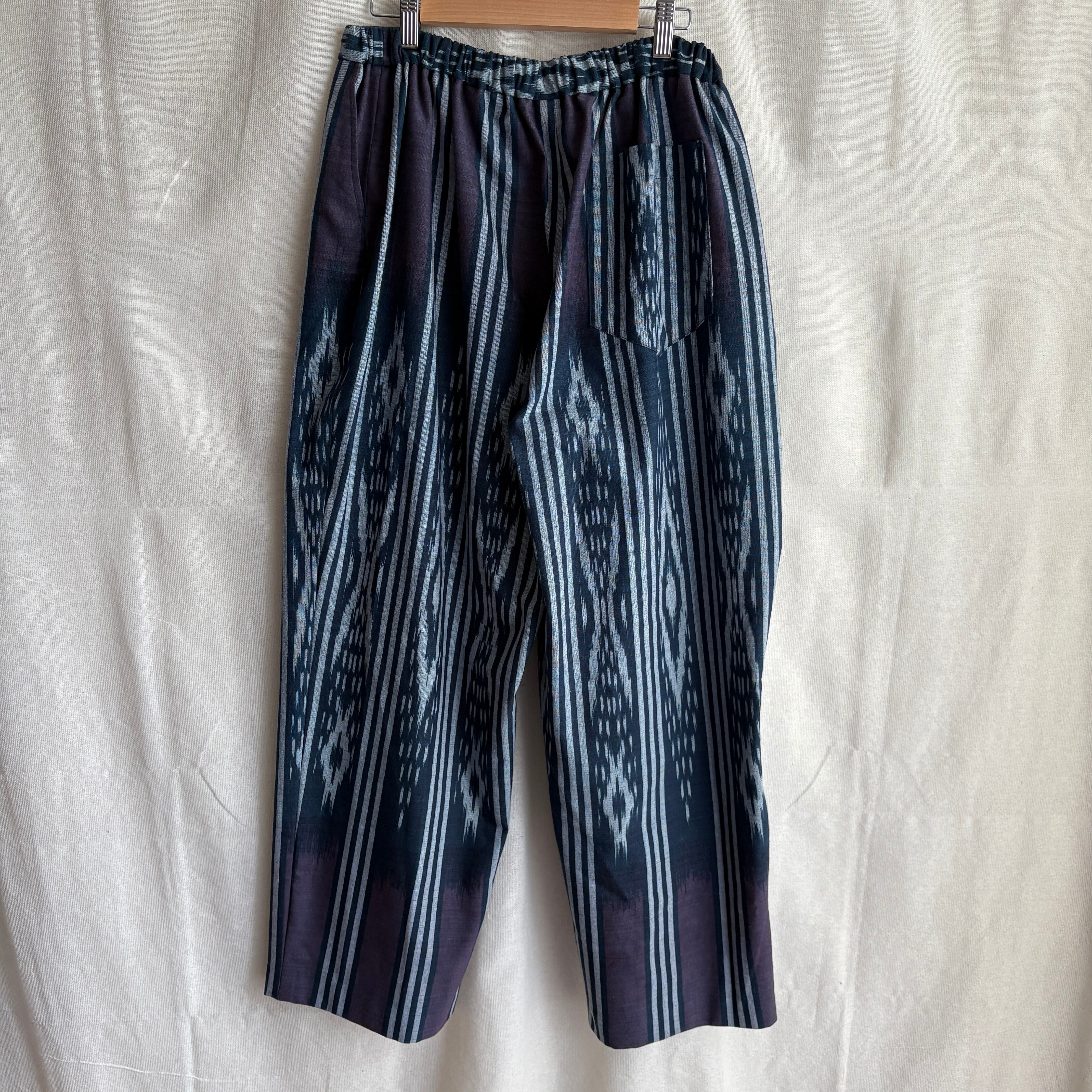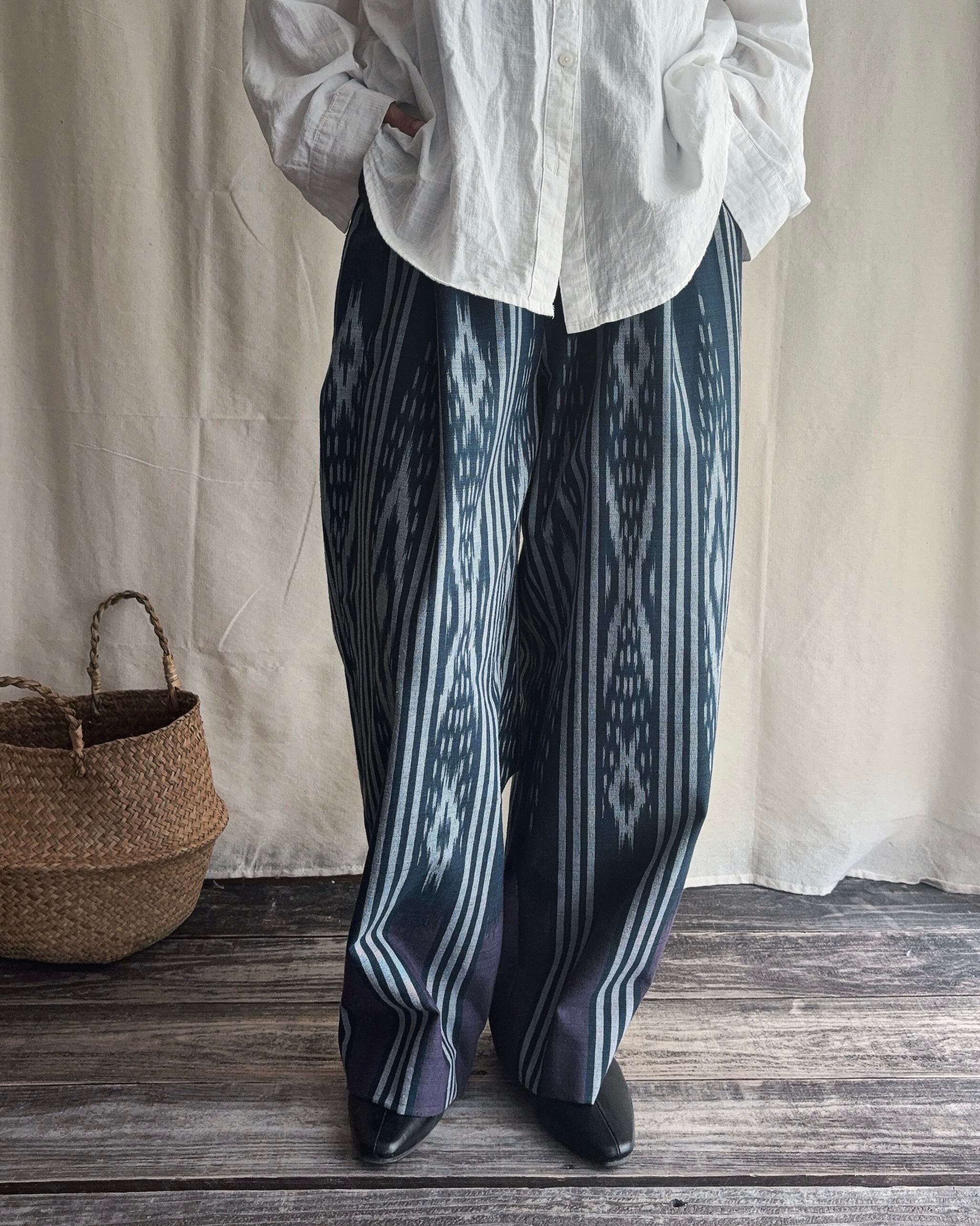 手織りのシルクコットン生地をパンツに仕立てられてます。