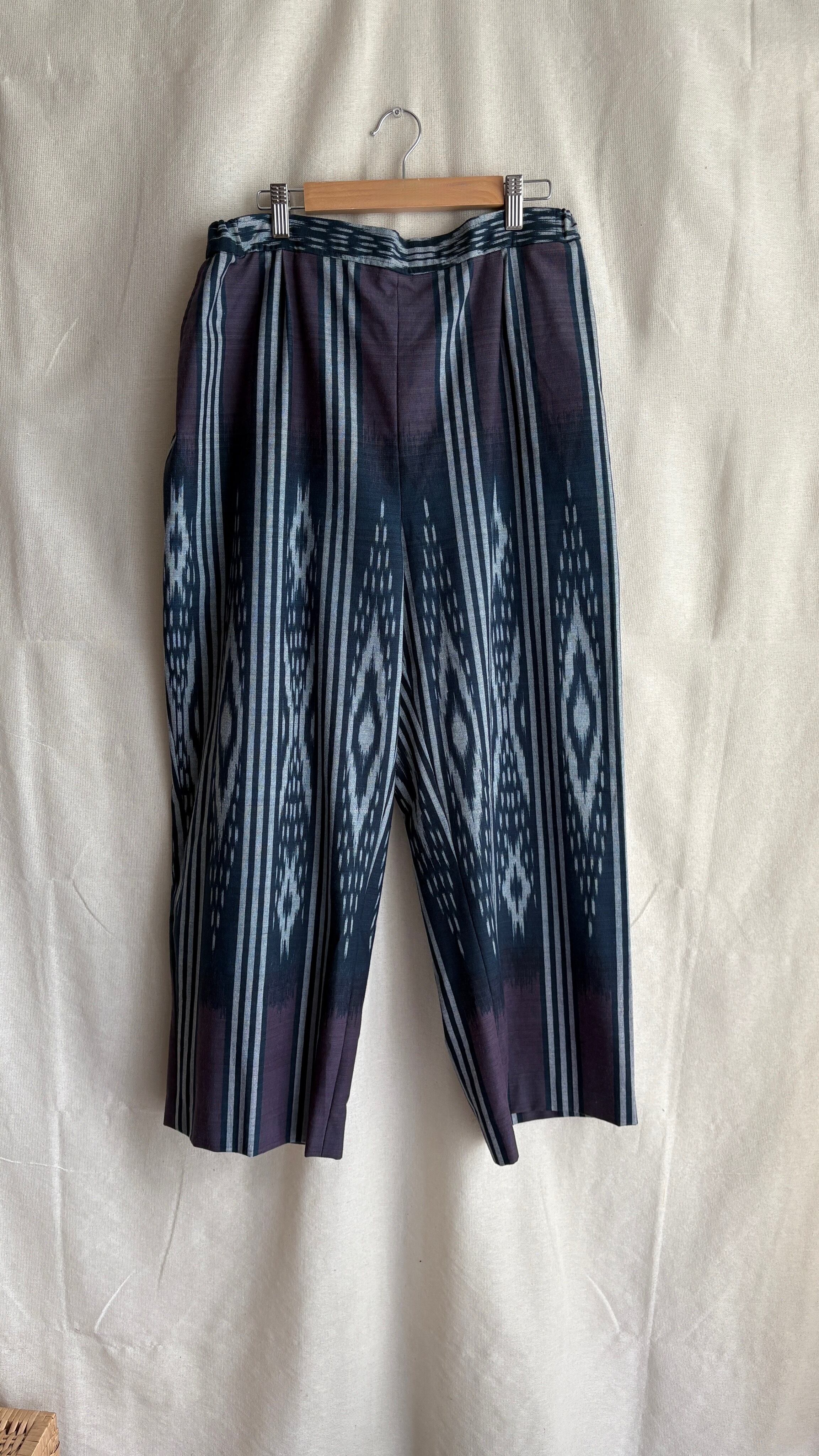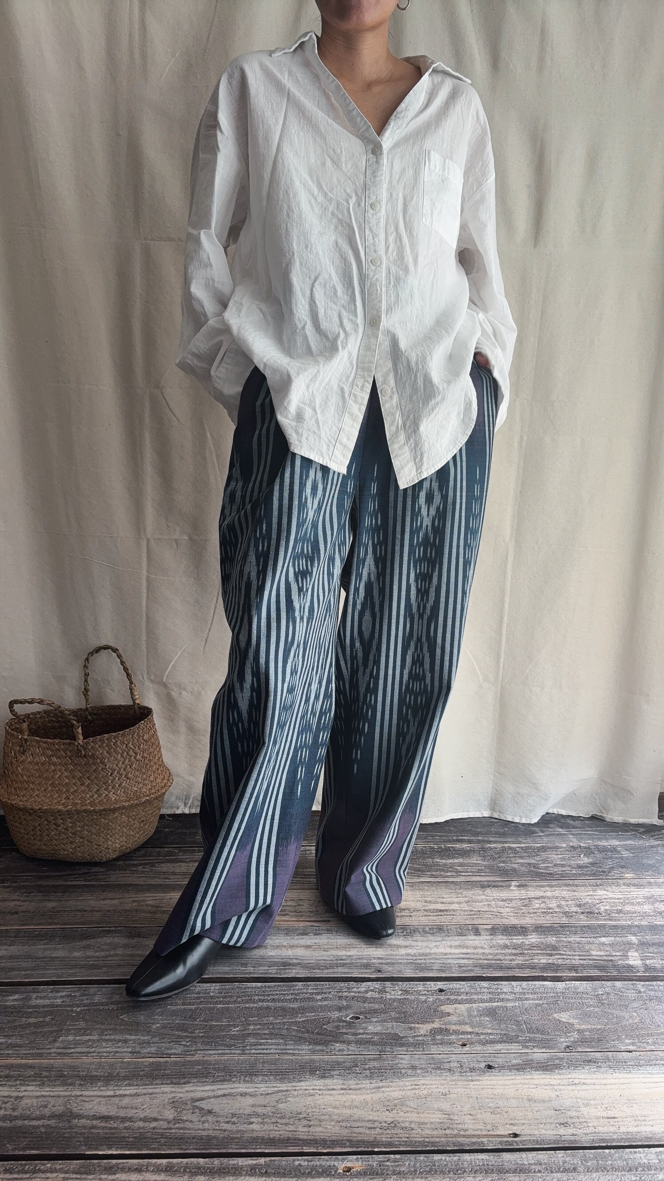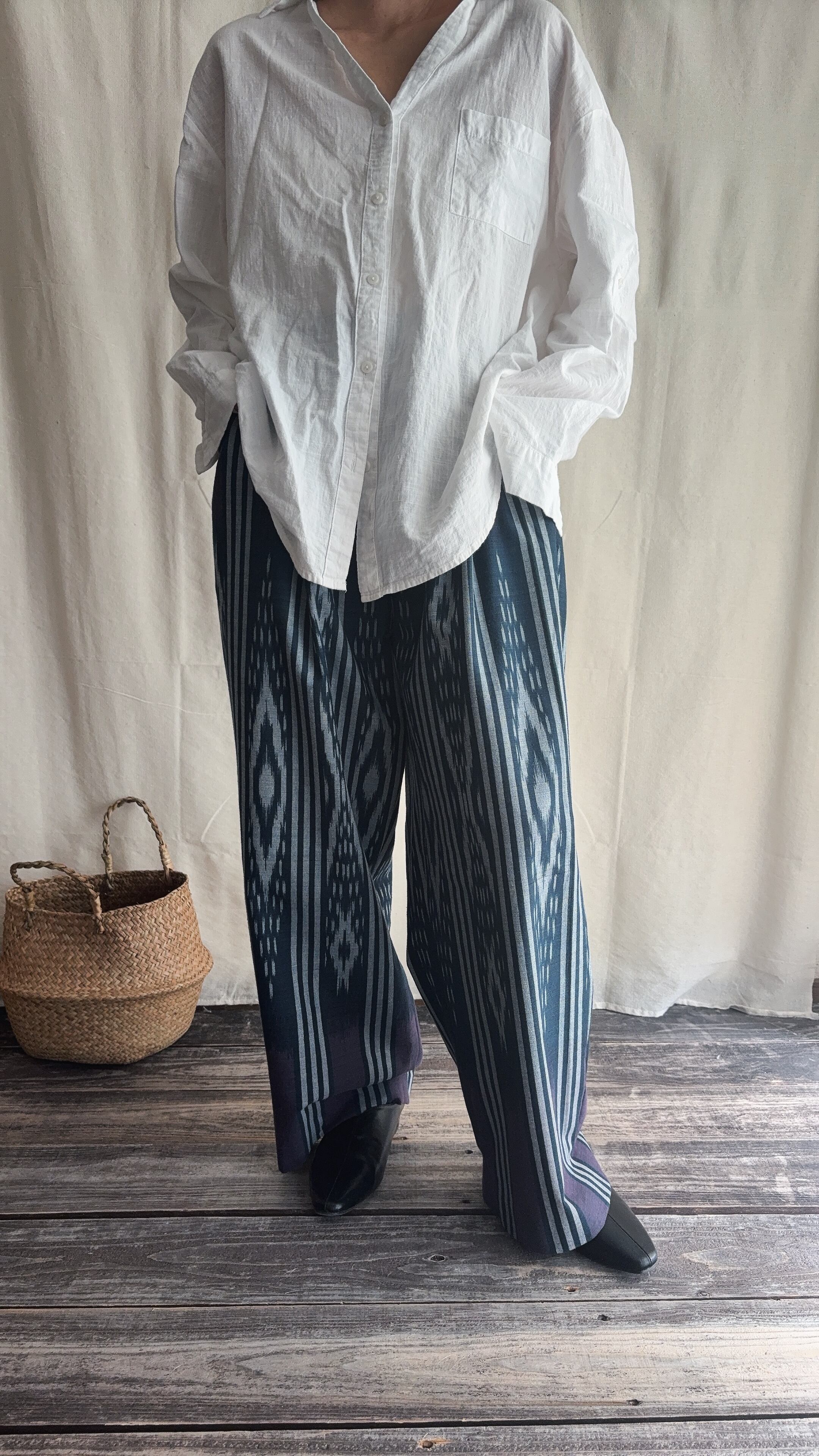 手織りのシルクコットン生地をパンツに仕立てられてます。