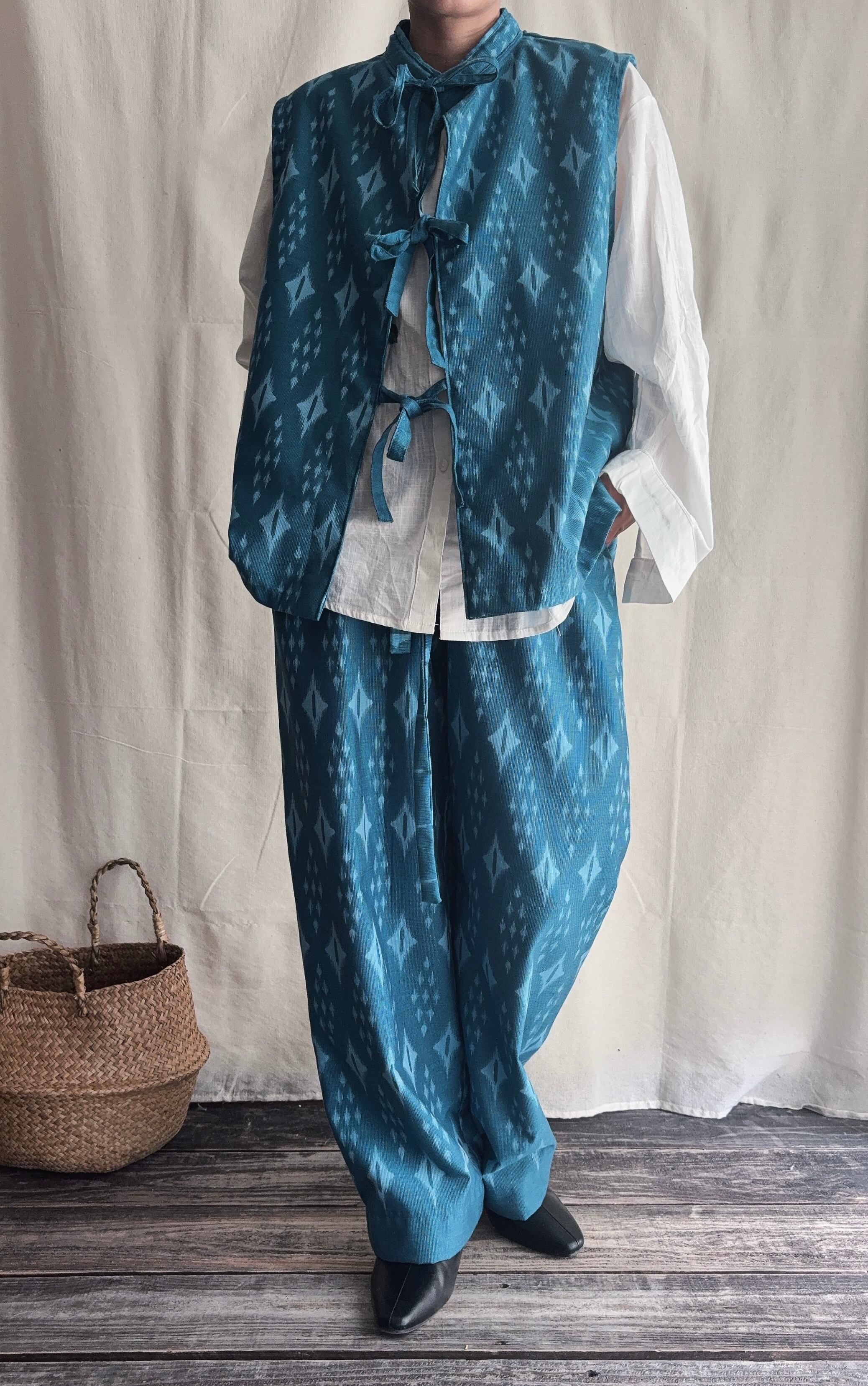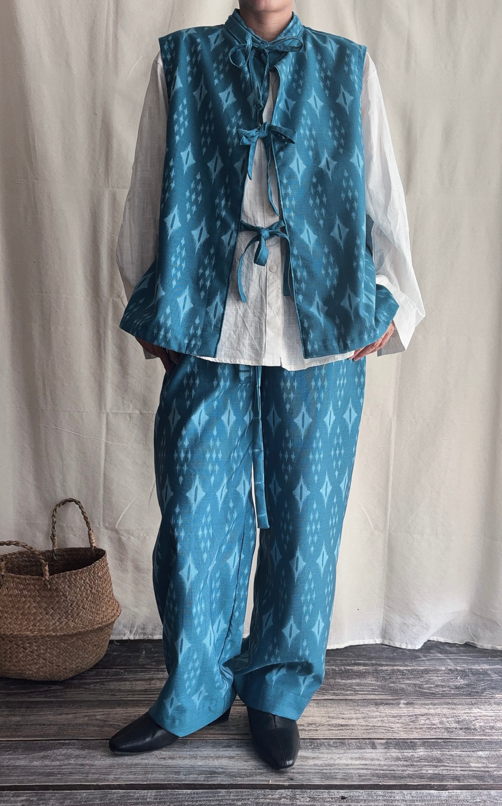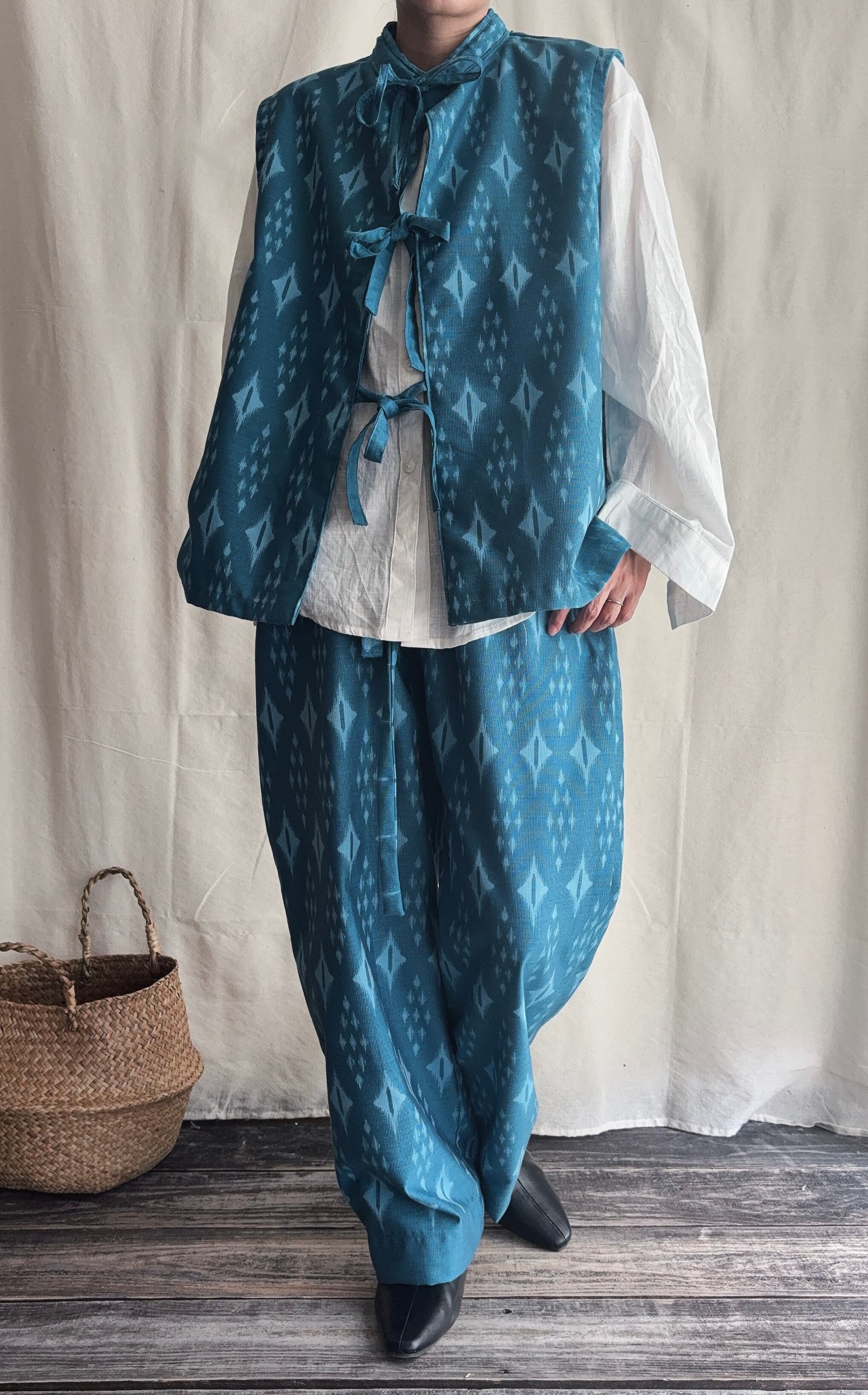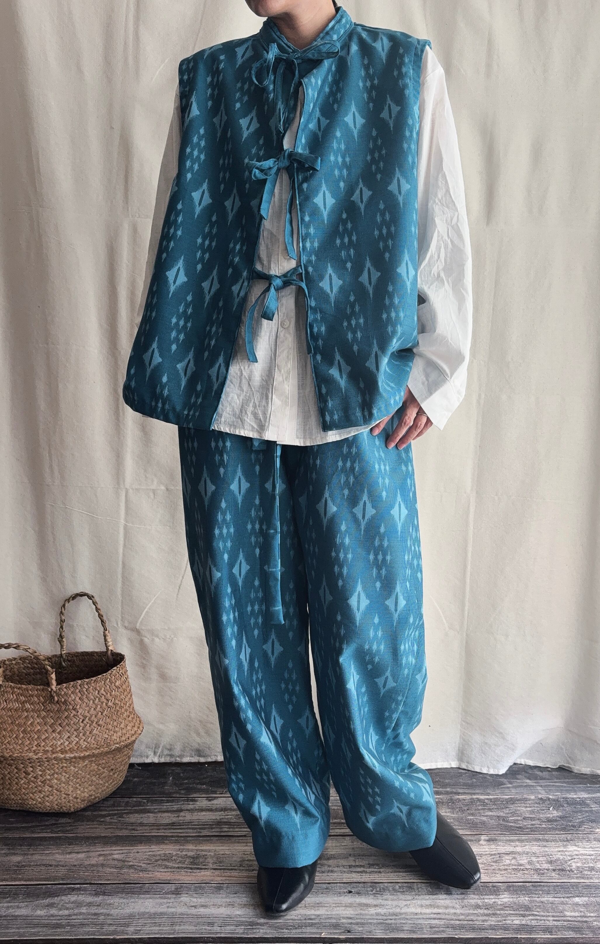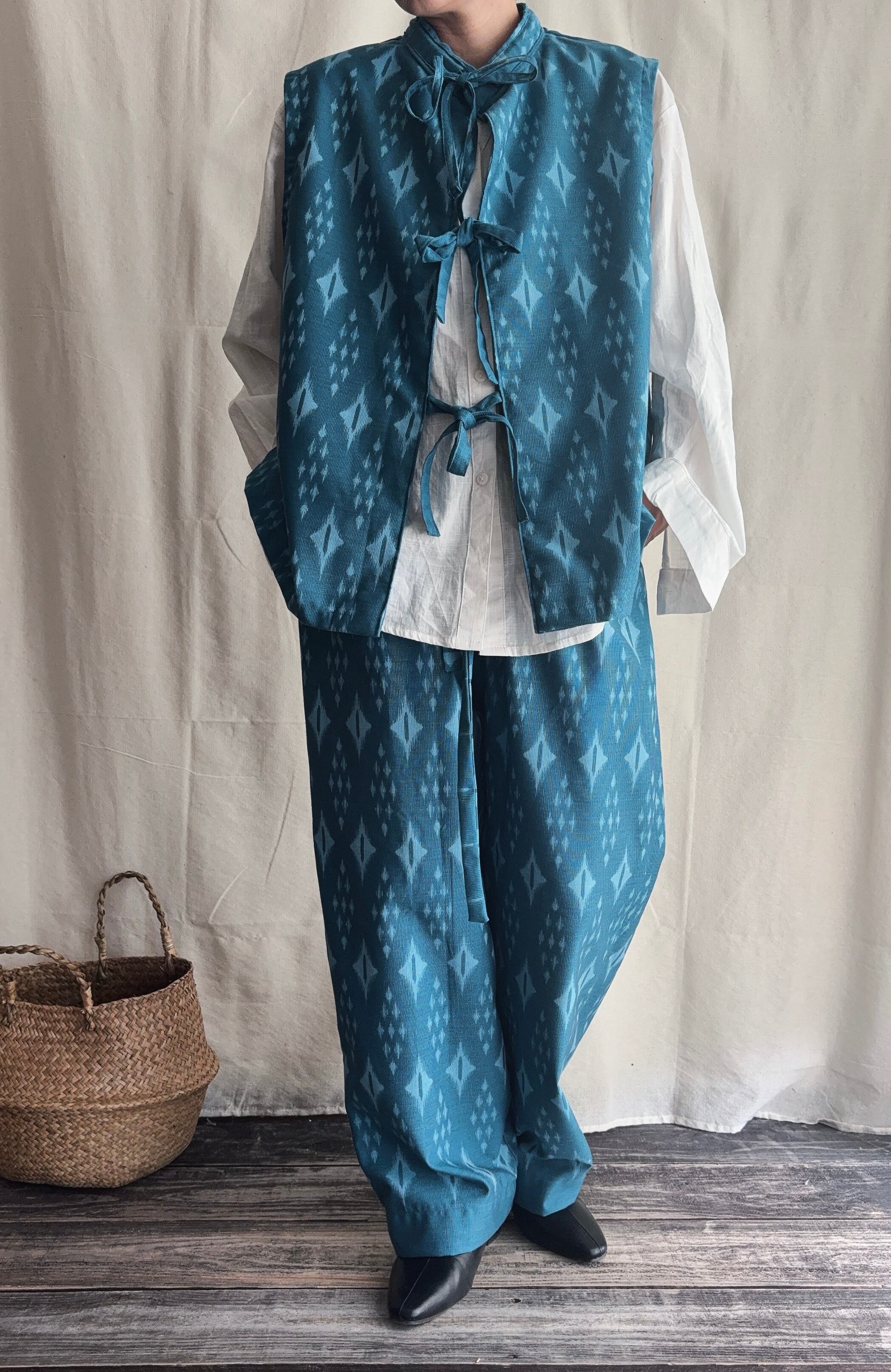 シルク コットンパンツ 総柄 民族 リボン チャイナ ベスト セットアップ メンズ レディース