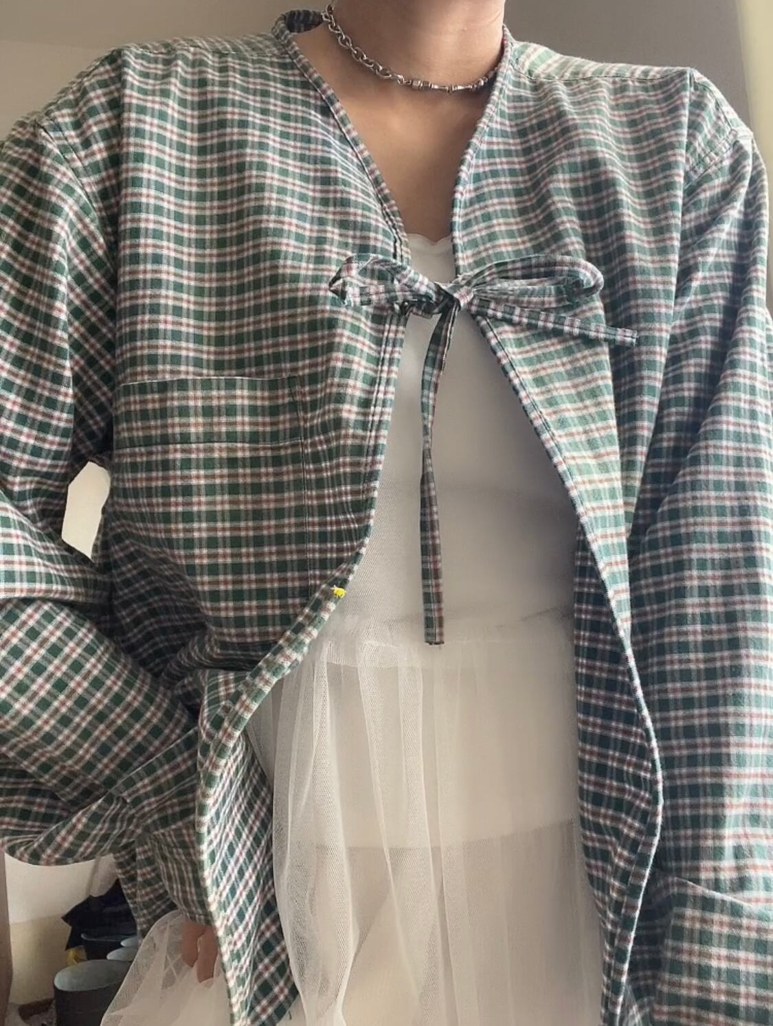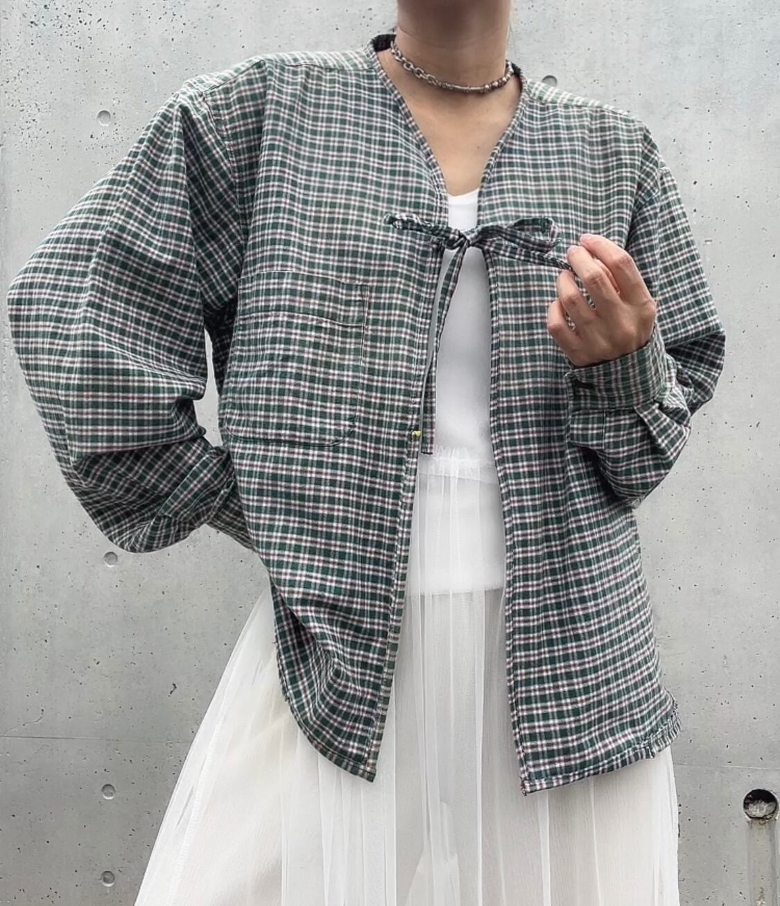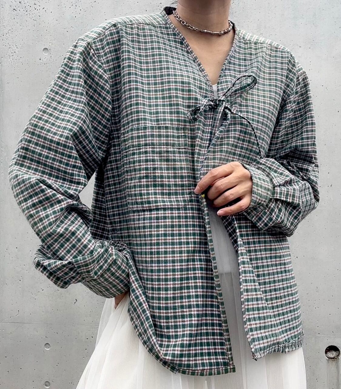 リボン羽織りコットンチェックシャツブラウススリーピングシャツミリタリー古着レトロ
