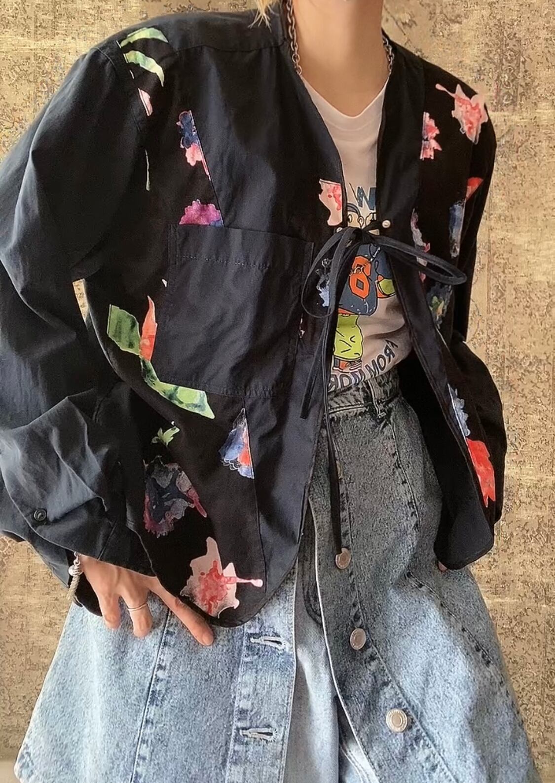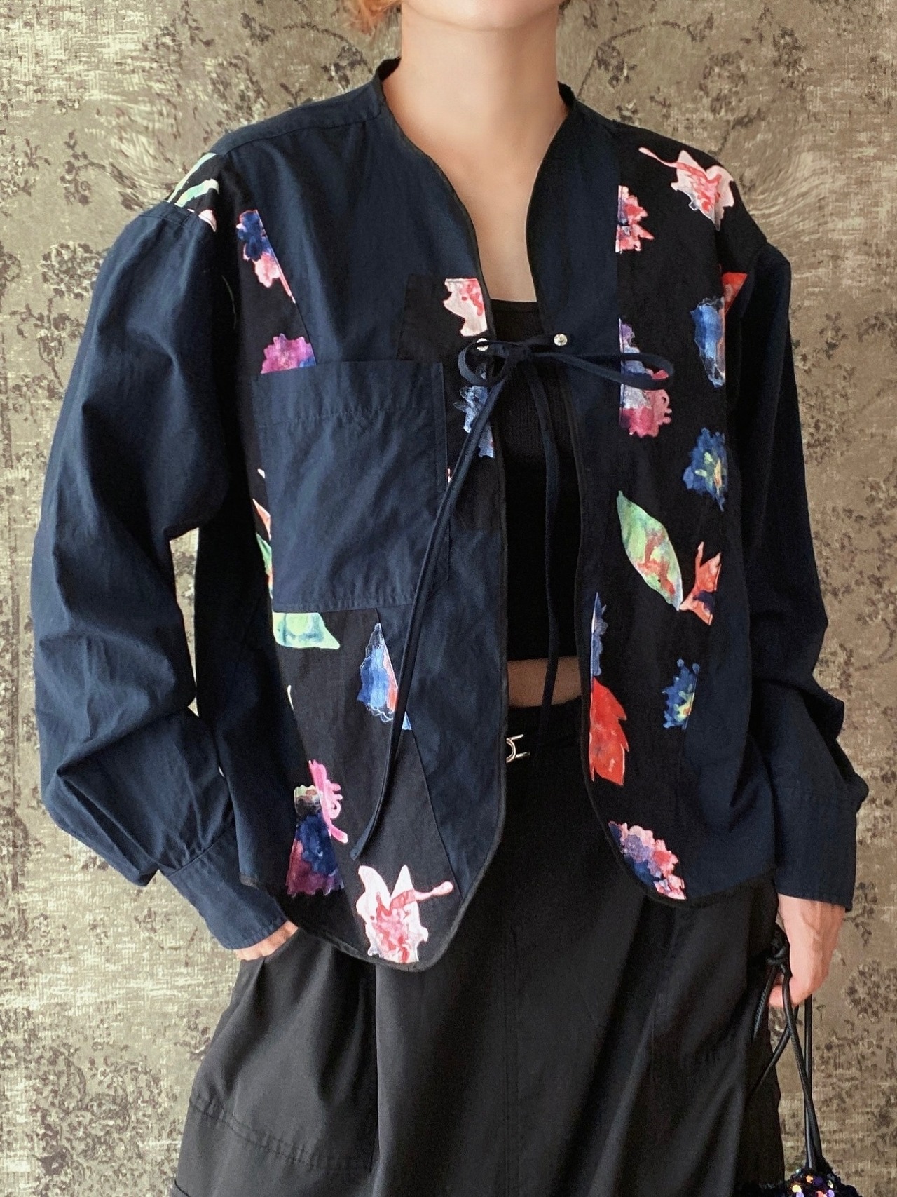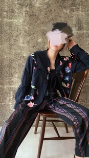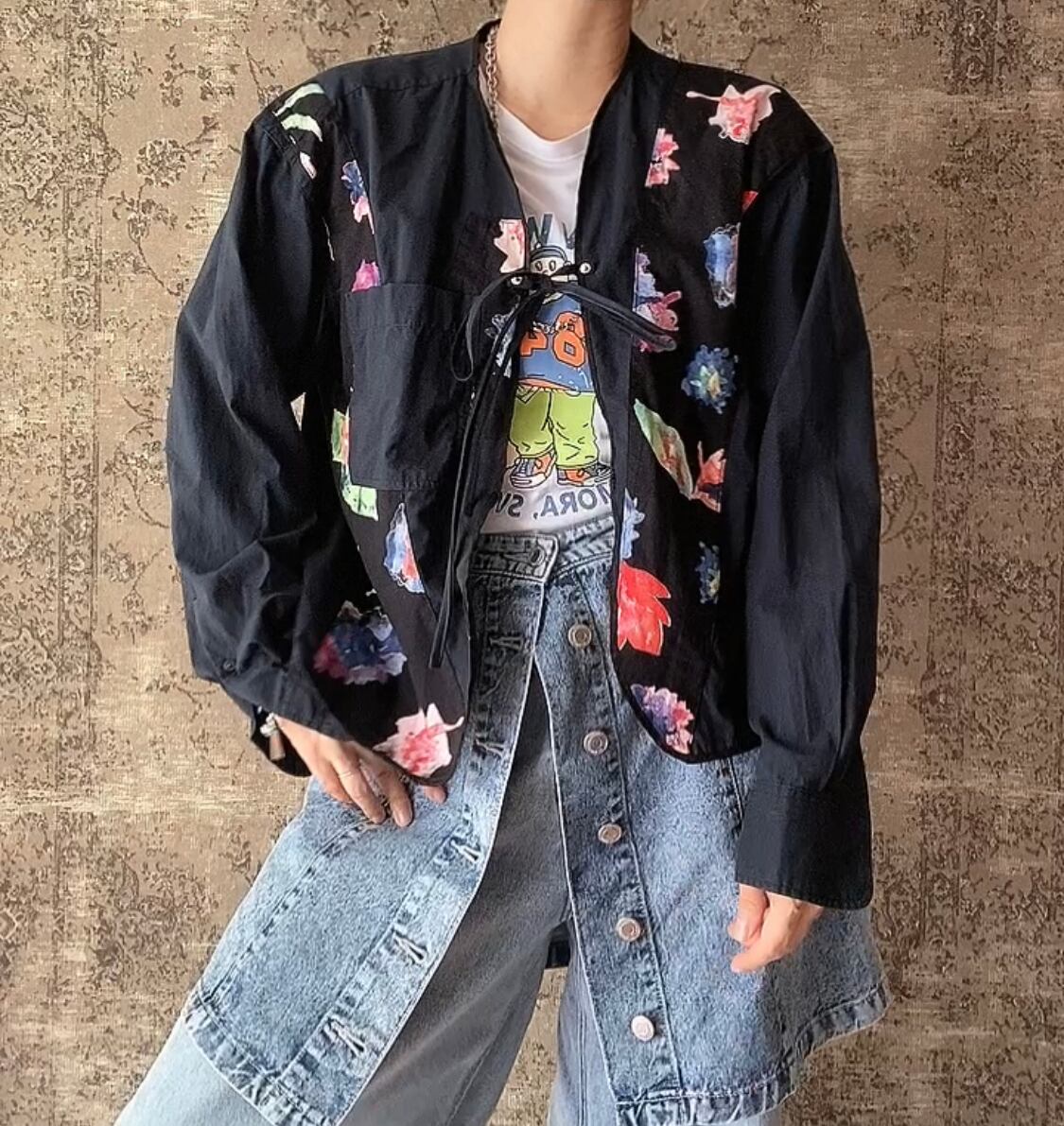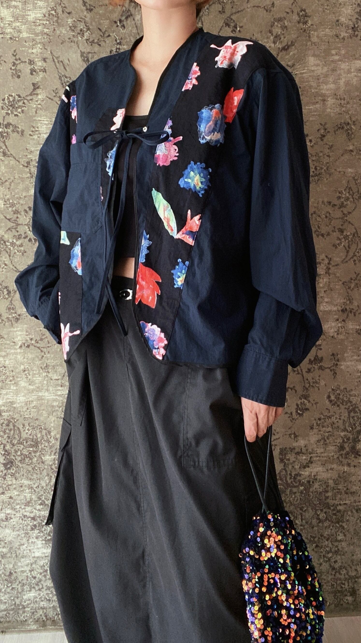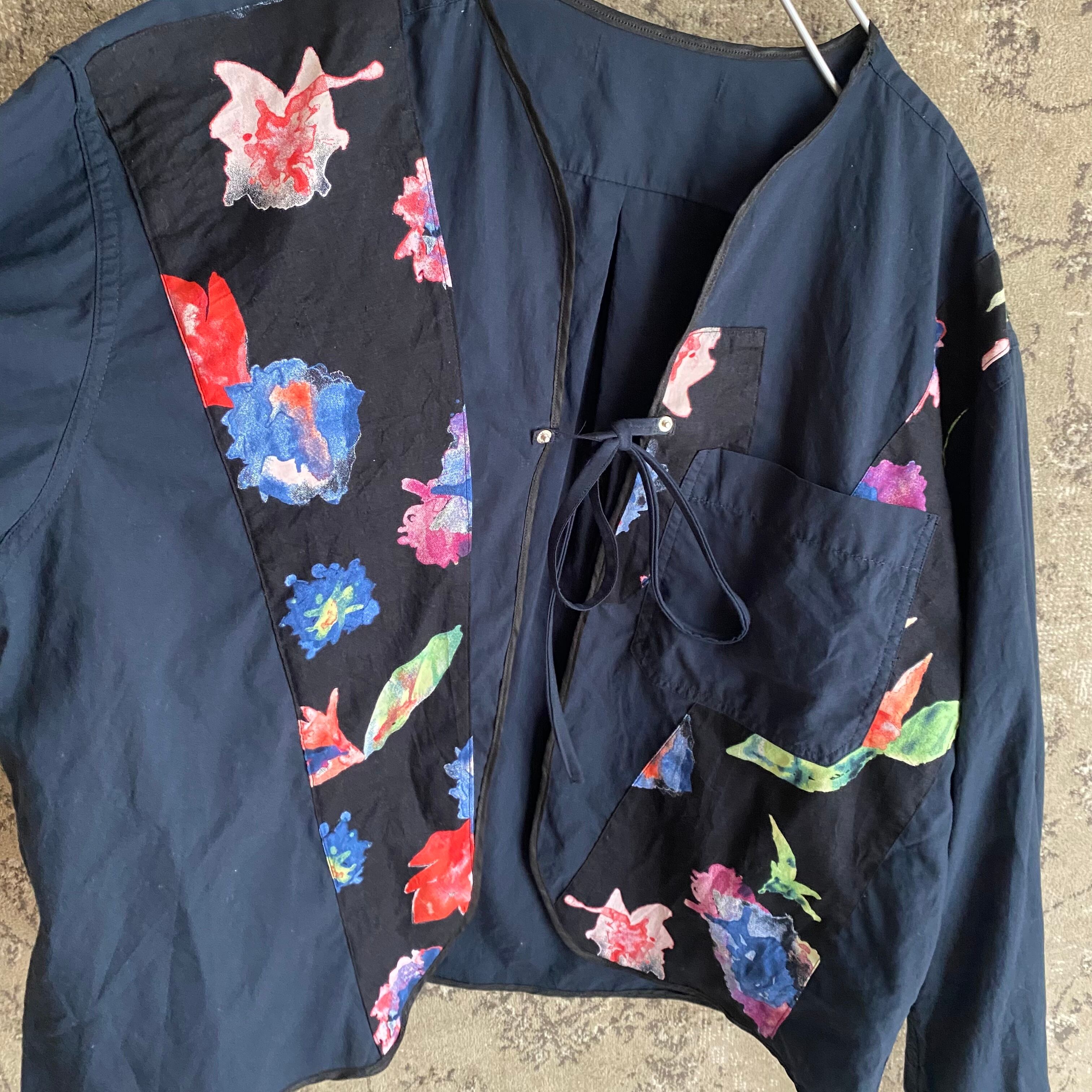 No.393ネルシャツ スリーピングシャツ 古着 ヴィンテージ トップス 黒 花柄 羽織りコットンシャツ