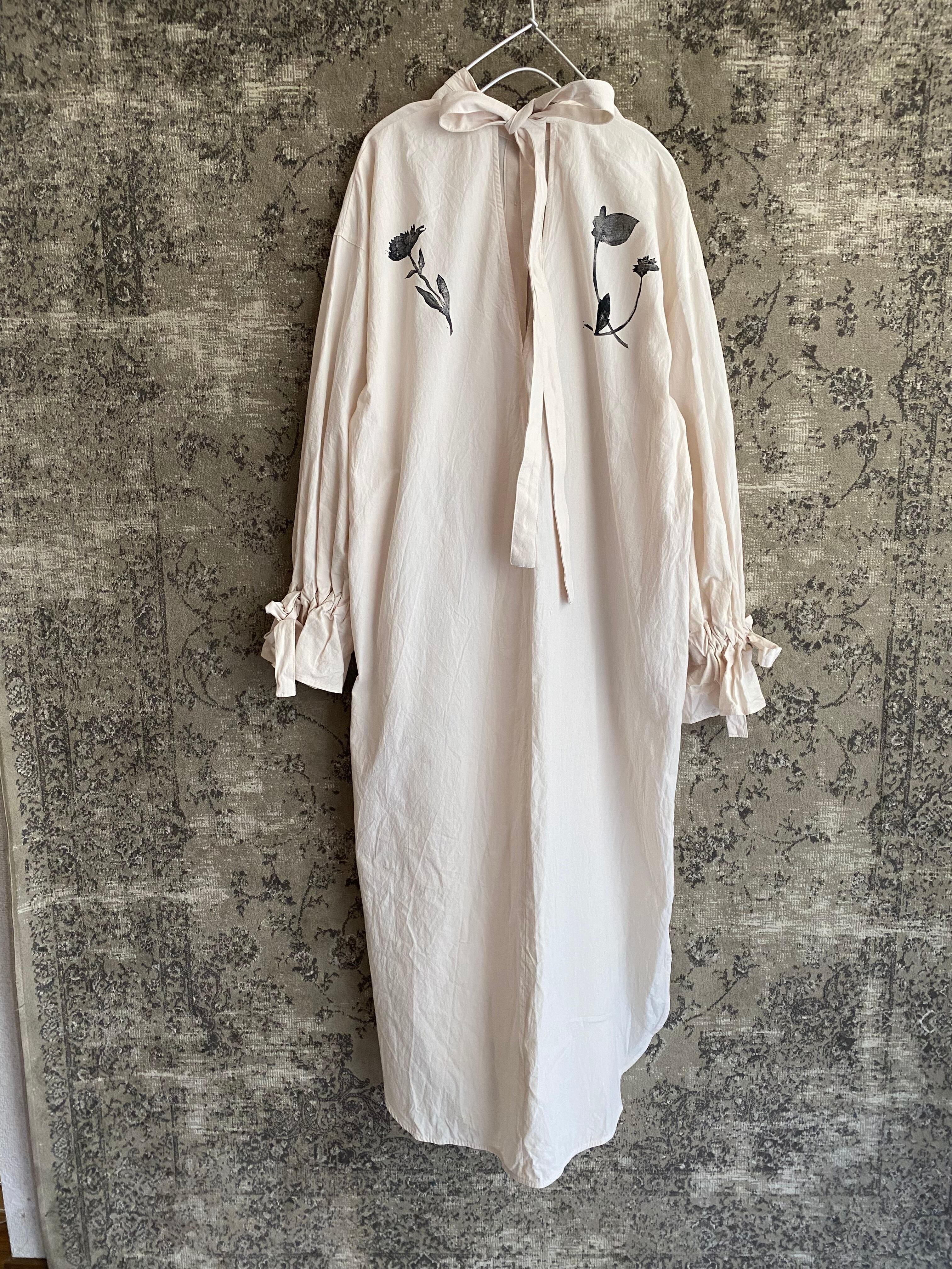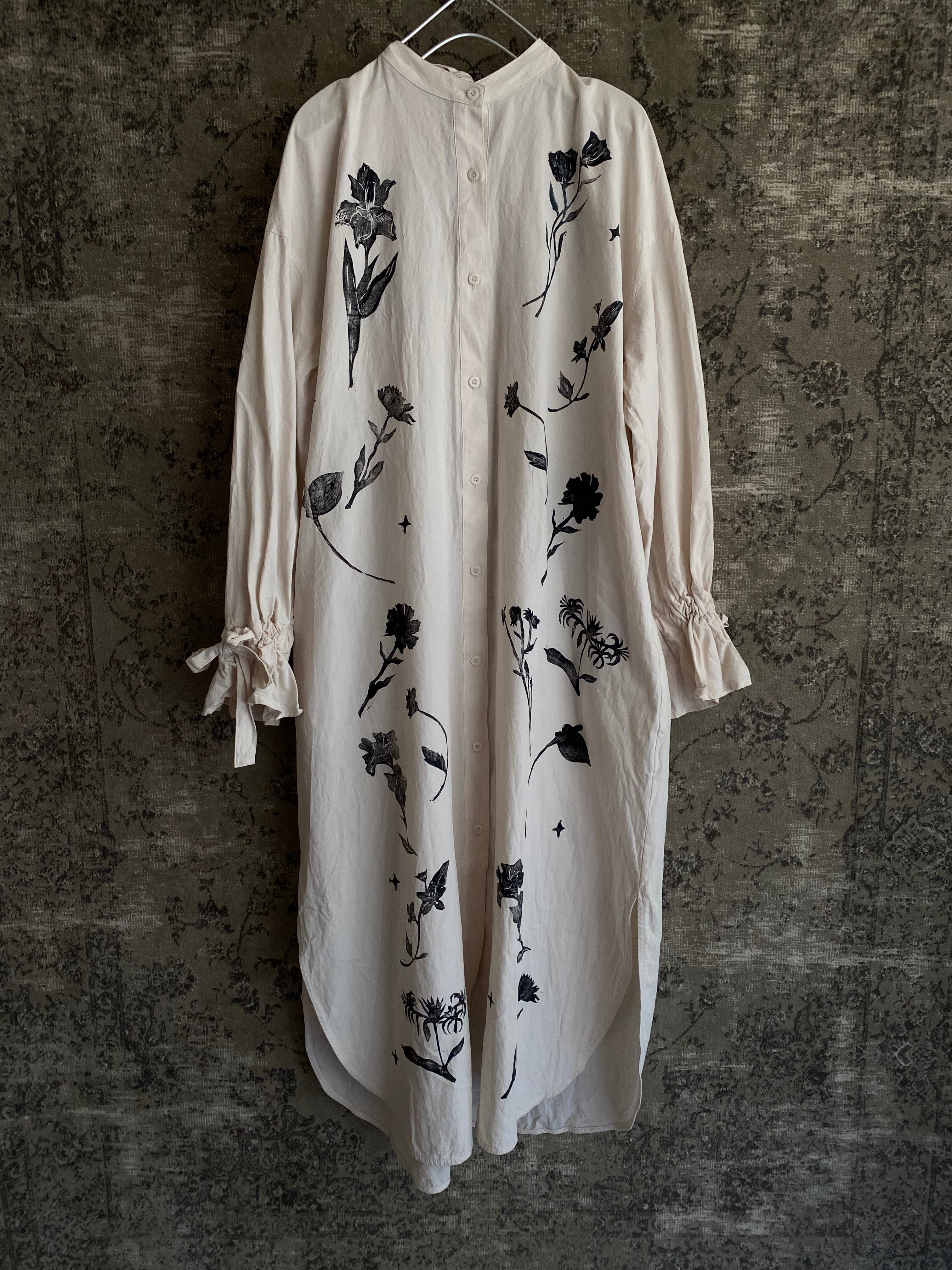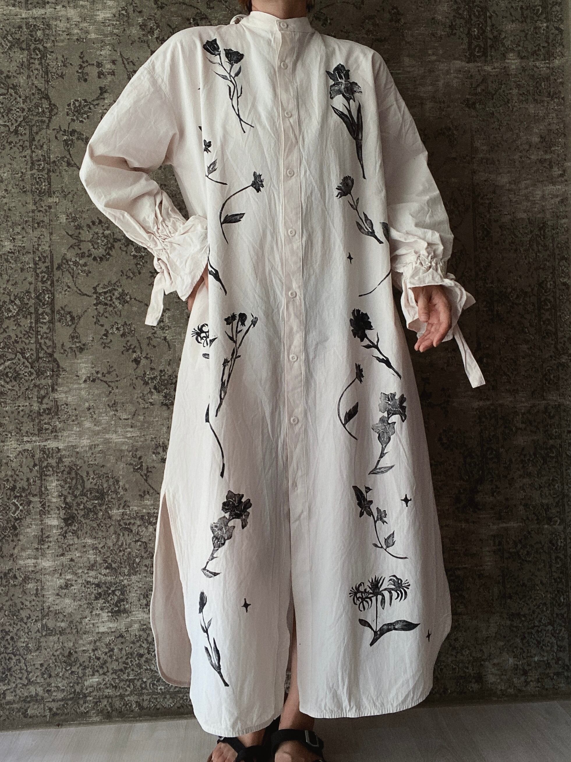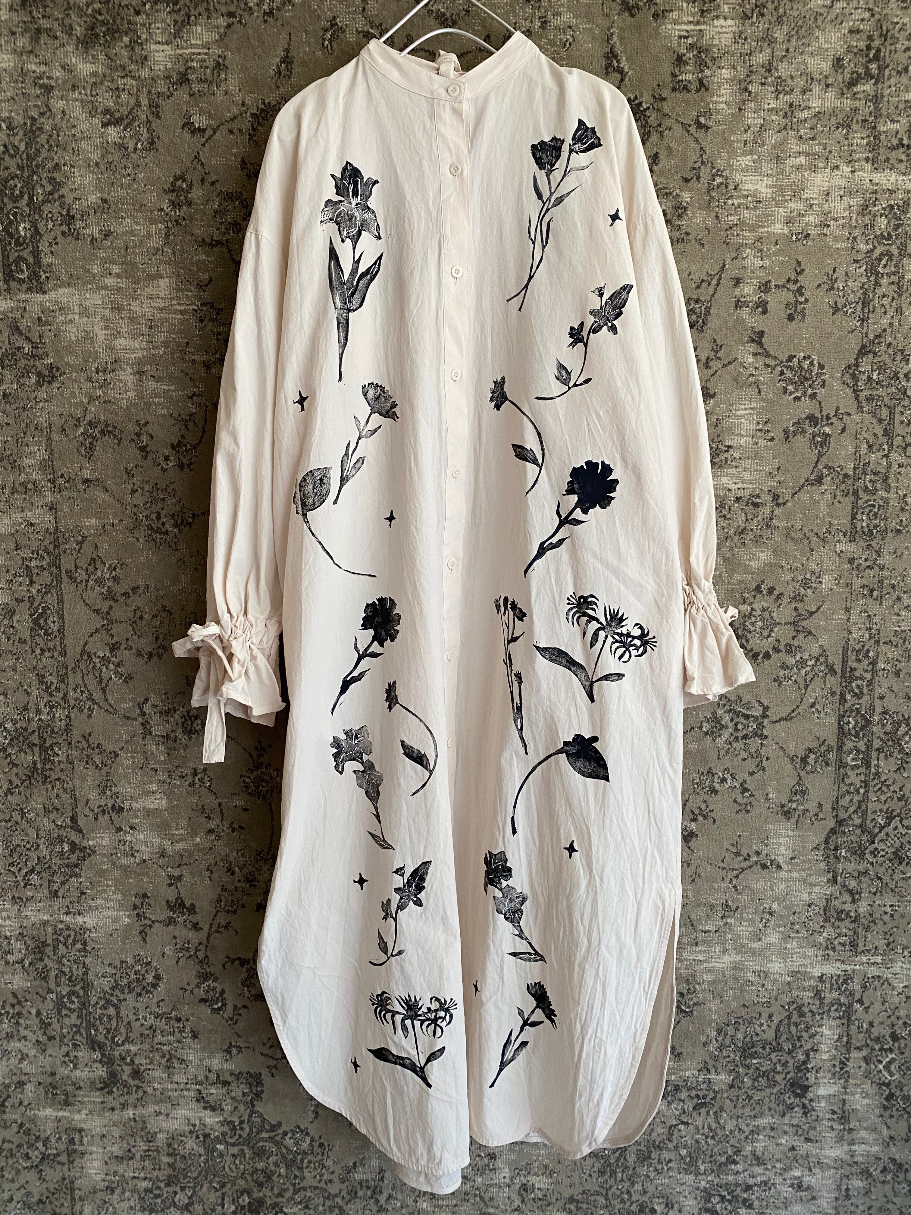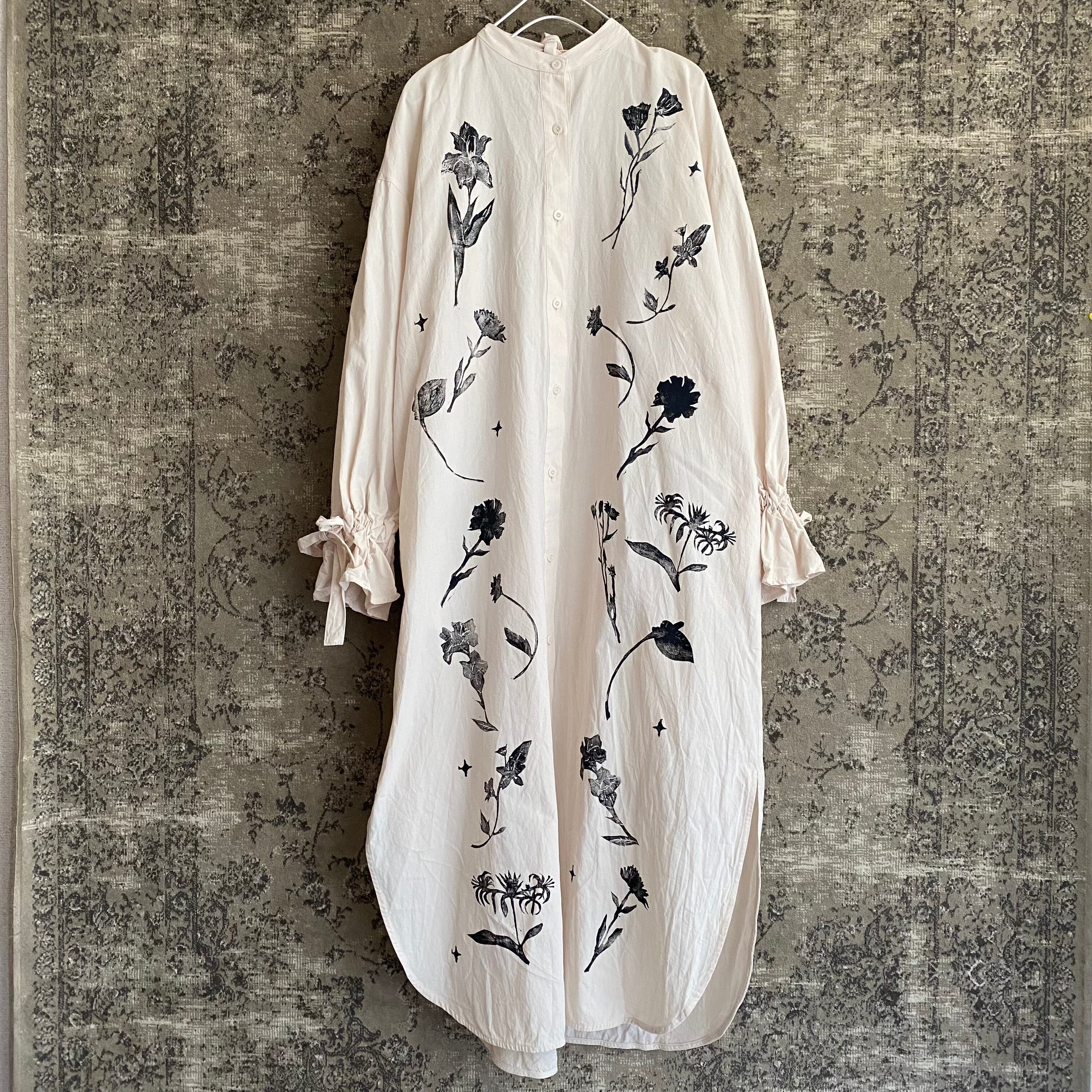 コットンのワンピースに贅沢に散りばめられた沖縄の花々達。
