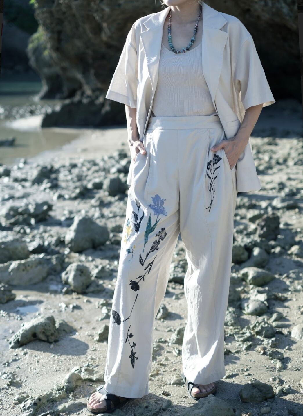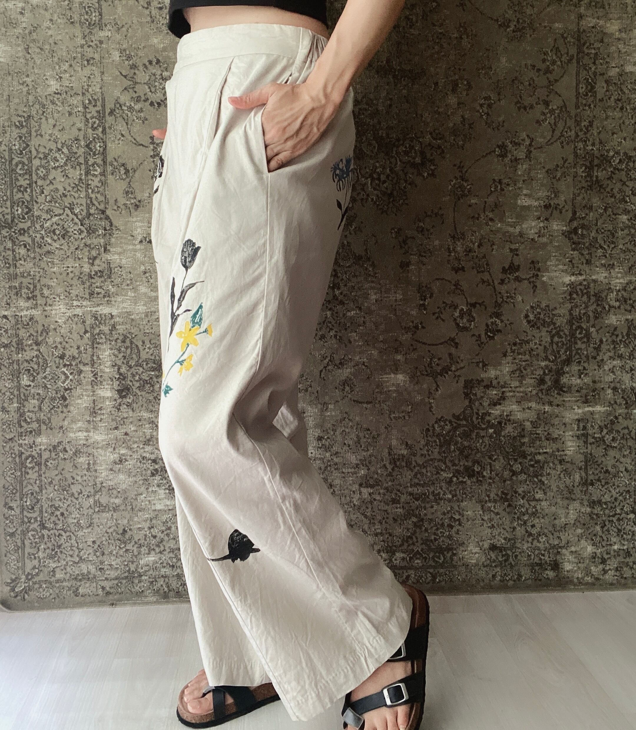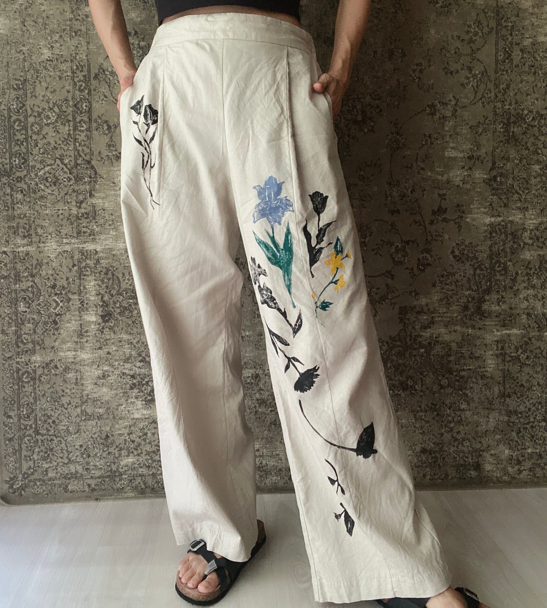 ブロックプリント花柄コットンリネンレディースパンツ古着