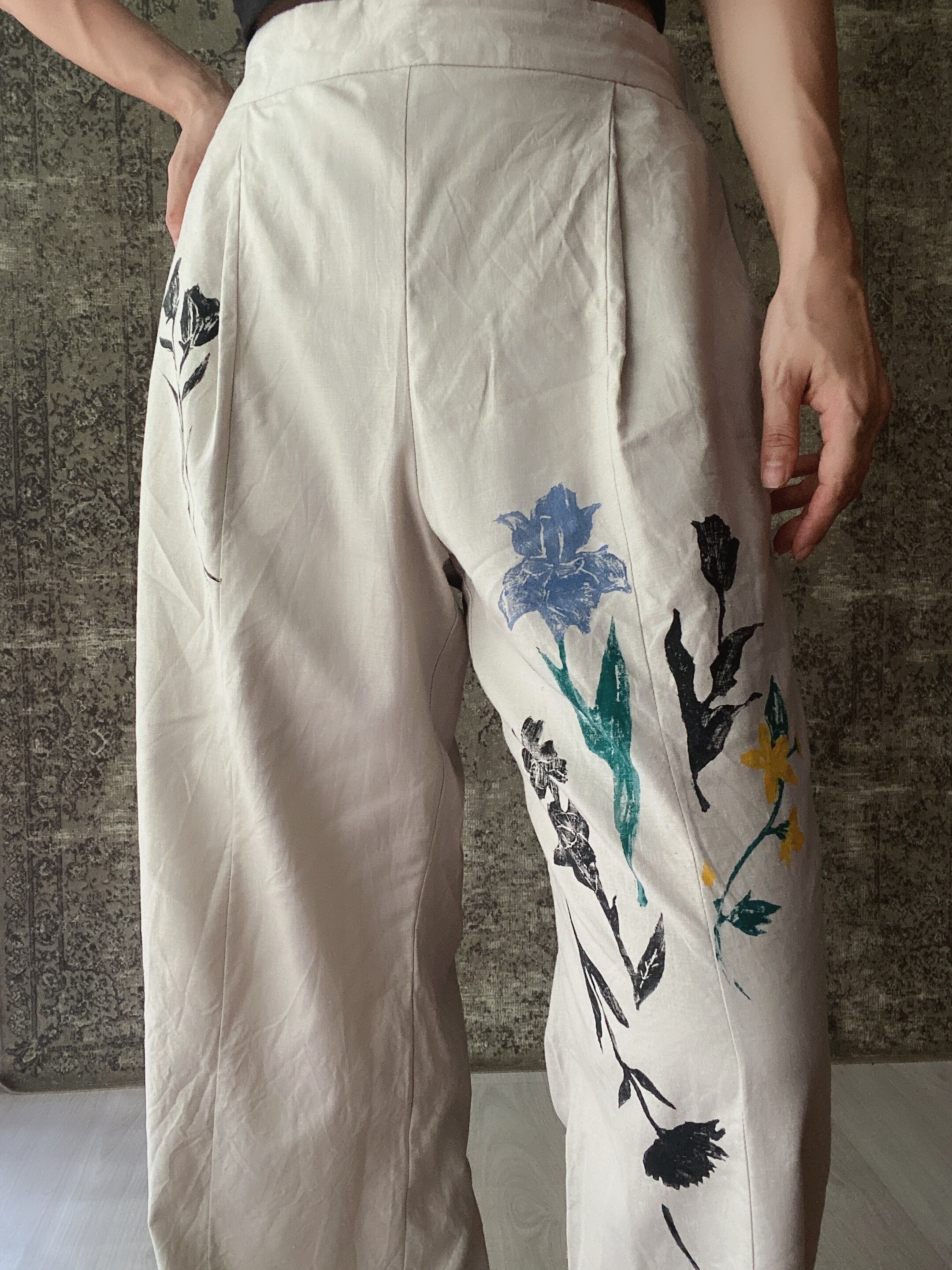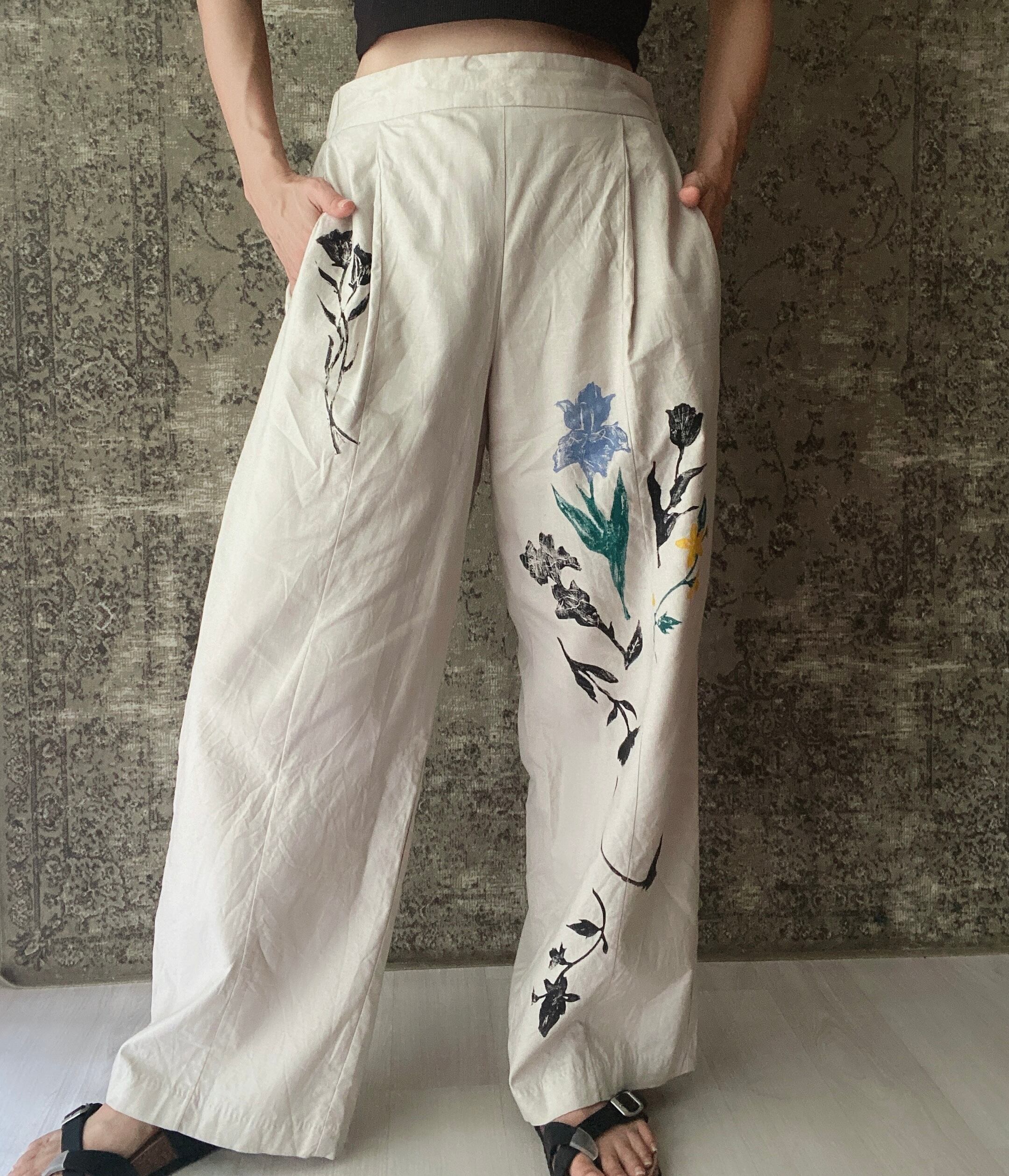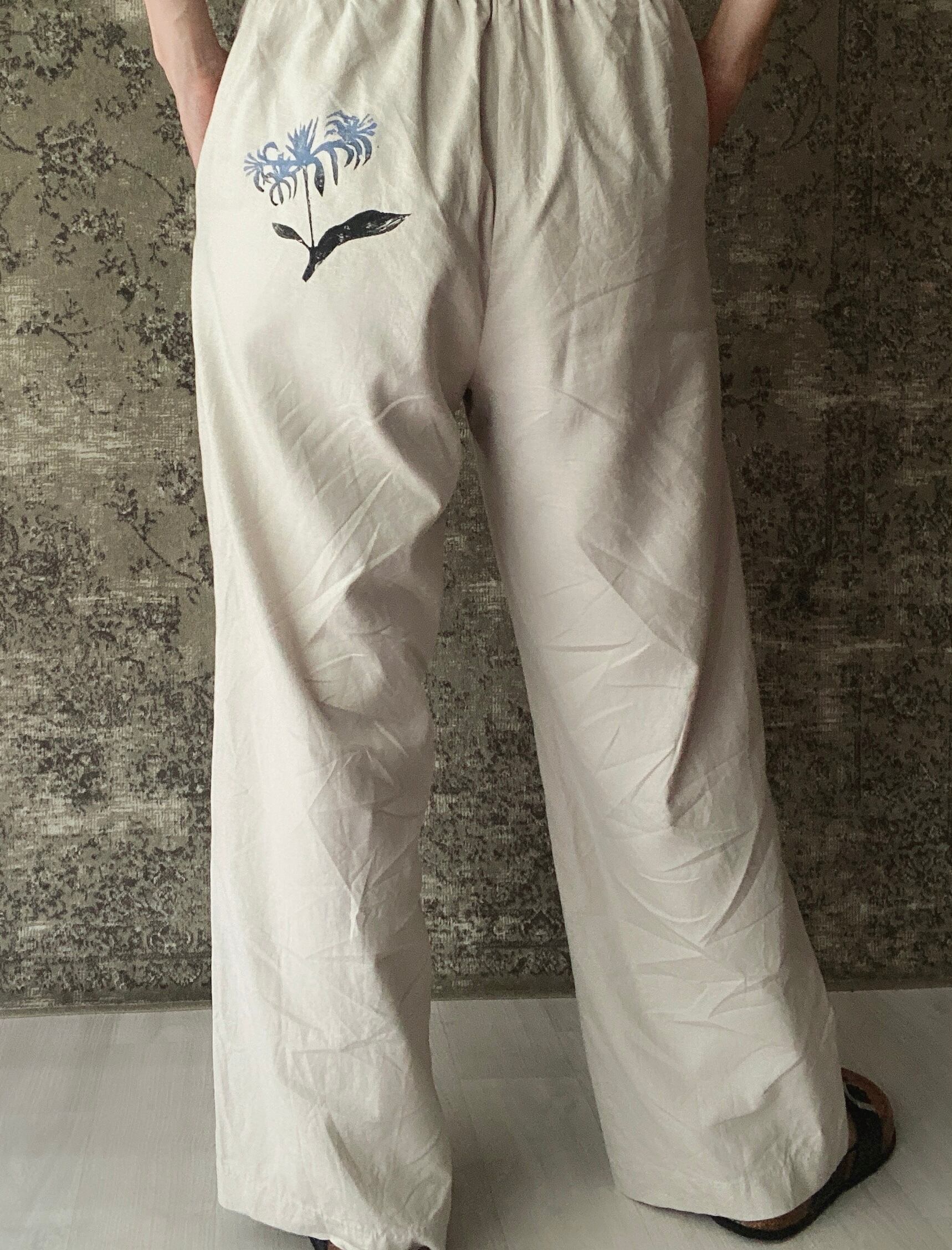 ブロックプリント花柄コットンリネンレディースパンツ古着