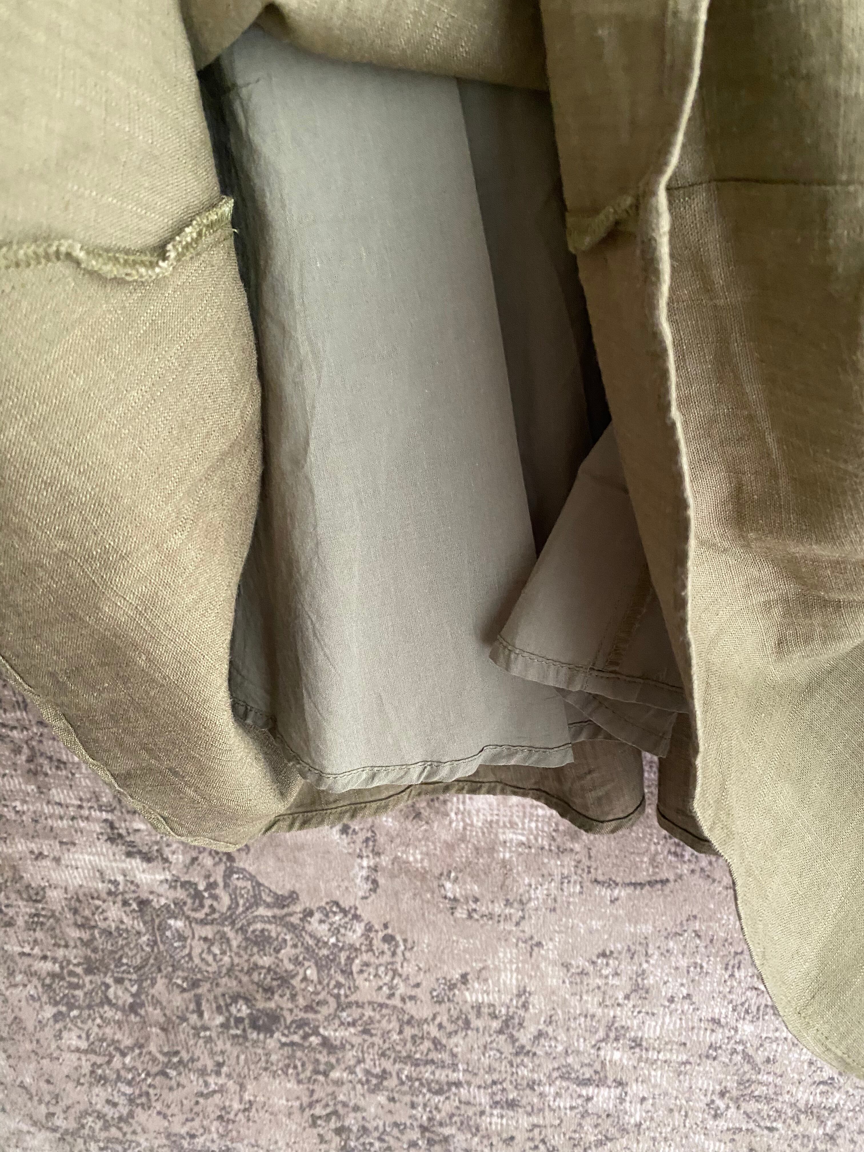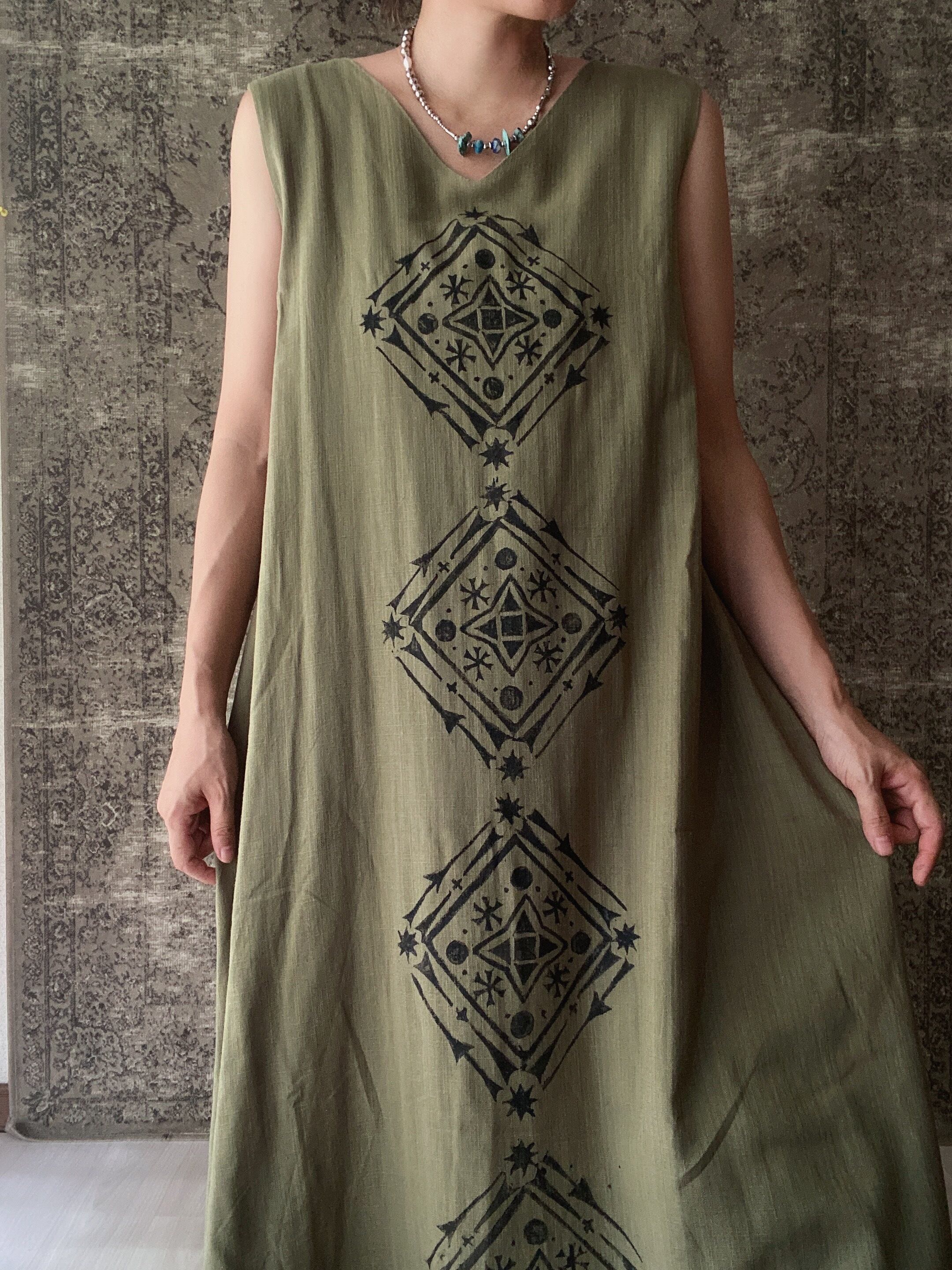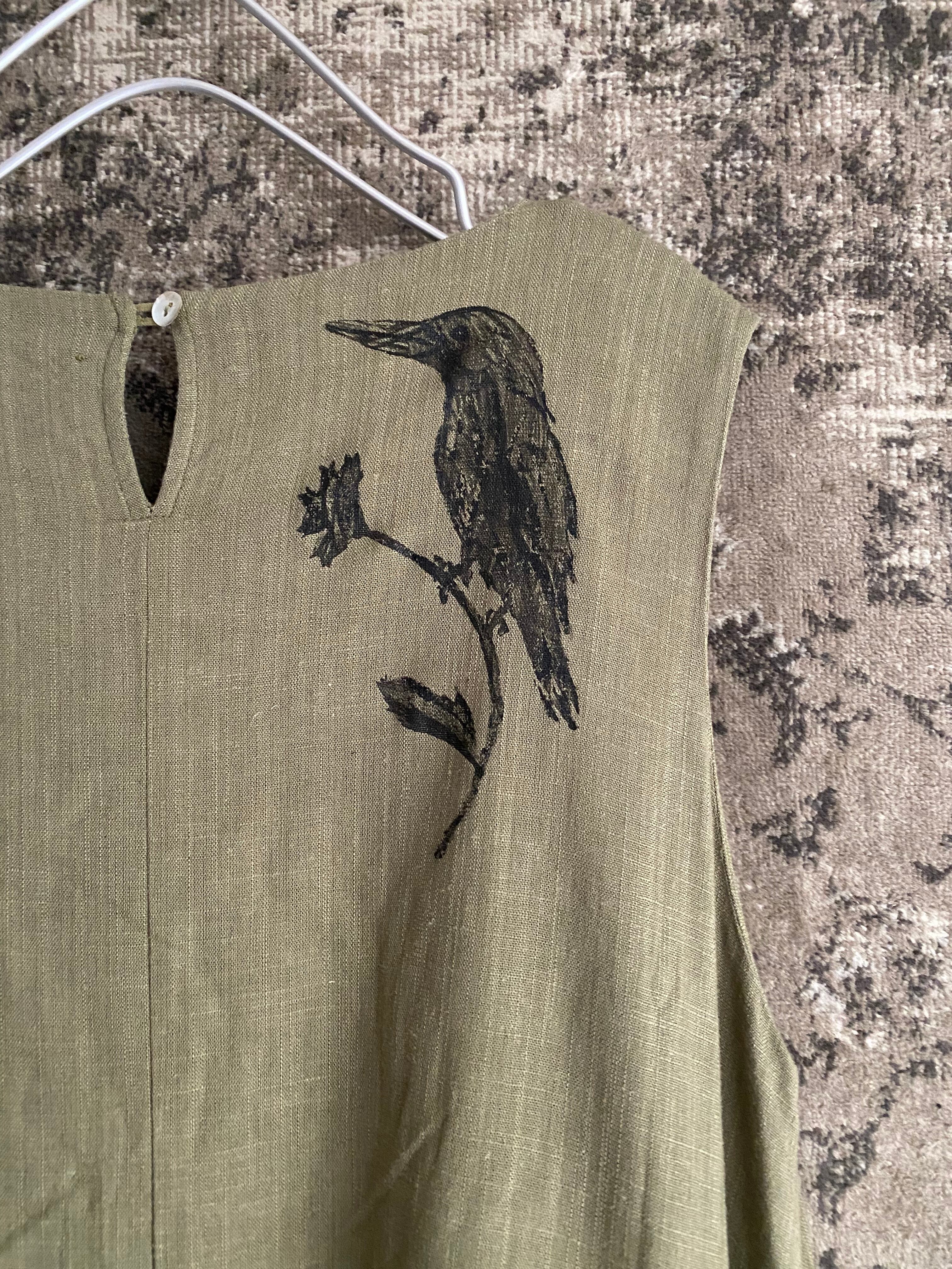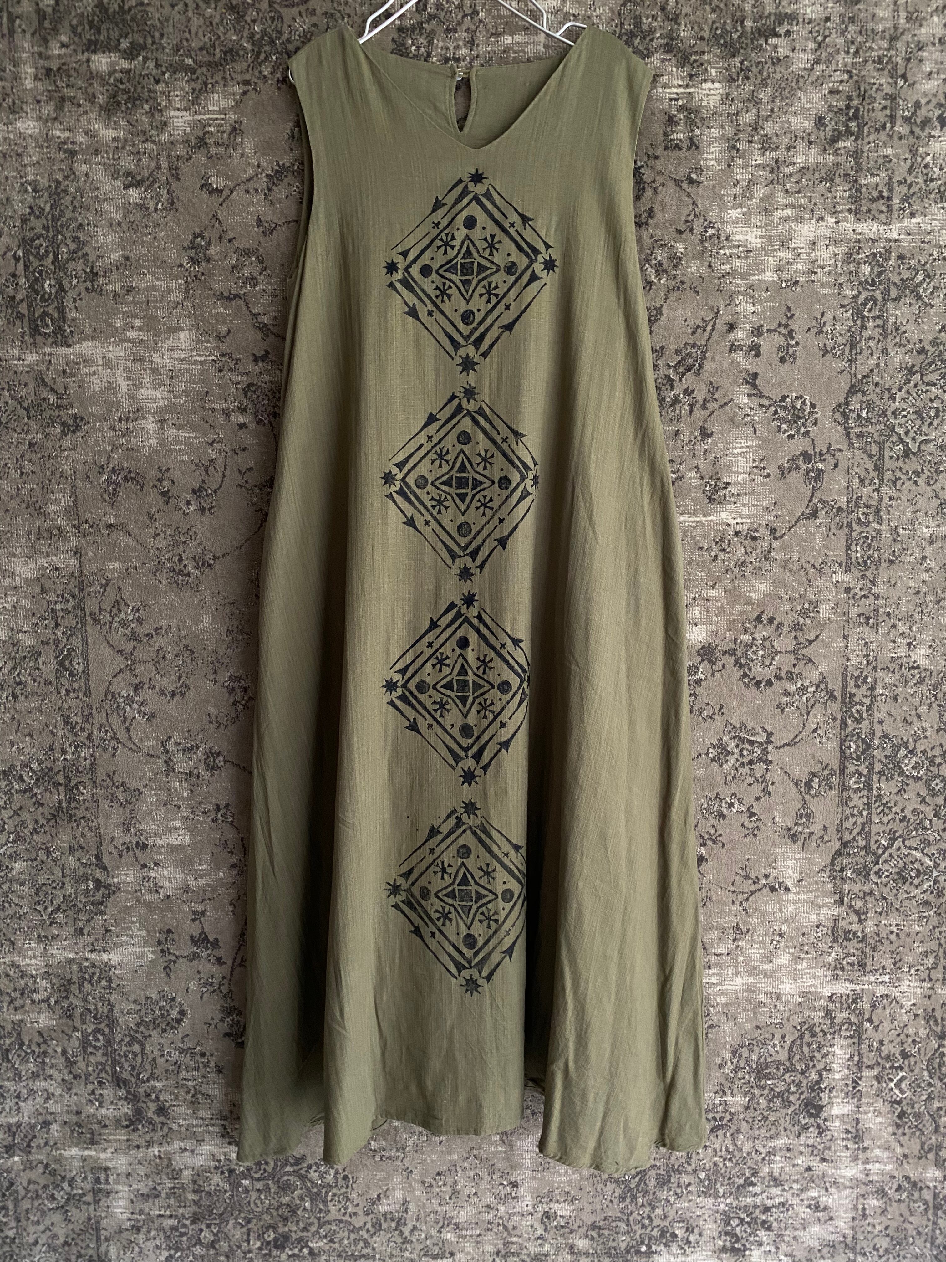リネンロングワンピースカーキ古着鳥柄花柄ノースリーブレディースブロックプリント