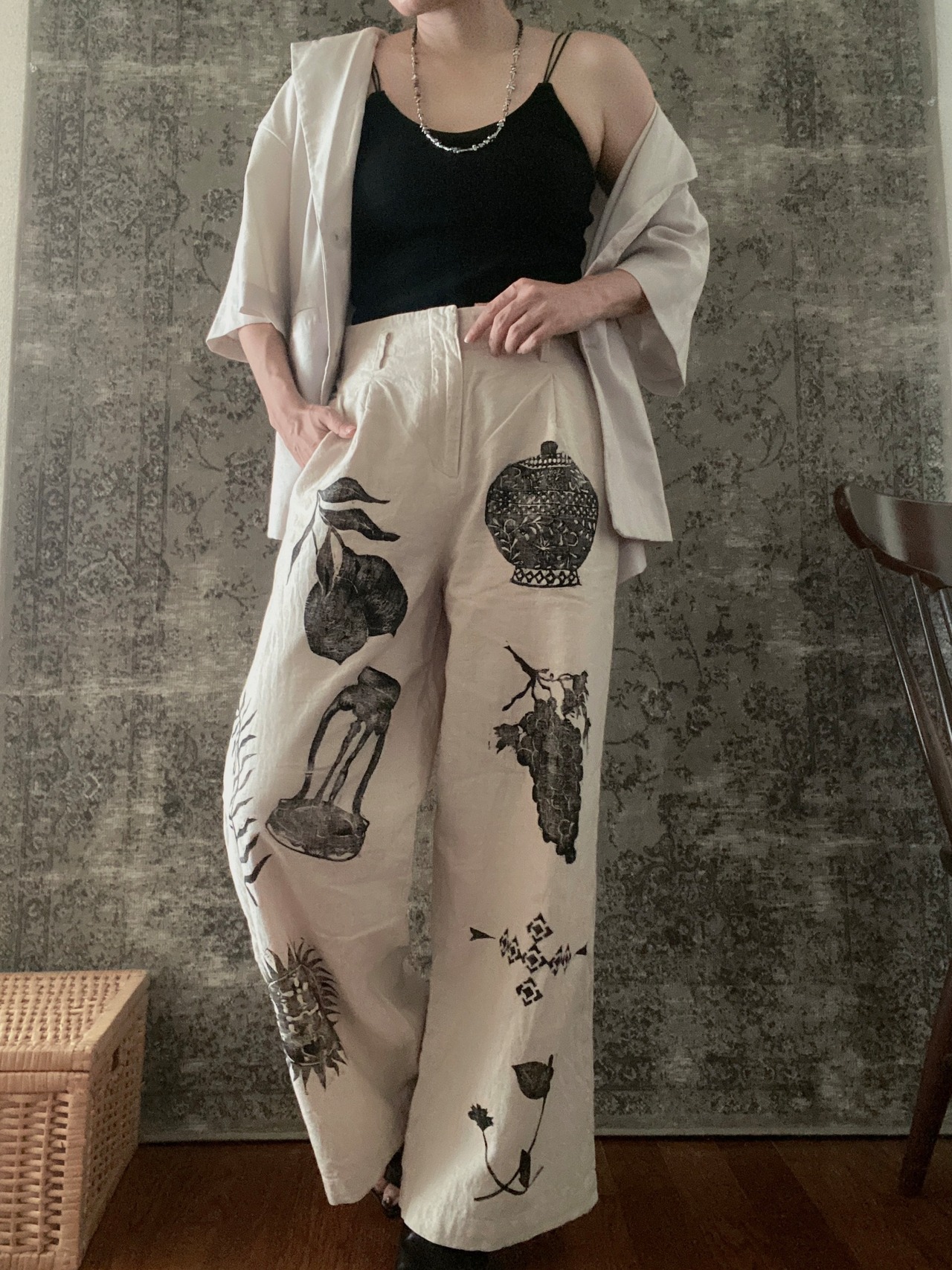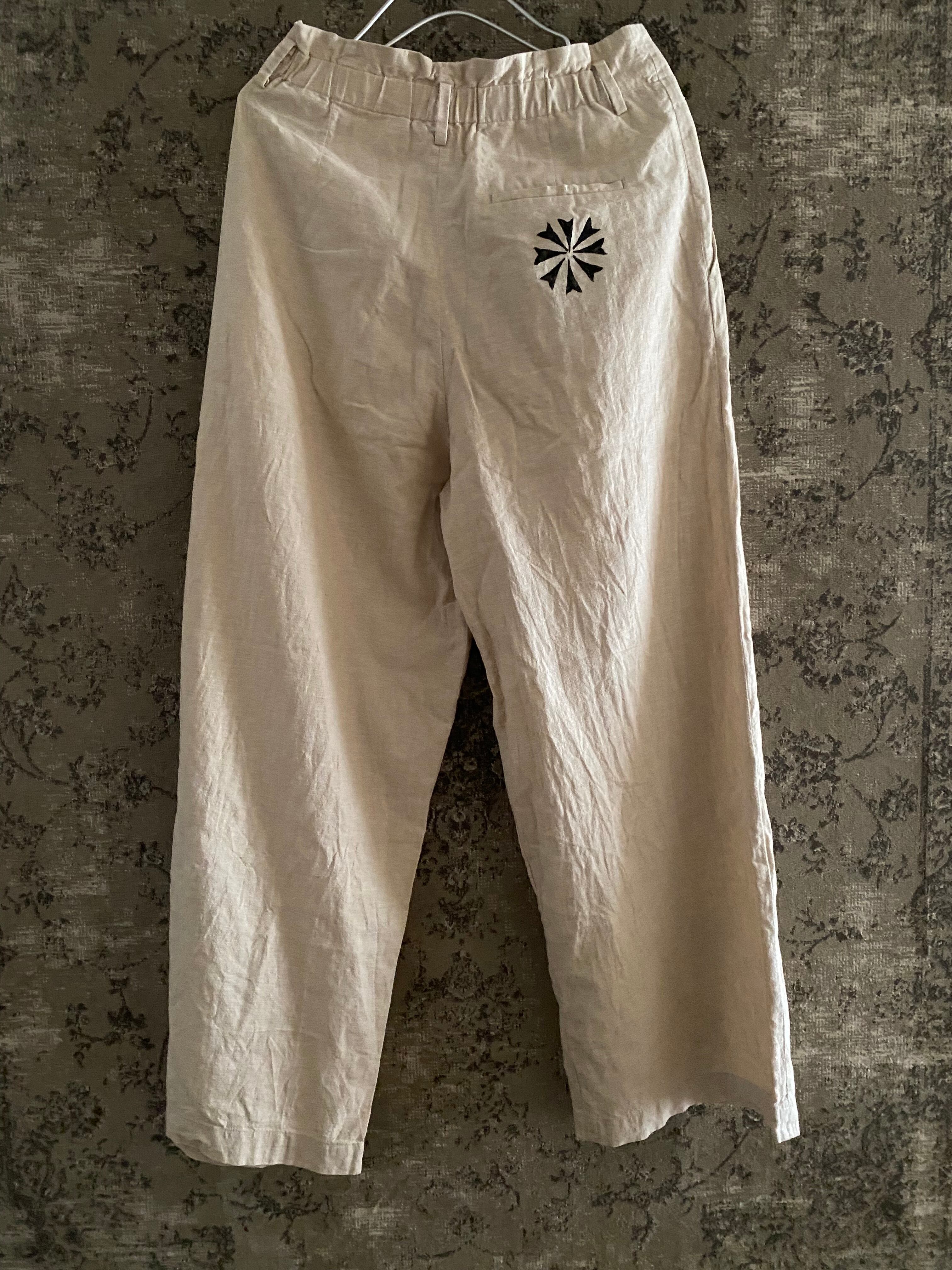 コットン綿麻リネンパンツブロックプリント蝶々鳥花柄古着レディース