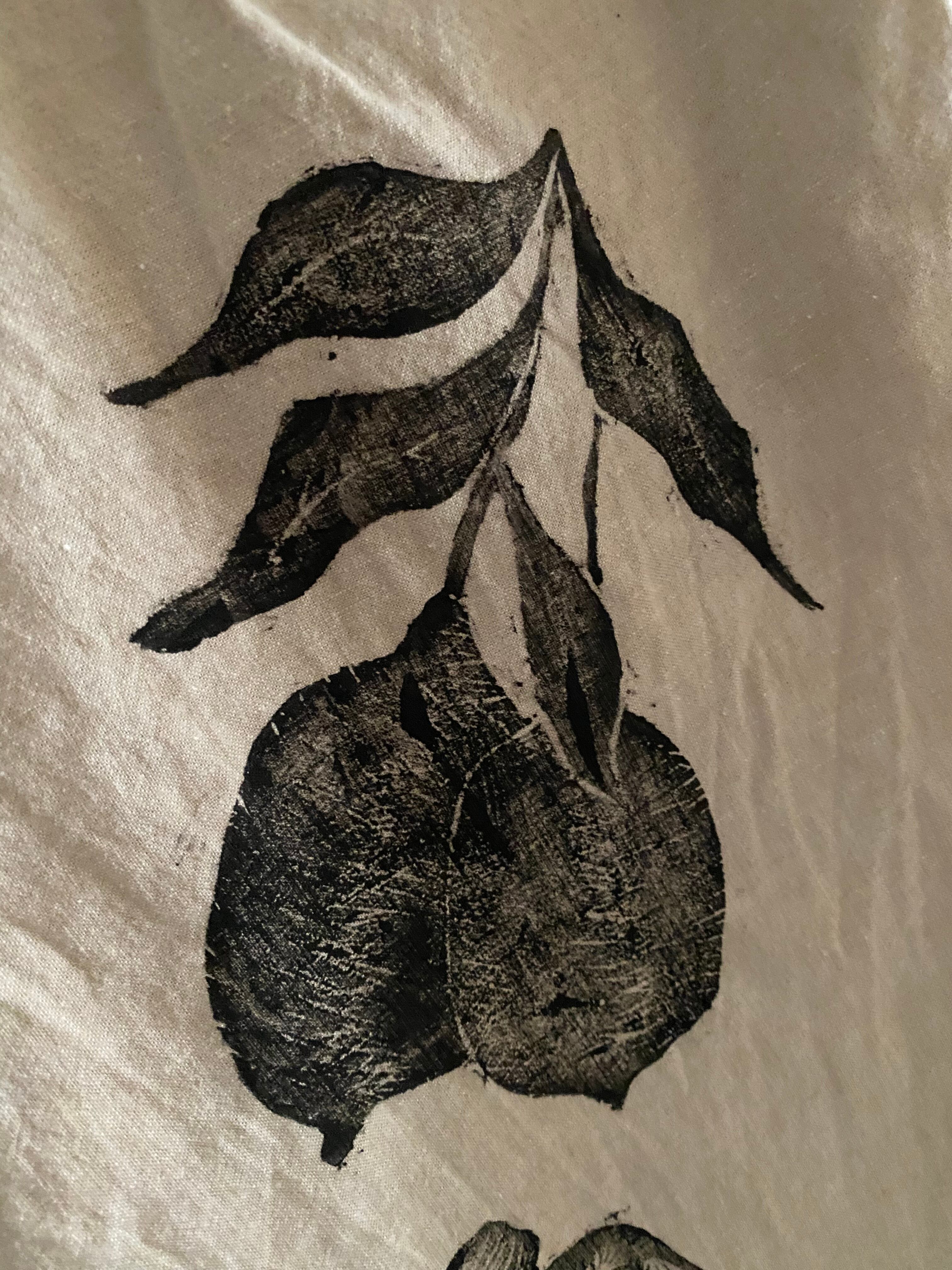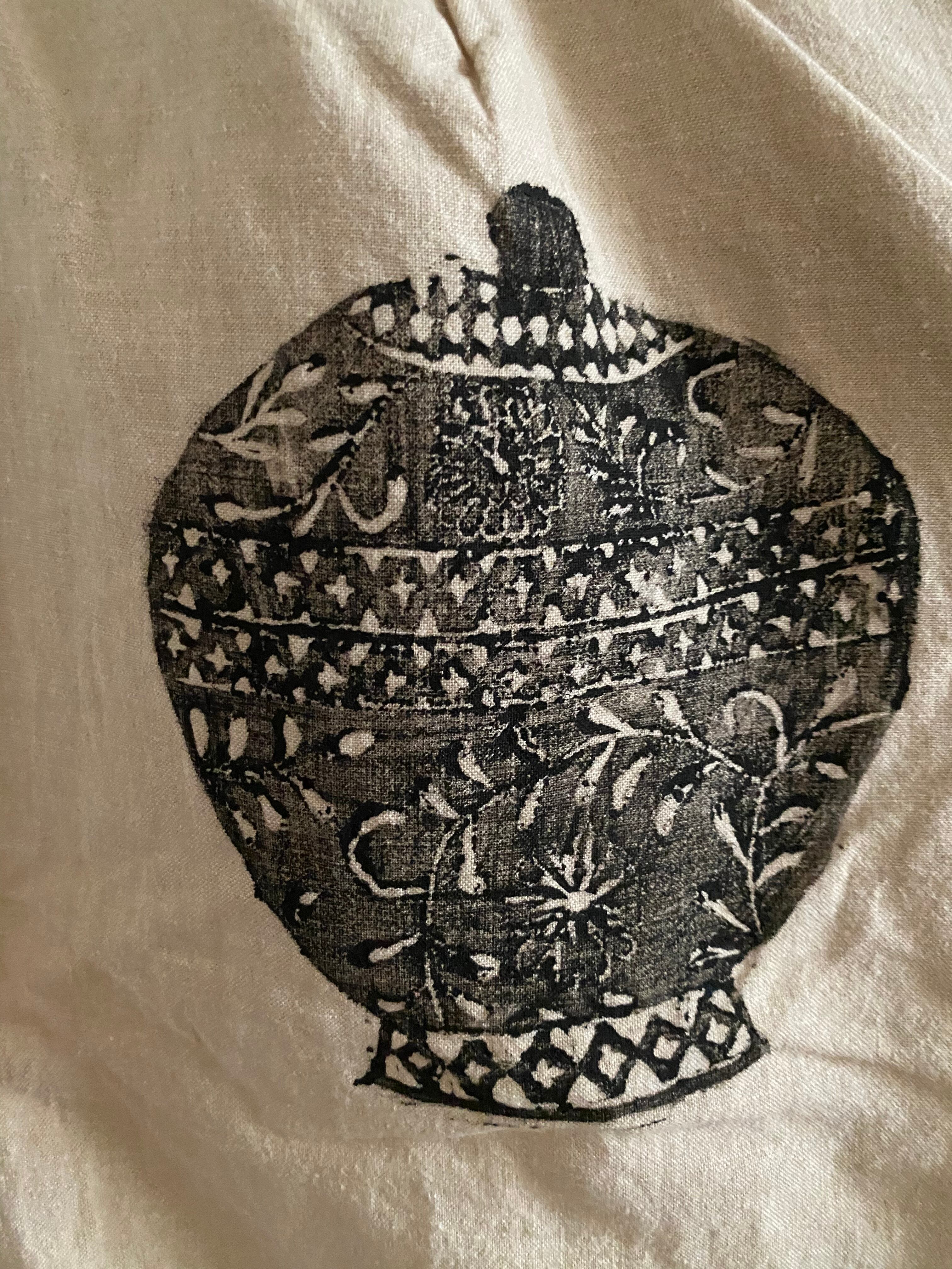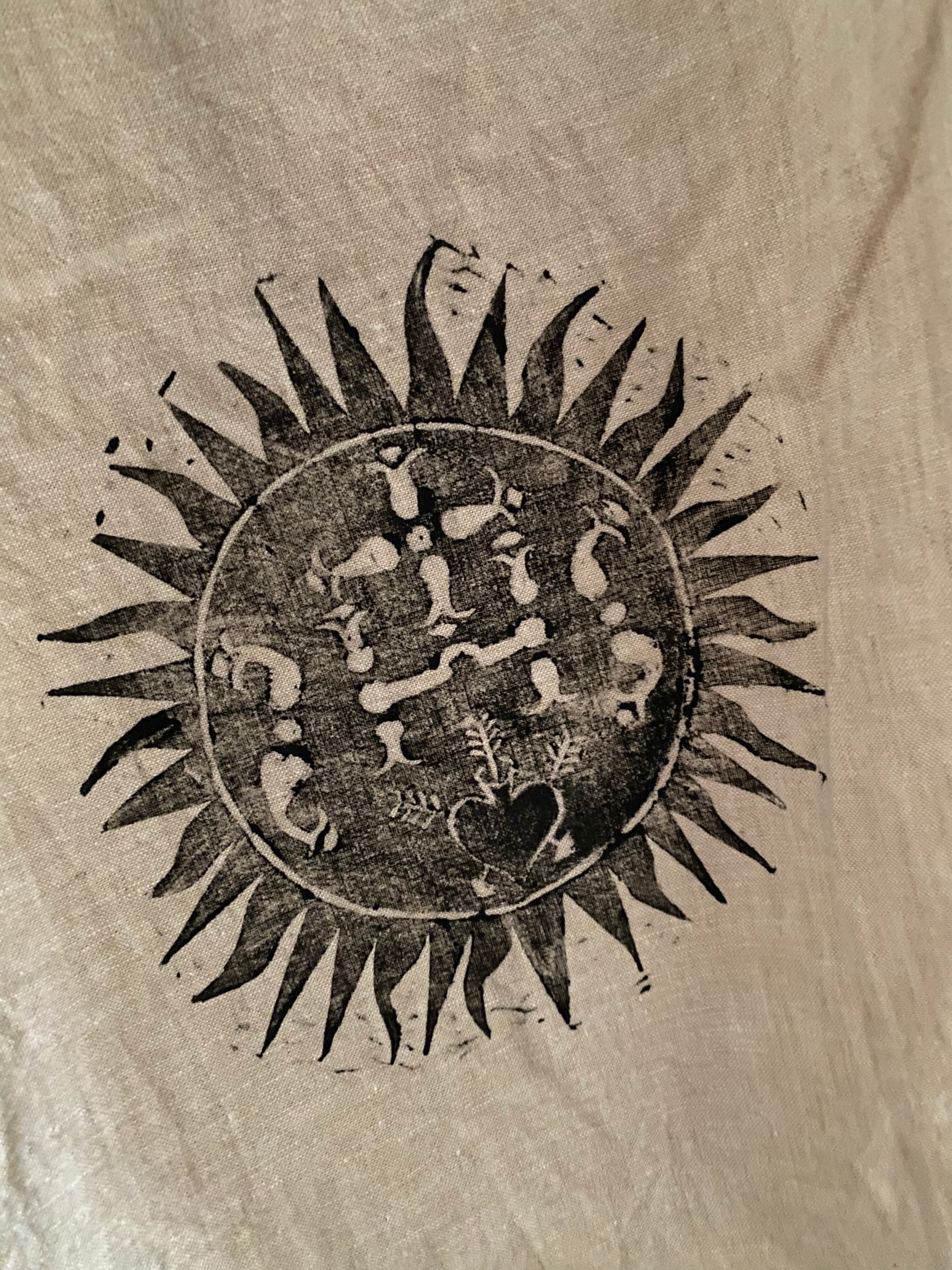 アーティストの作品で沖縄の自然や動物、ハヂチなどをコットンや麻の自然素材に一つ一つ手彫りで彫った版を専用のインクを付けて古着に版を押されてます