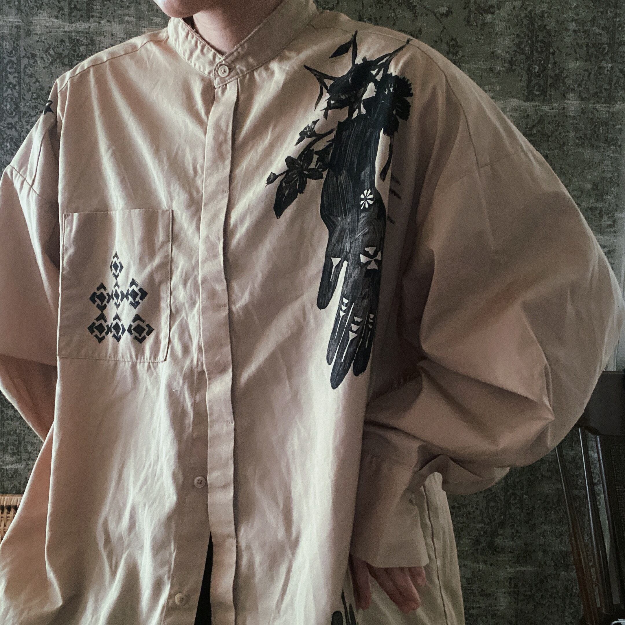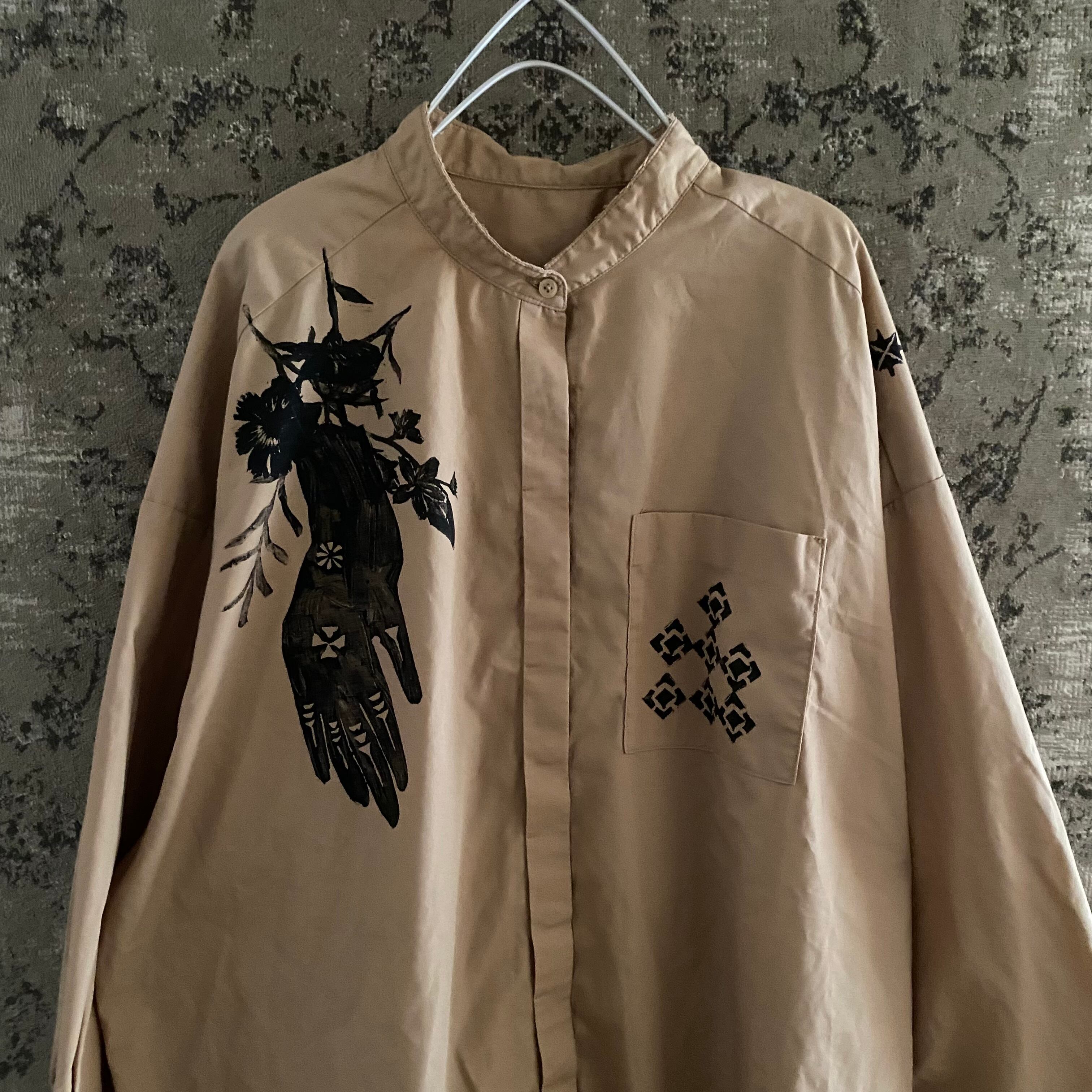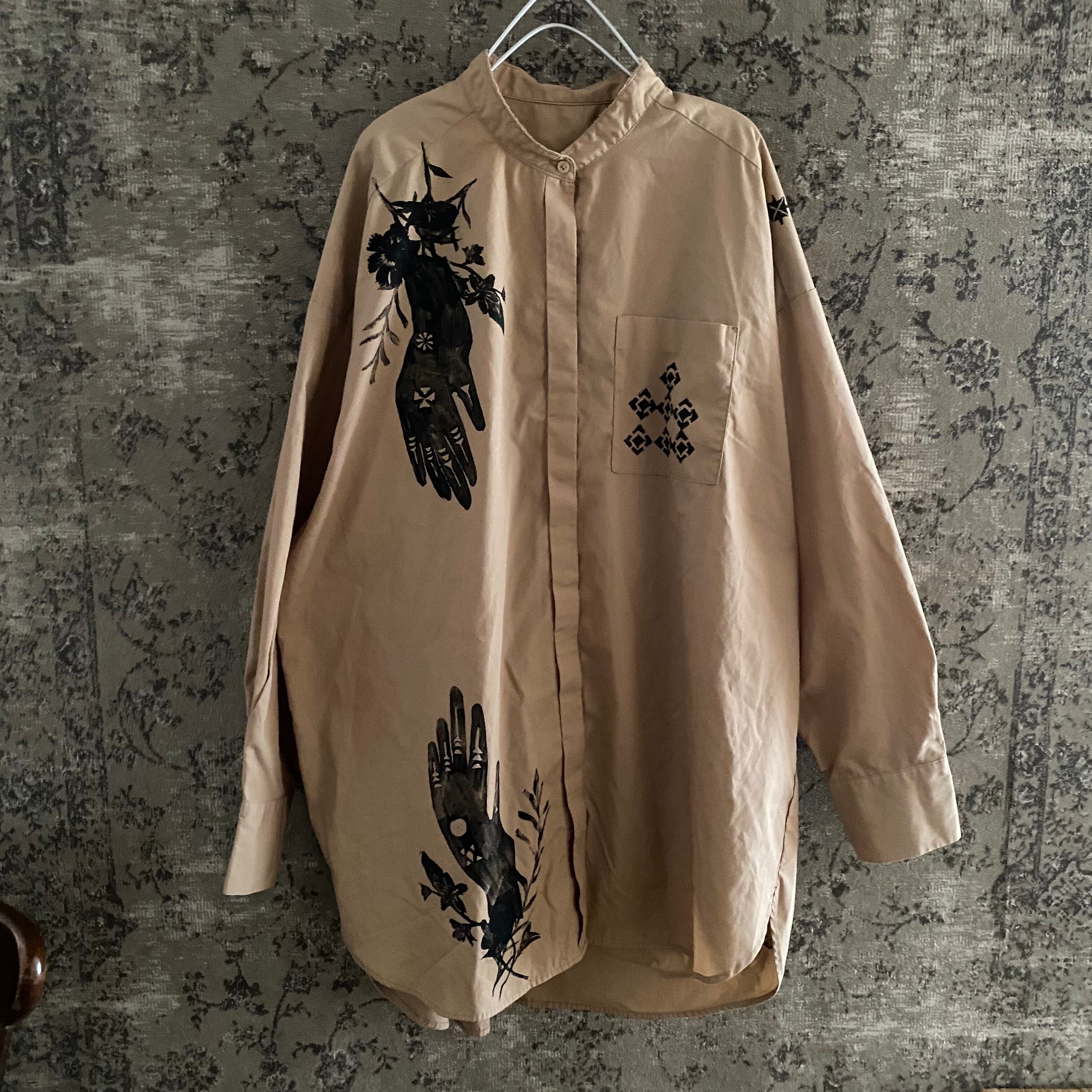 ブロックプリントシャツパフスリーブブラウスノーカラーバンドカラーコットン綿ベージュオーバーサイズ