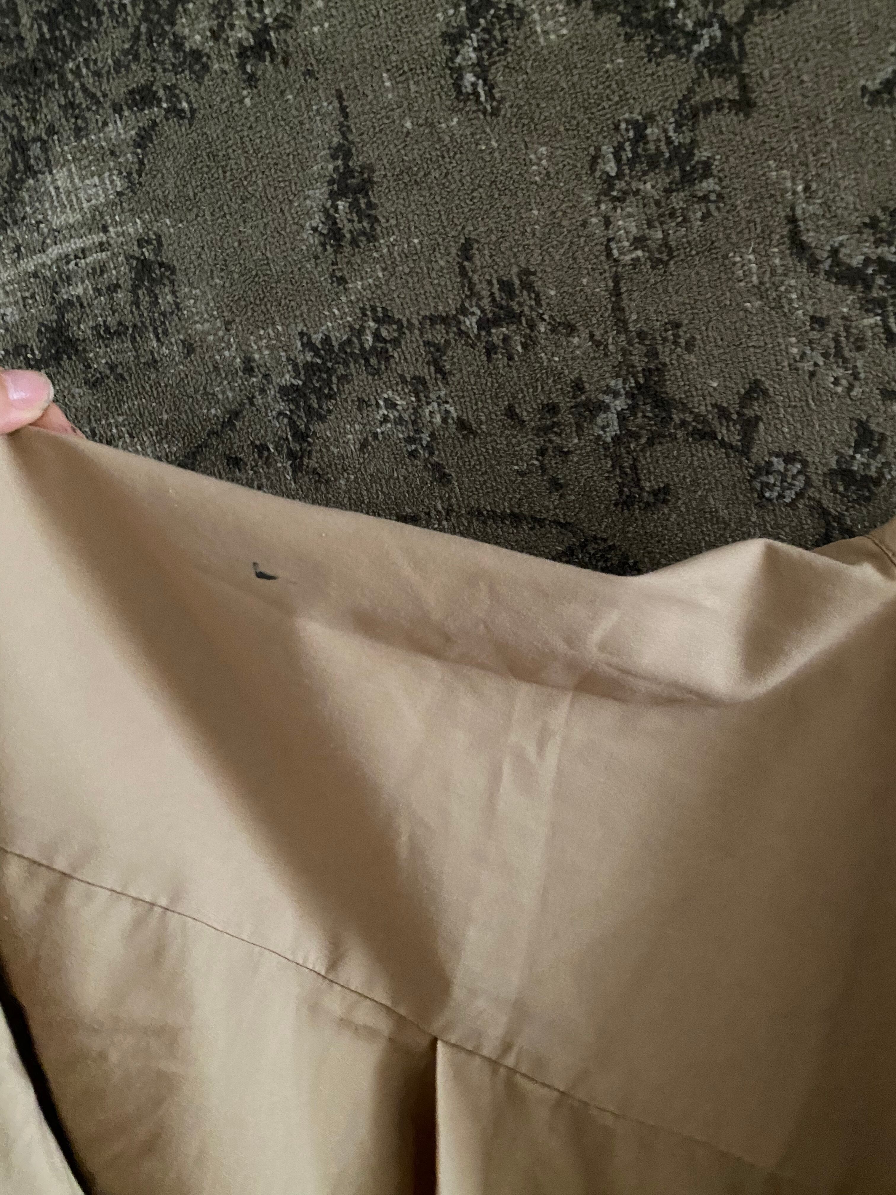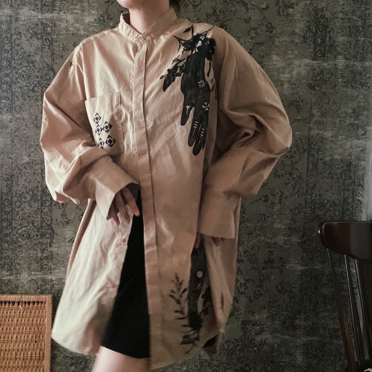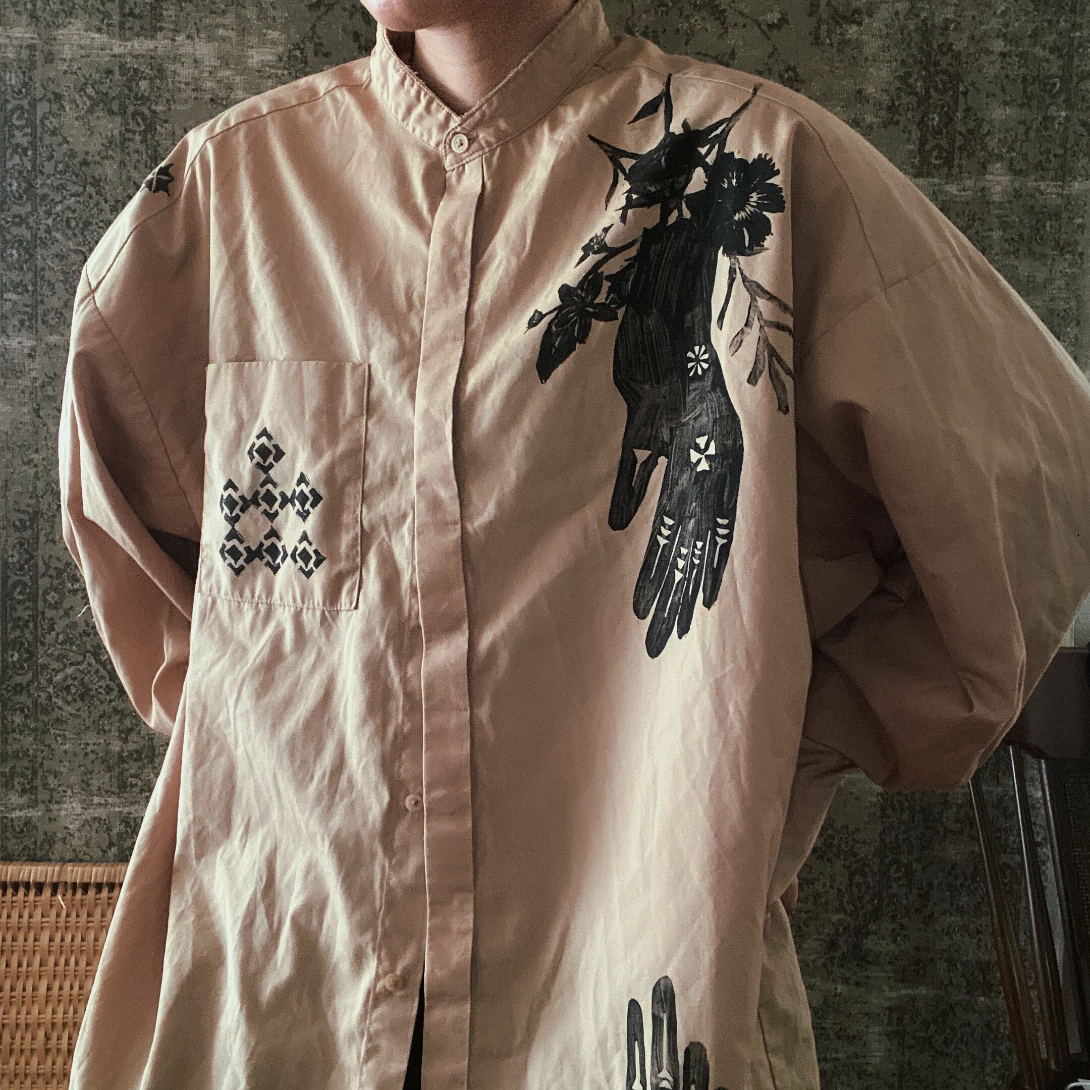 ブロックプリントシャツパフスリーブブラウスノーカラーバンドカラーコットン綿ベージュオーバーサイズ