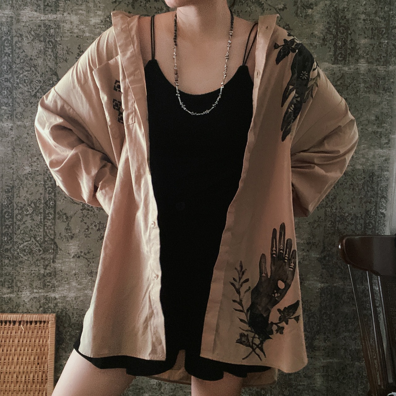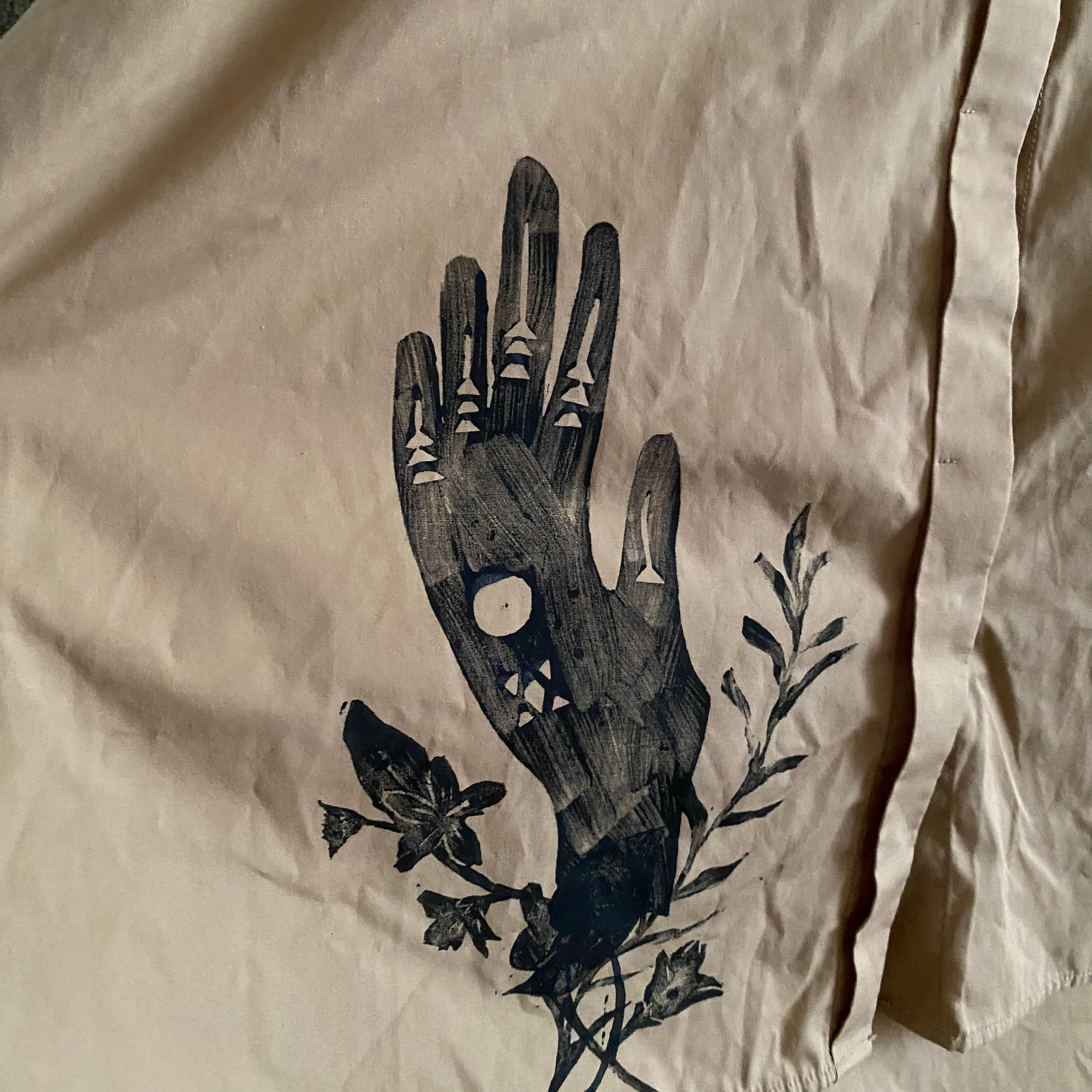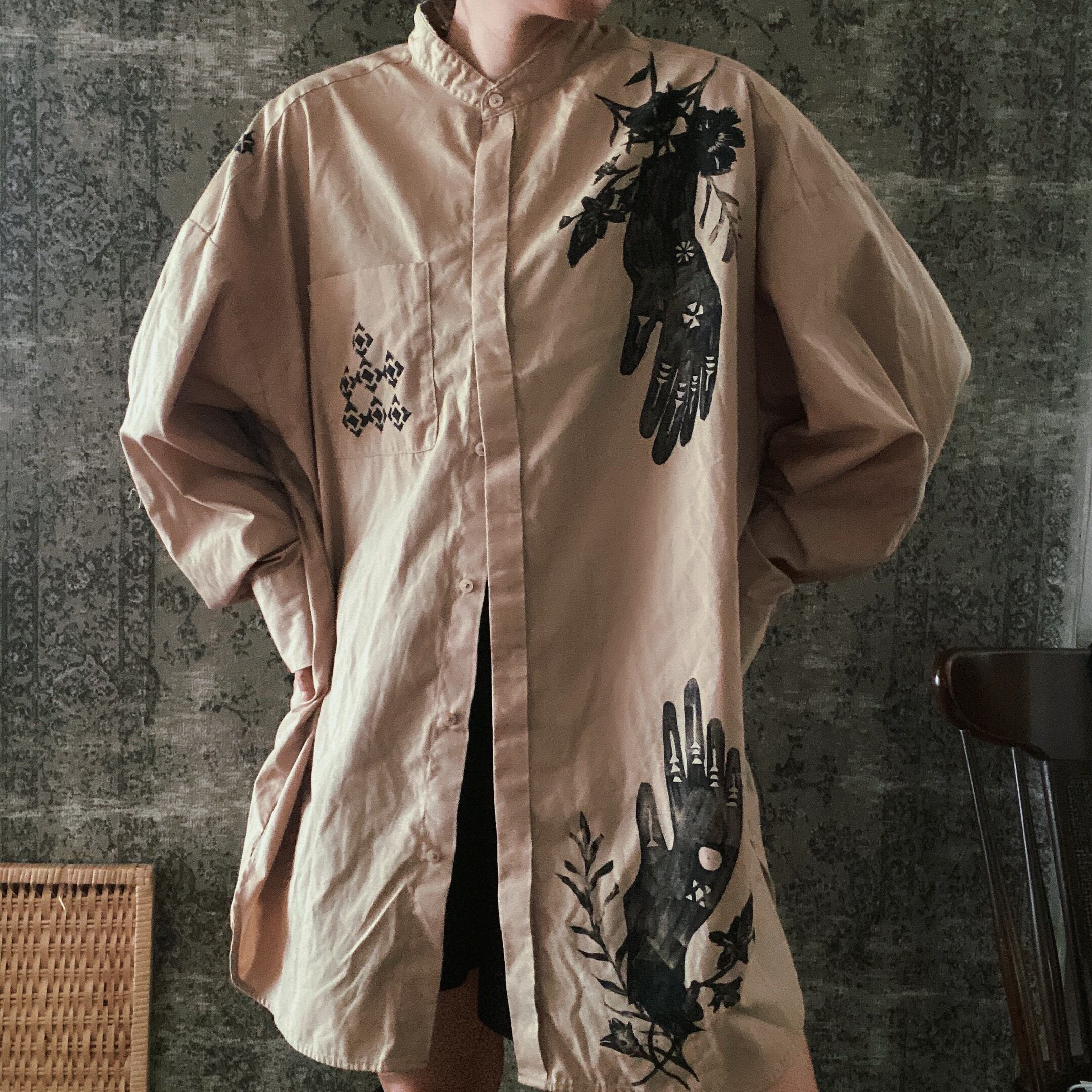 作家さんの作品で、沖縄の自然や動物、ハヂチをモチーフに版を一つ一つ丁寧に彫り、専用のインクで丁寧に古着に版を押されてます