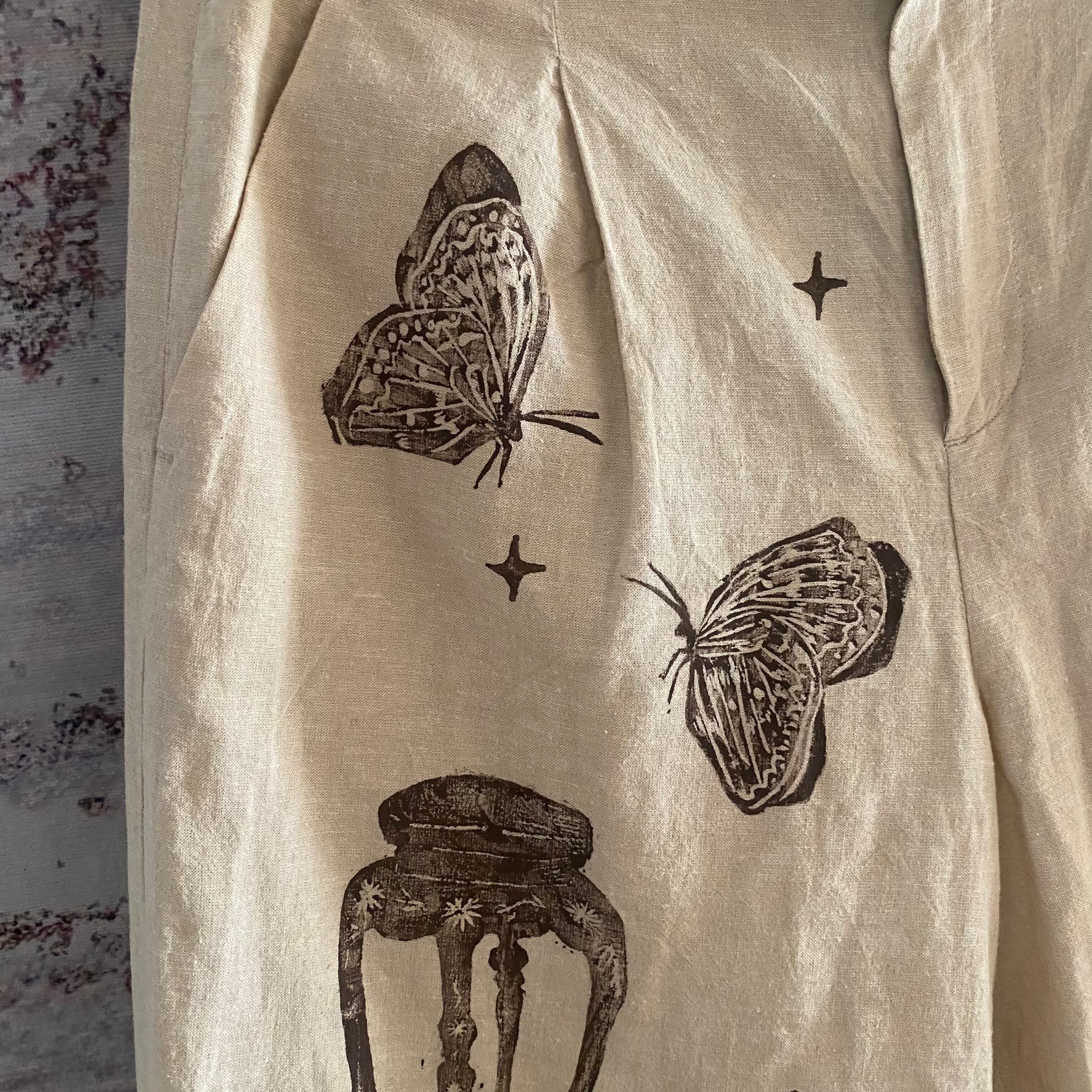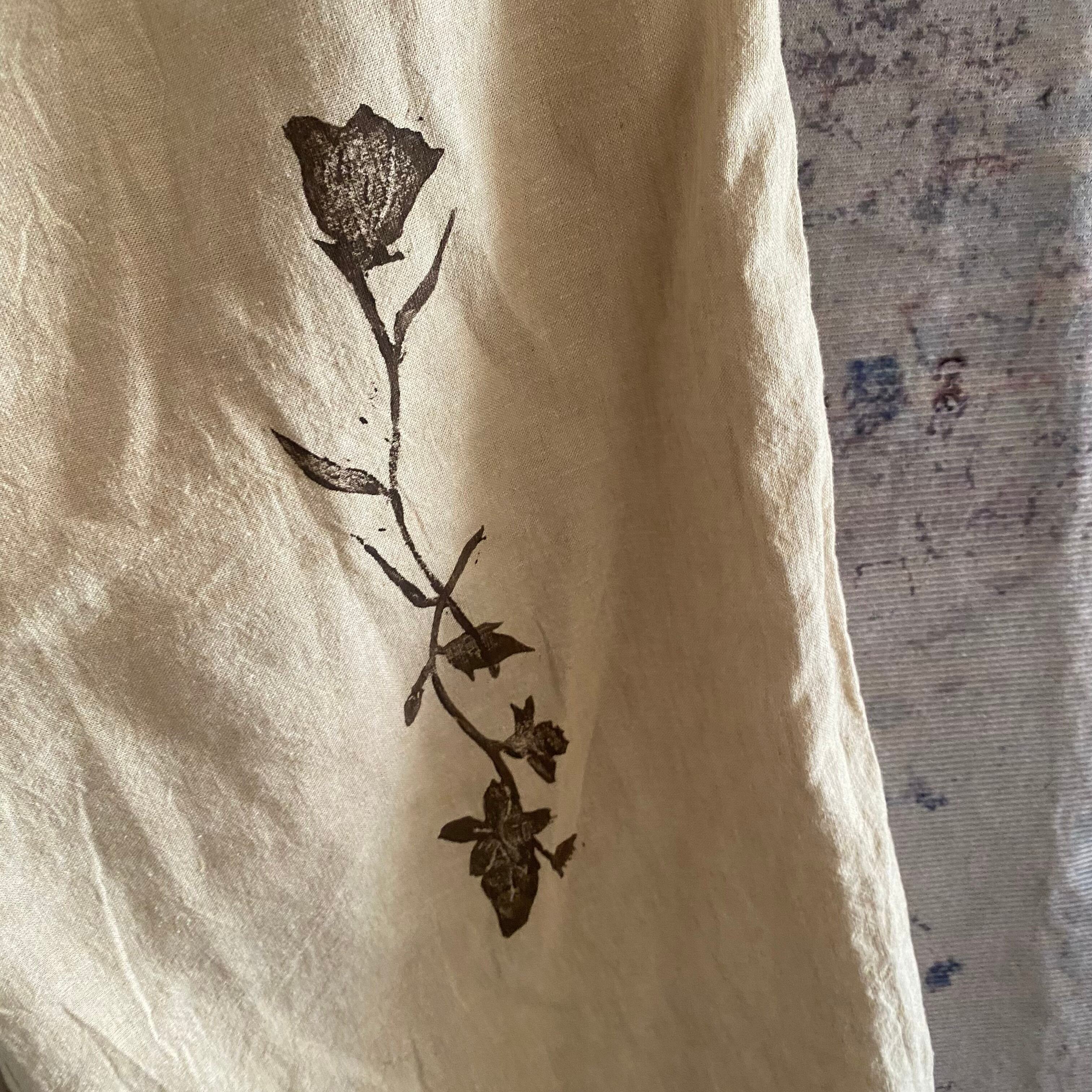 アーティストの作品で沖縄の自然や動物、ハヂチなどをコットンや麻の自然素材に一つ一つ手彫りで彫った版を専用のインクを付けて古着に版を押されてます