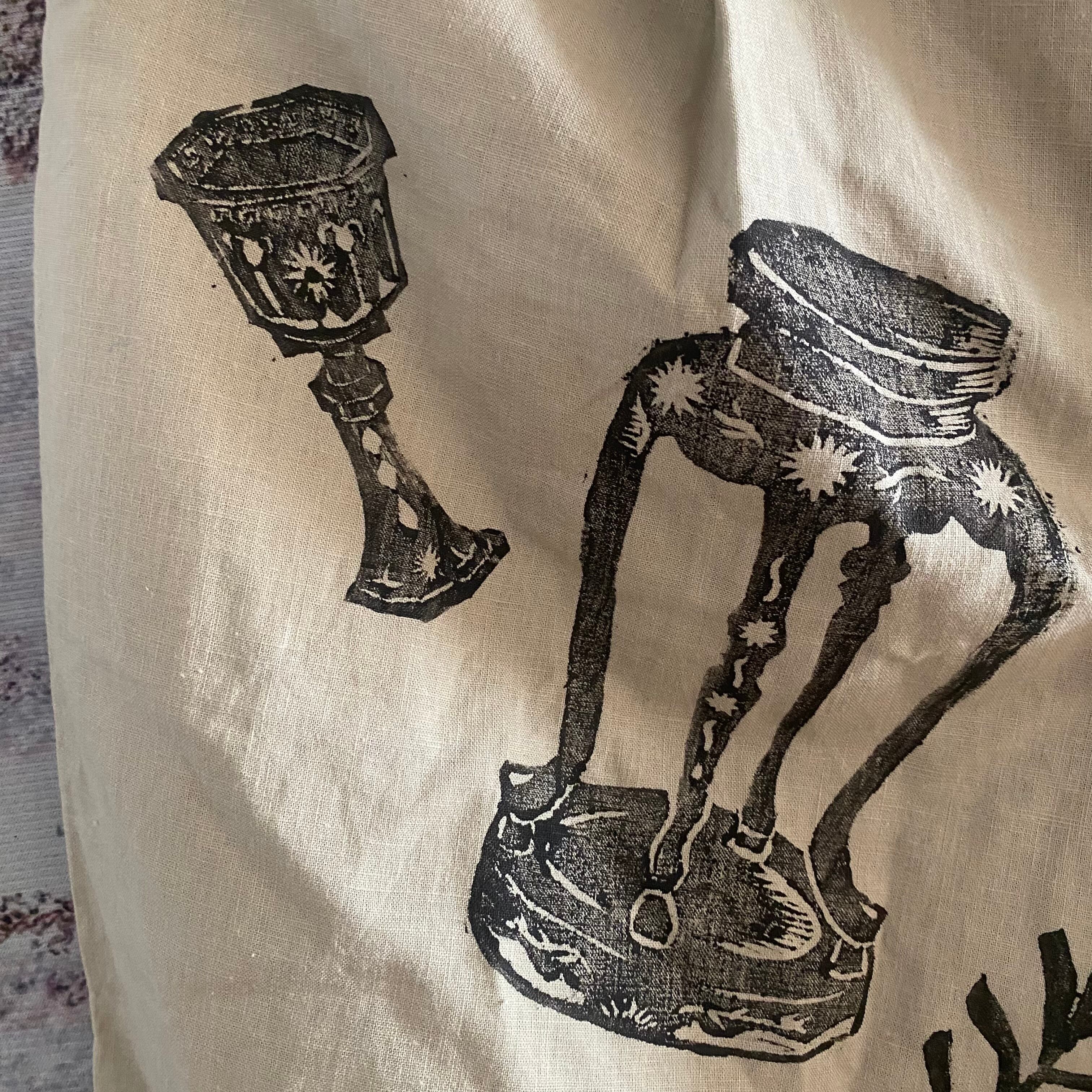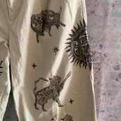 アーティストの作品で沖縄の自然や動物、ハヂチなどをコットンや麻の自然素材に一つ一つ手彫りで彫った版を専用のインクを付けて古着に版を押されてます
