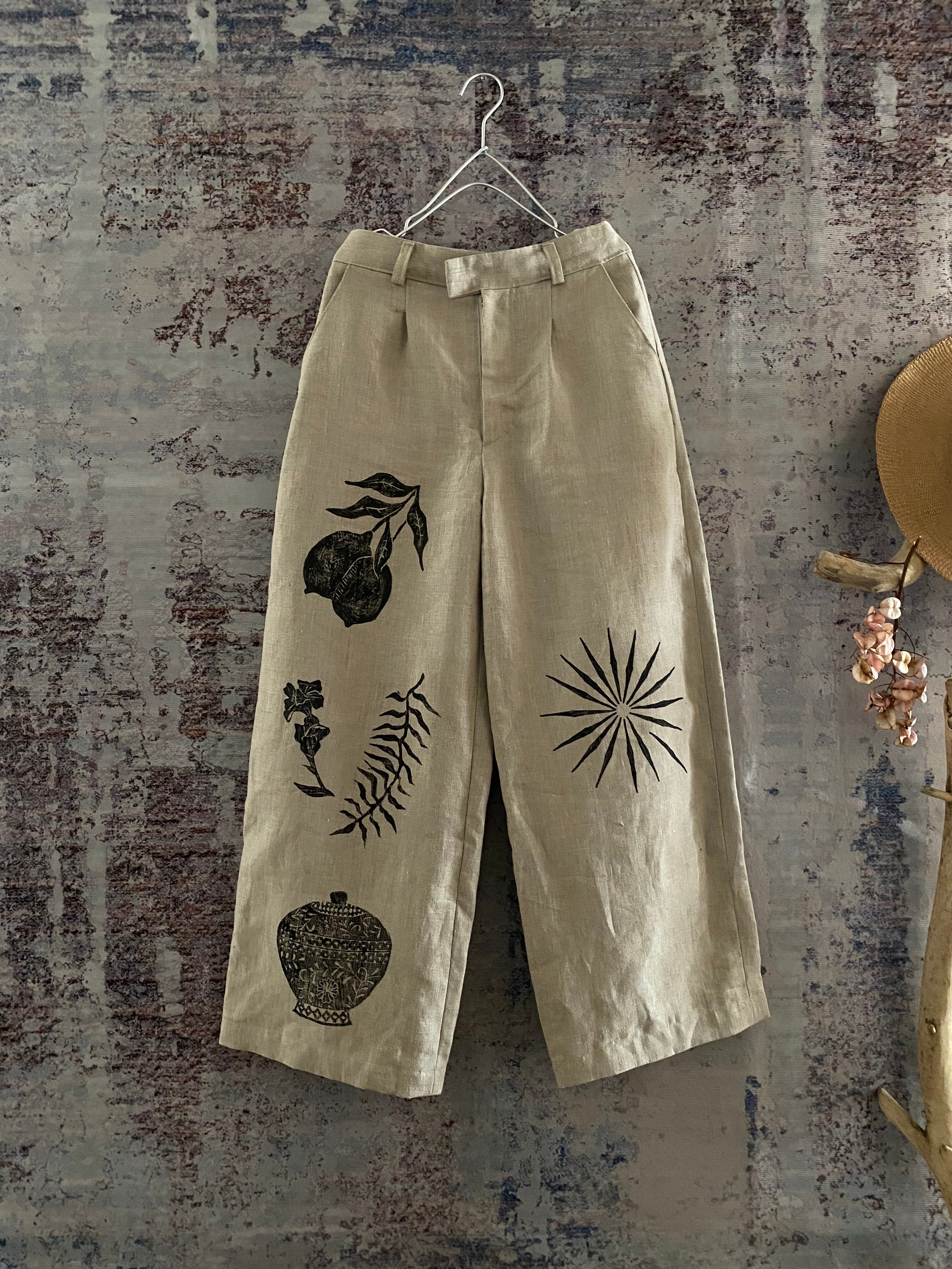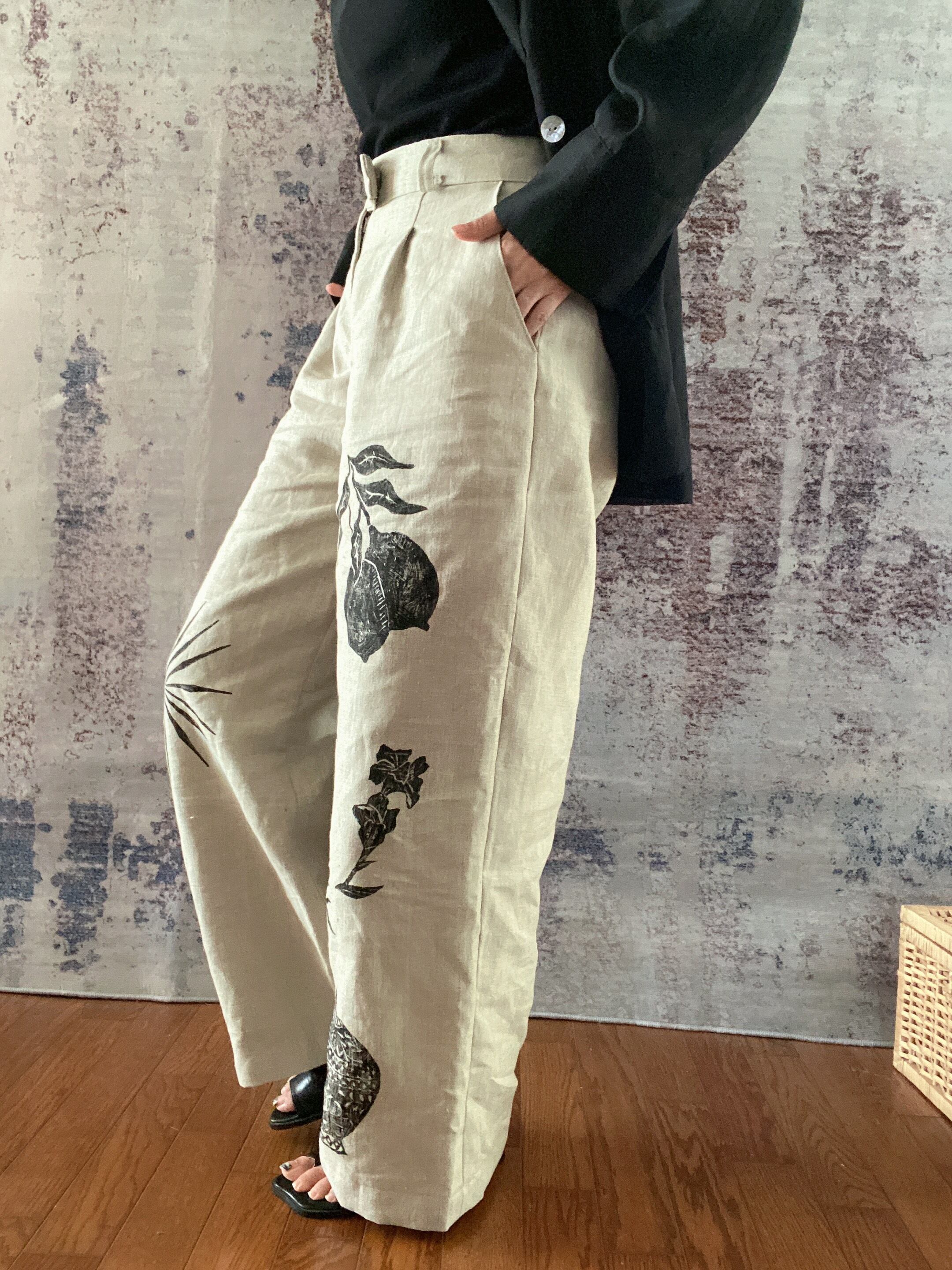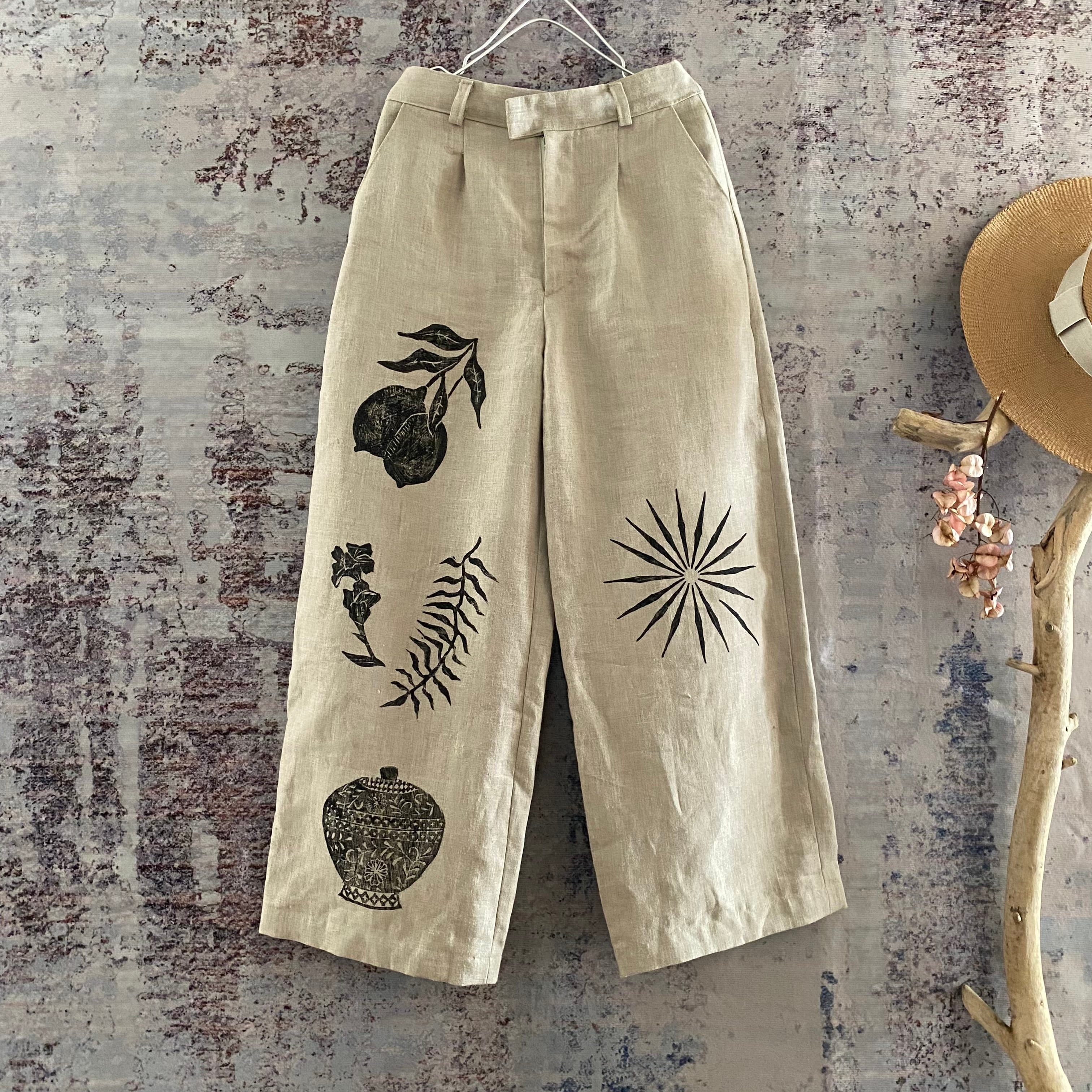 リネン麻ワイドパンツブロックプリントハンドメイドリメイクレモン花柄月星