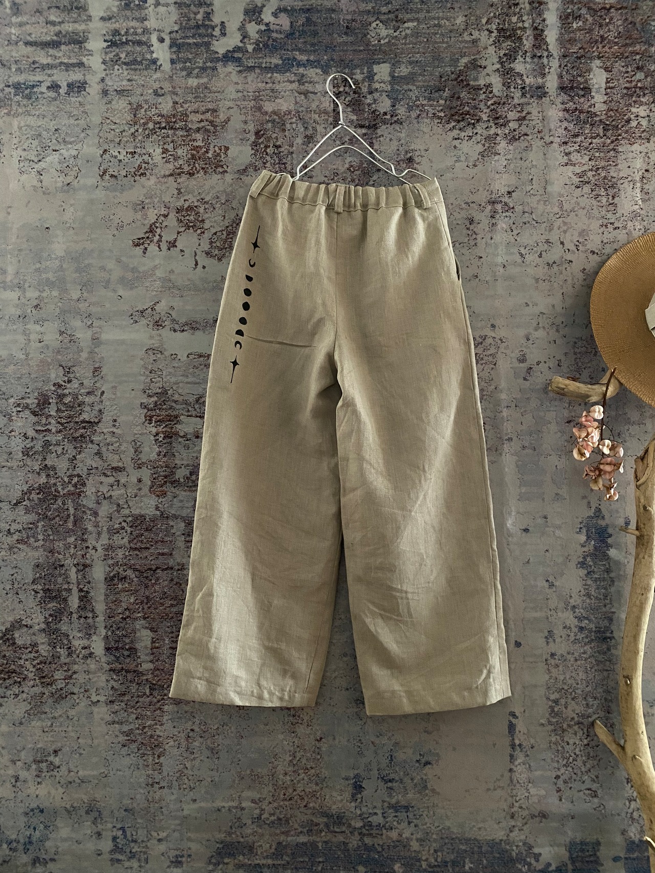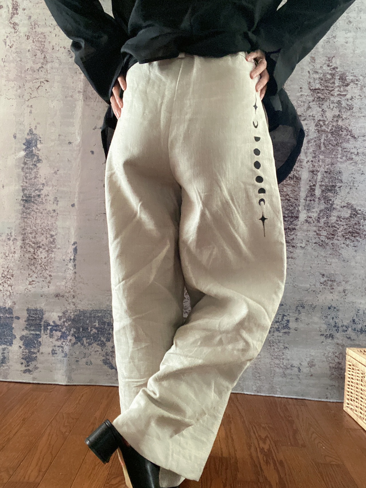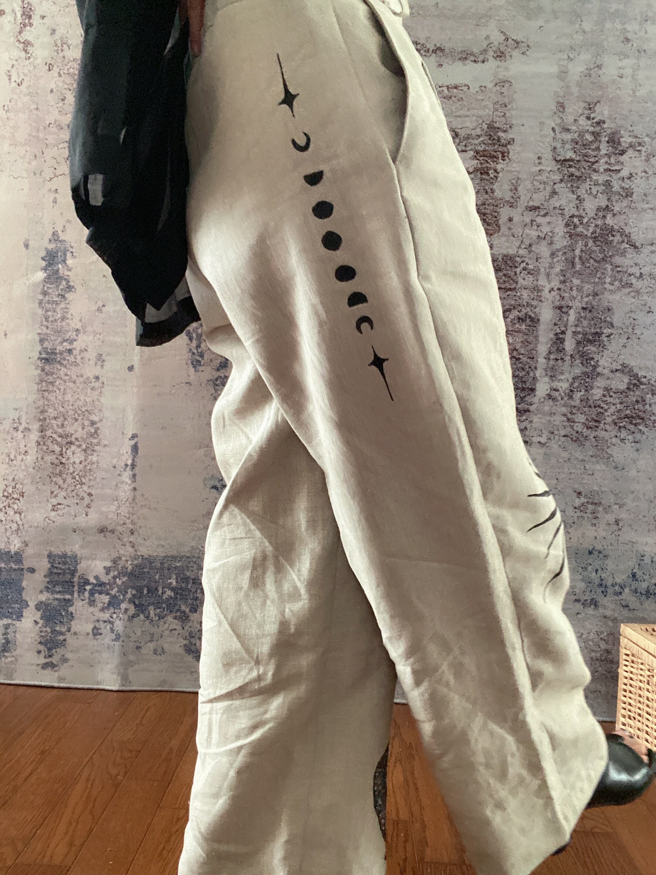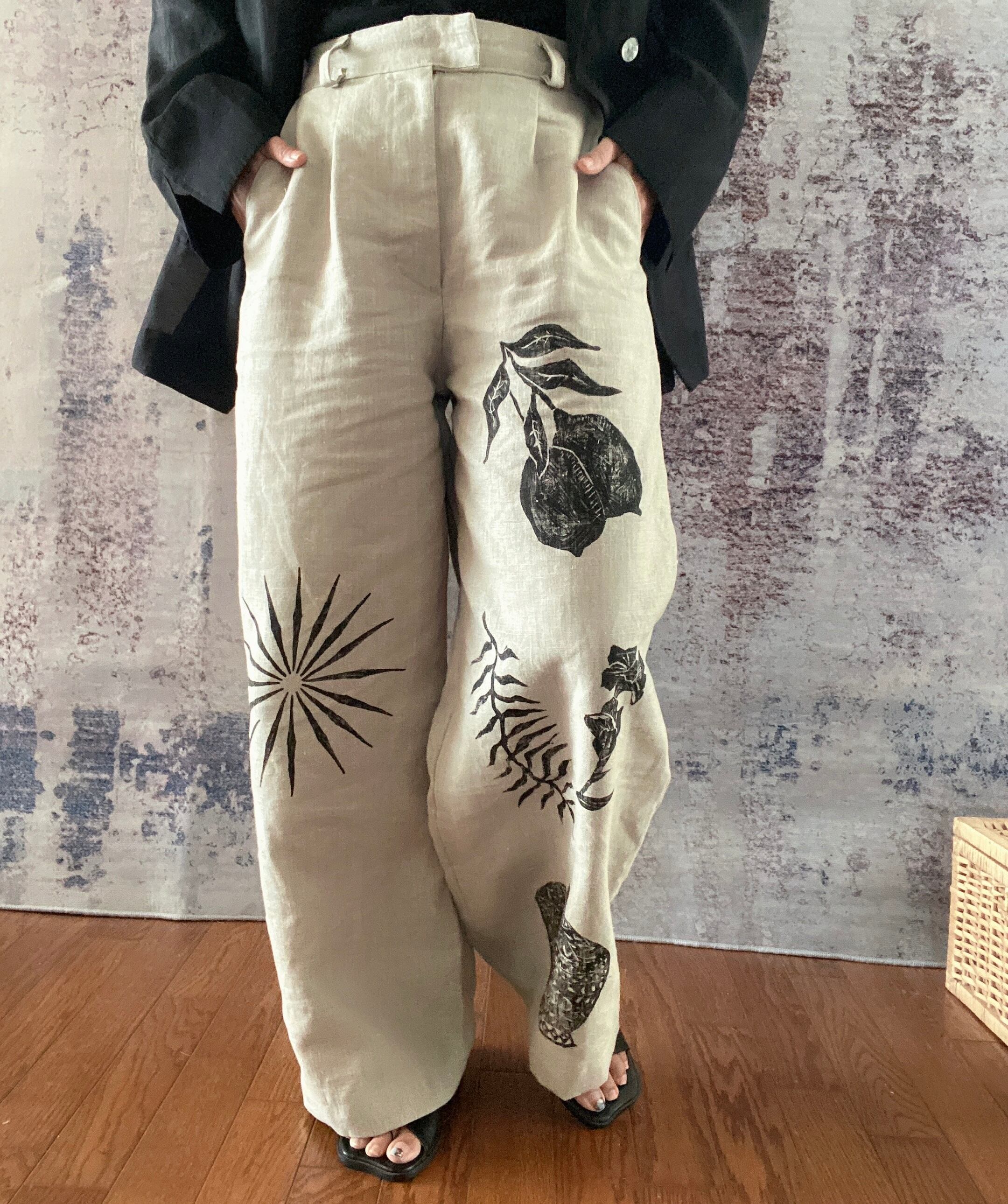 リネン麻ワイドパンツブロックプリントハンドメイドリメイクレモン花柄月星