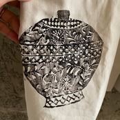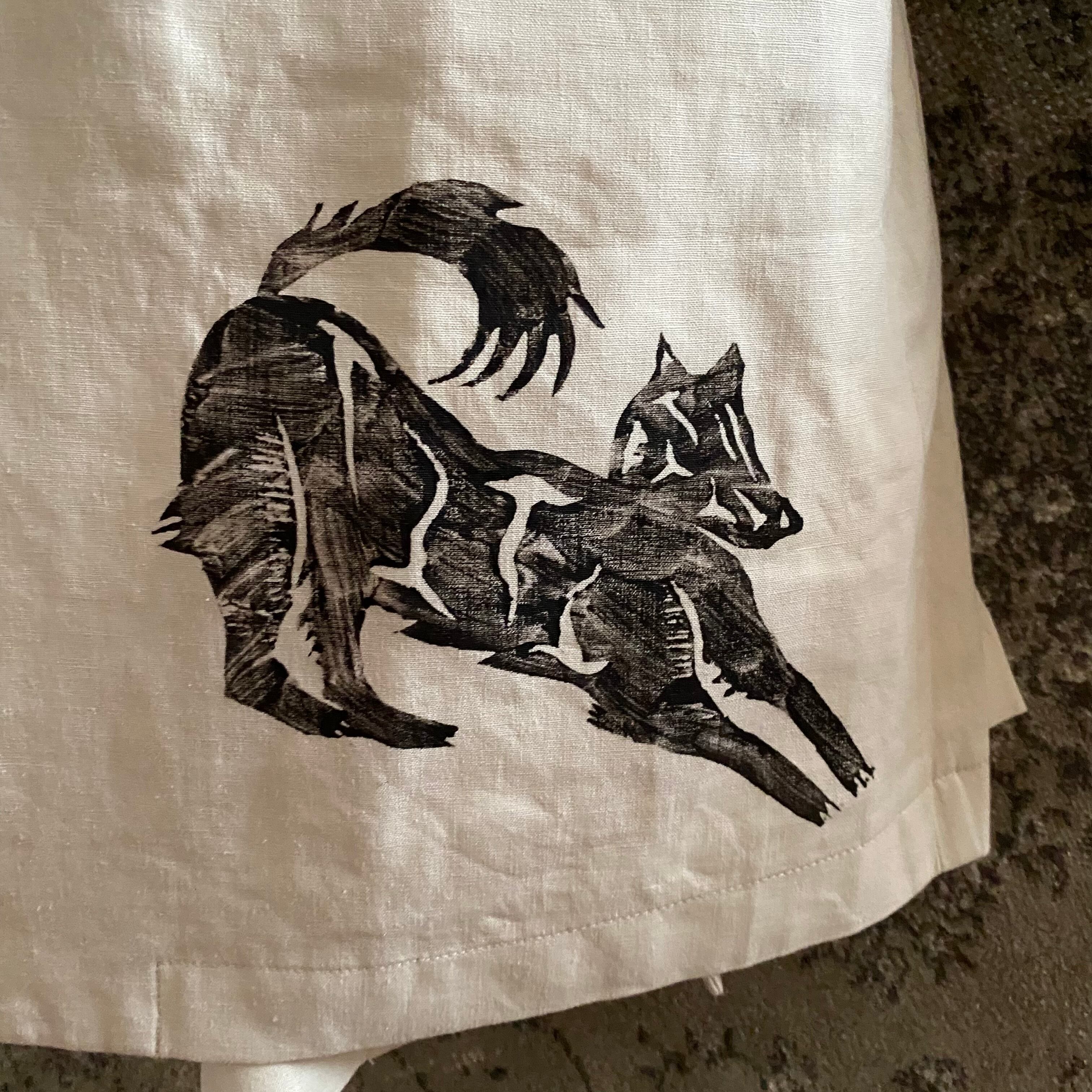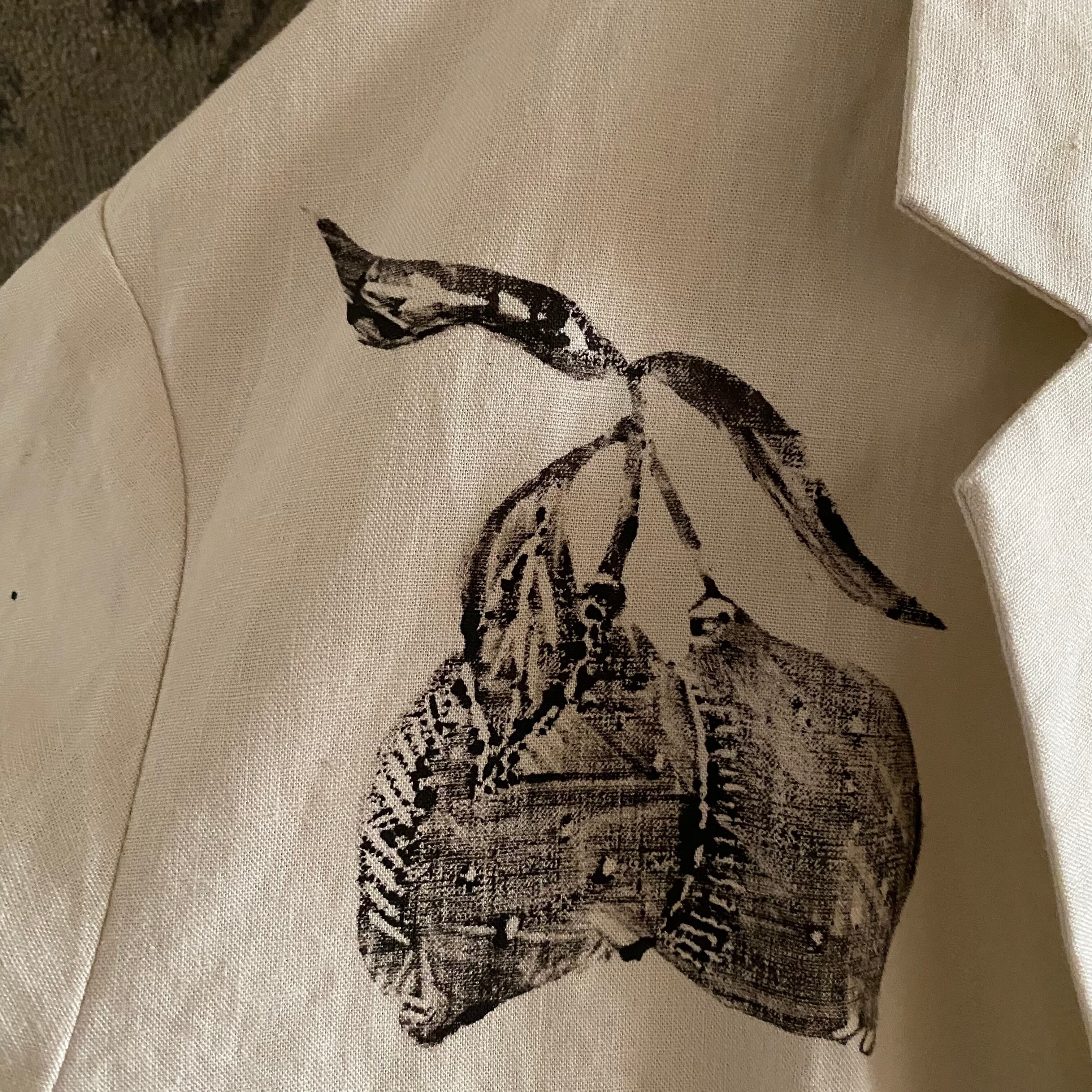 作家さんの作品で、沖縄の自然や動物、ハヂチをモチーフに版を一つ一つ丁寧に彫り、専用のインクで丁寧に古着に版を押されてます