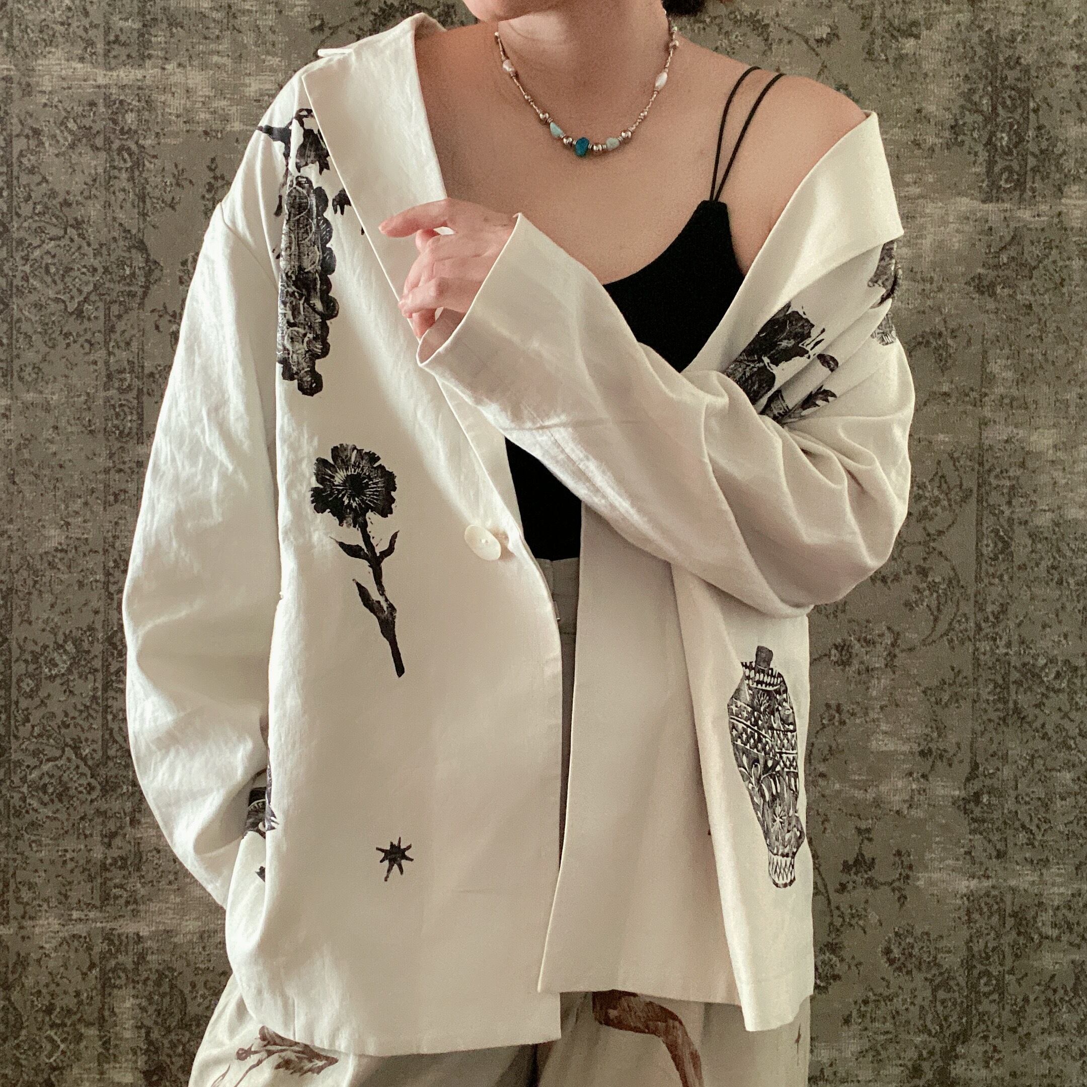 コットン綿リネン麻花柄ハンドメイドリメイク古着ジャケットシャツ ブロックプリント